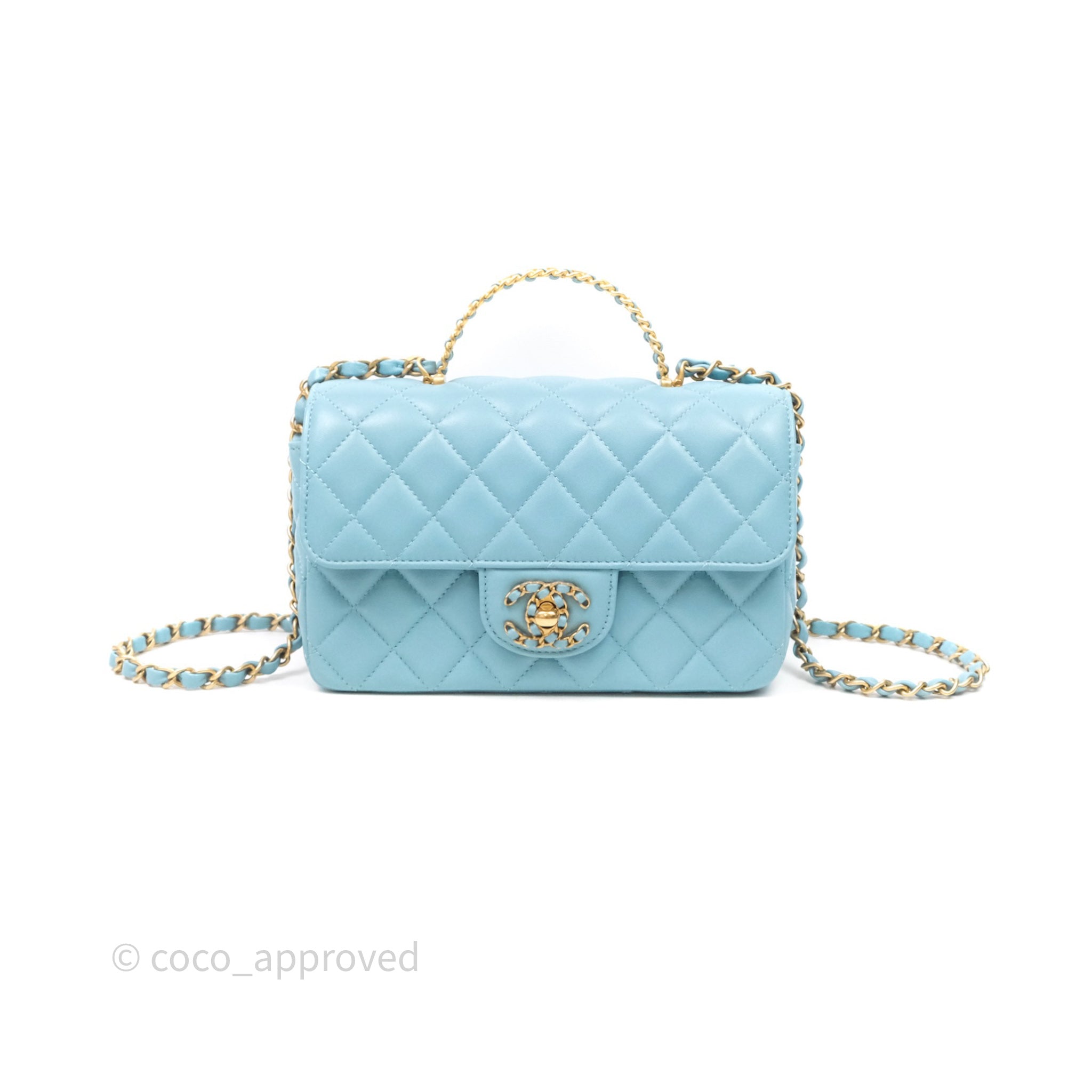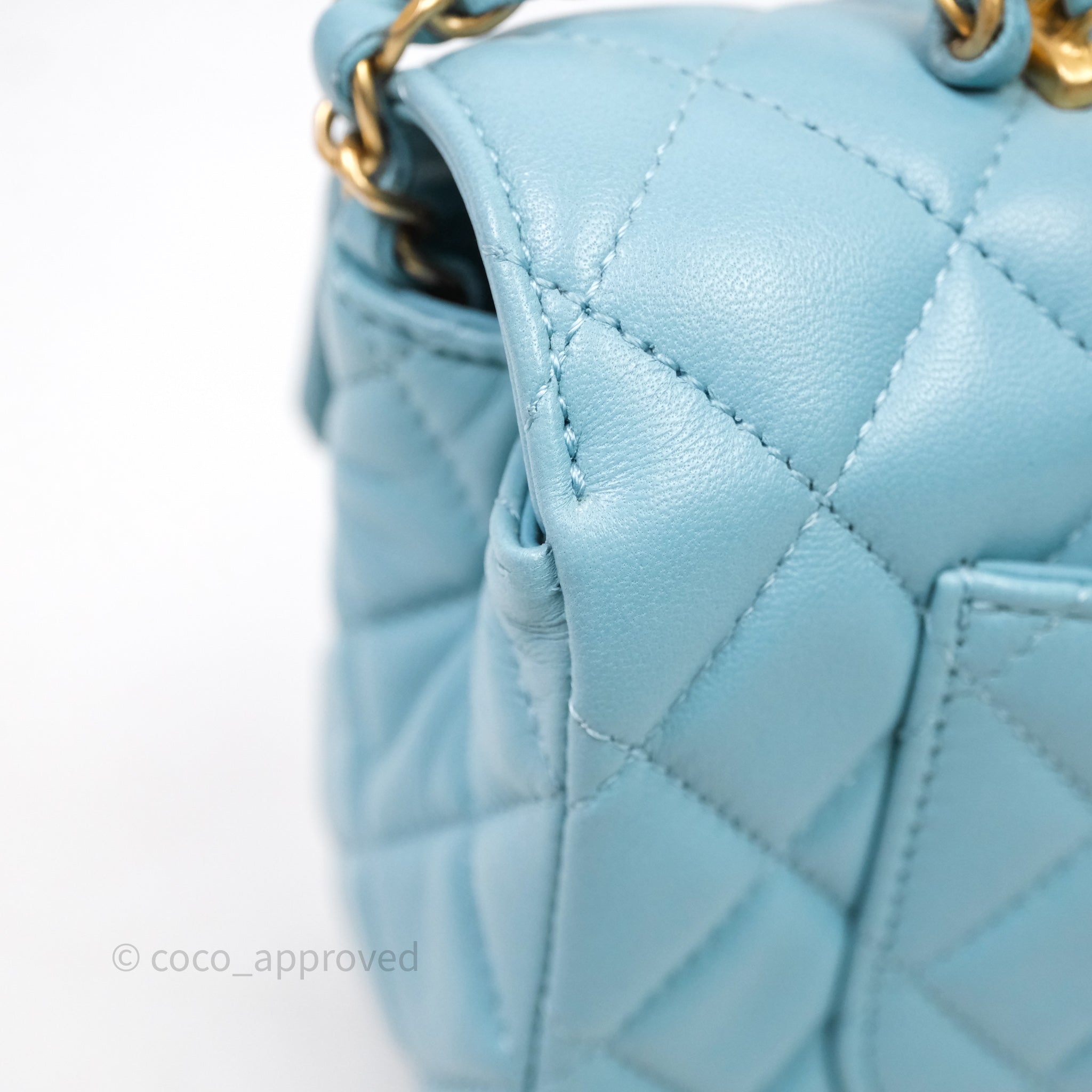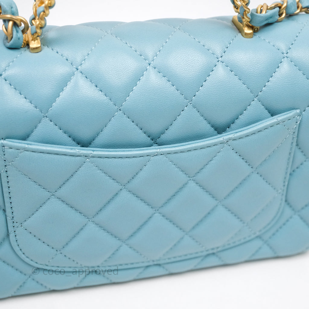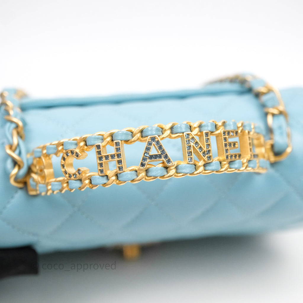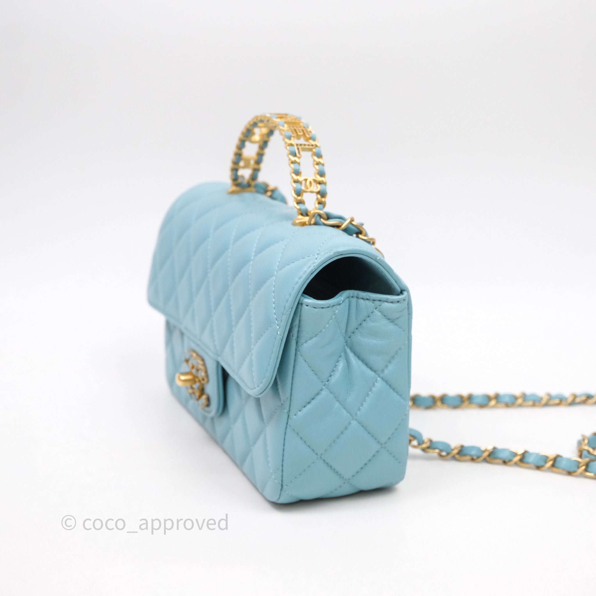 Chanel Flap Bag with Crystal Logo Top Handle Tiffany Blue Lambskin Aged Gold Hardware
