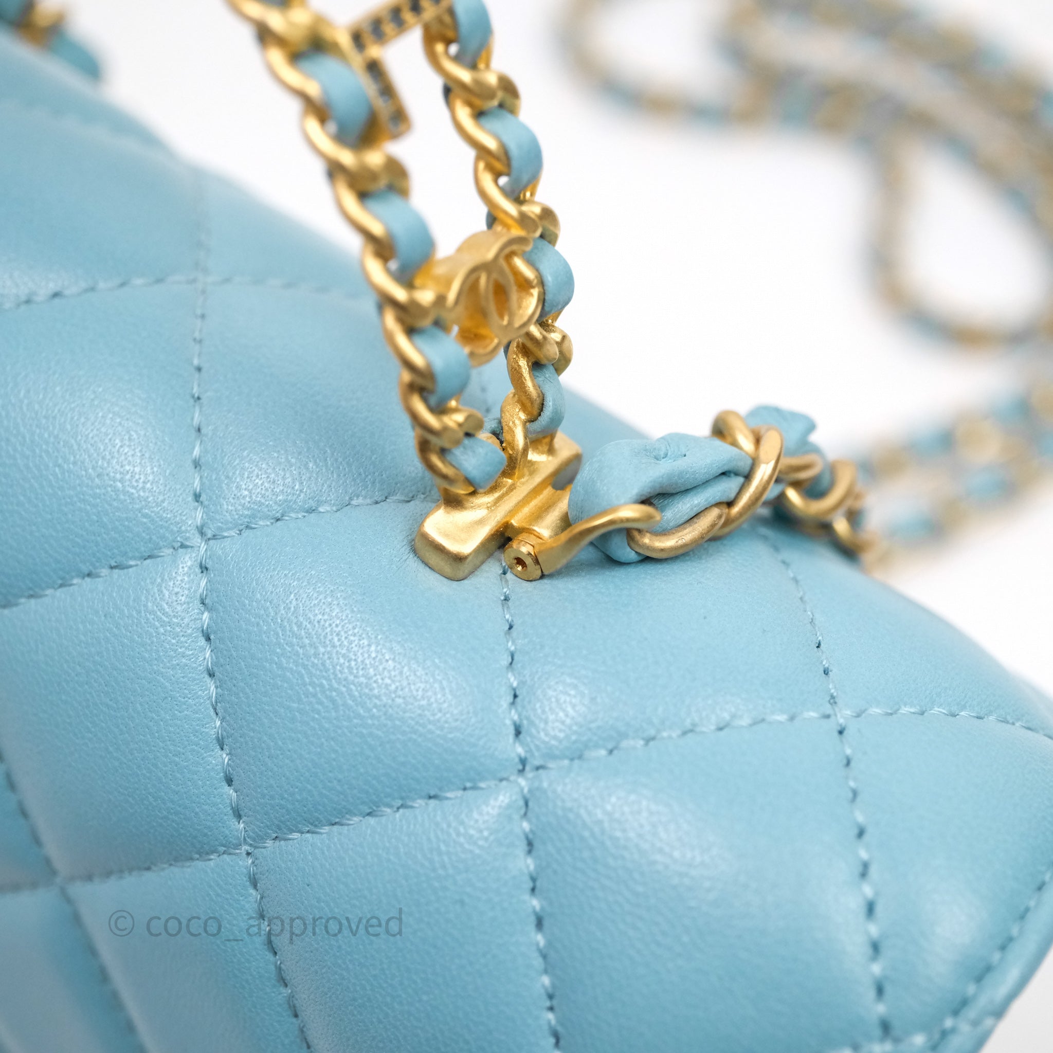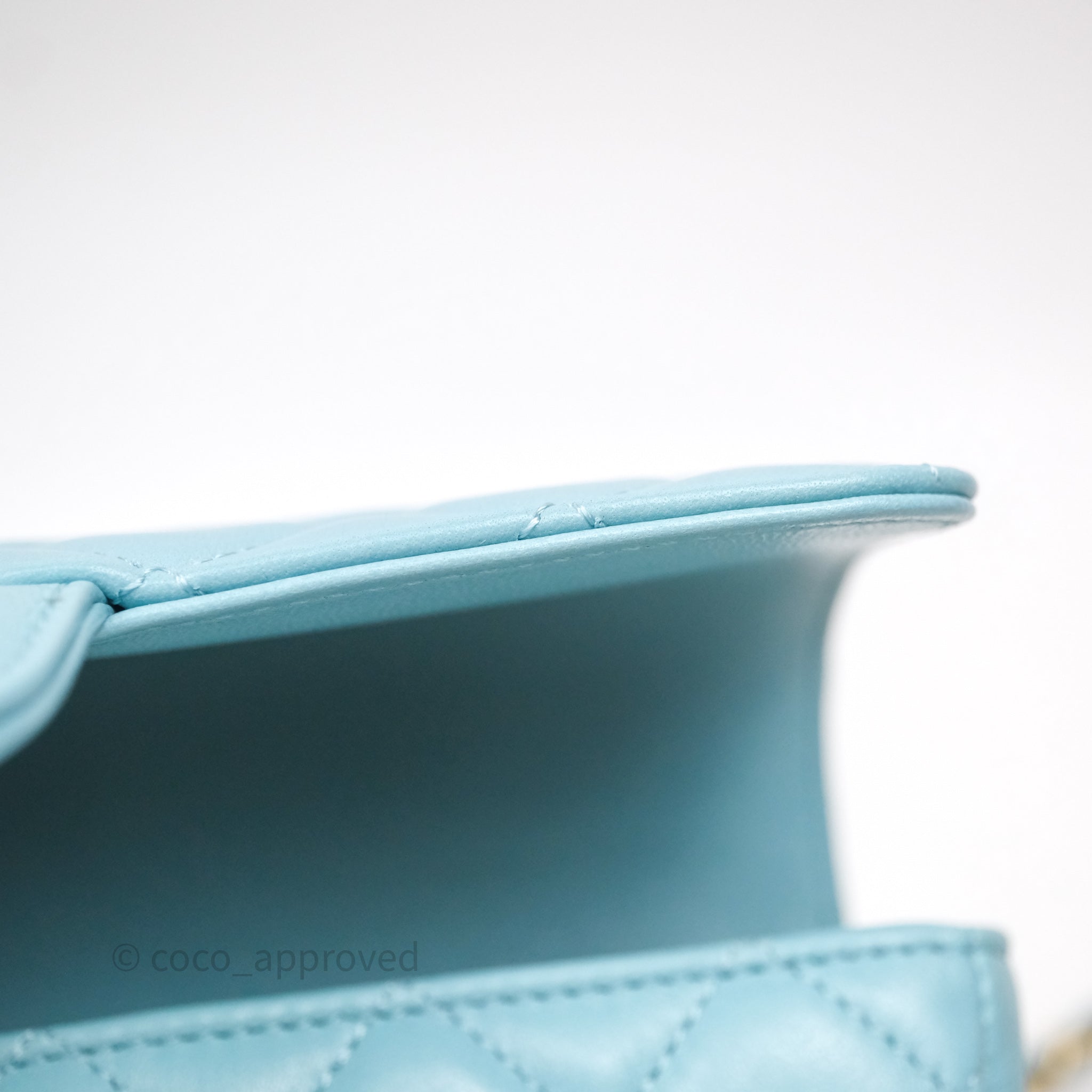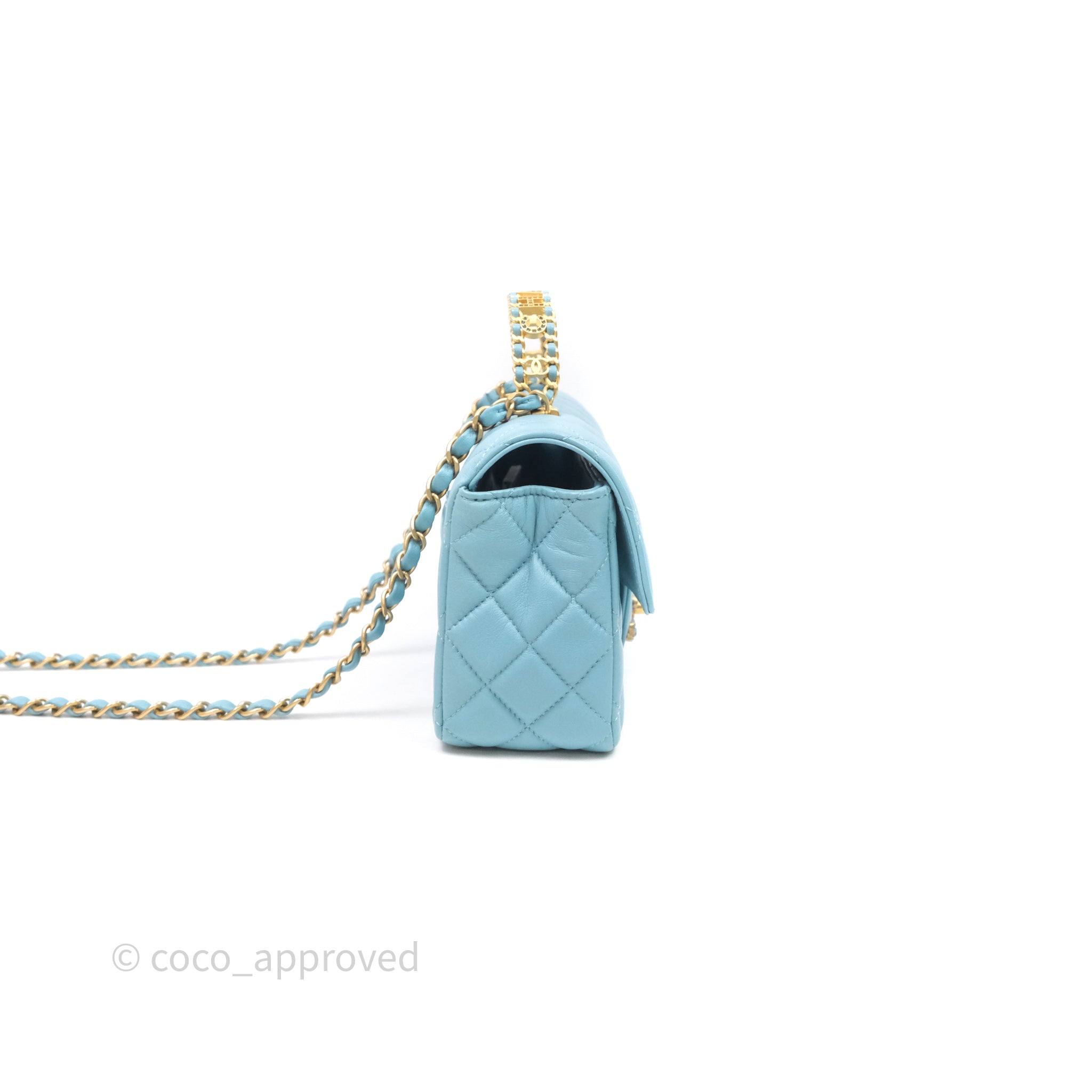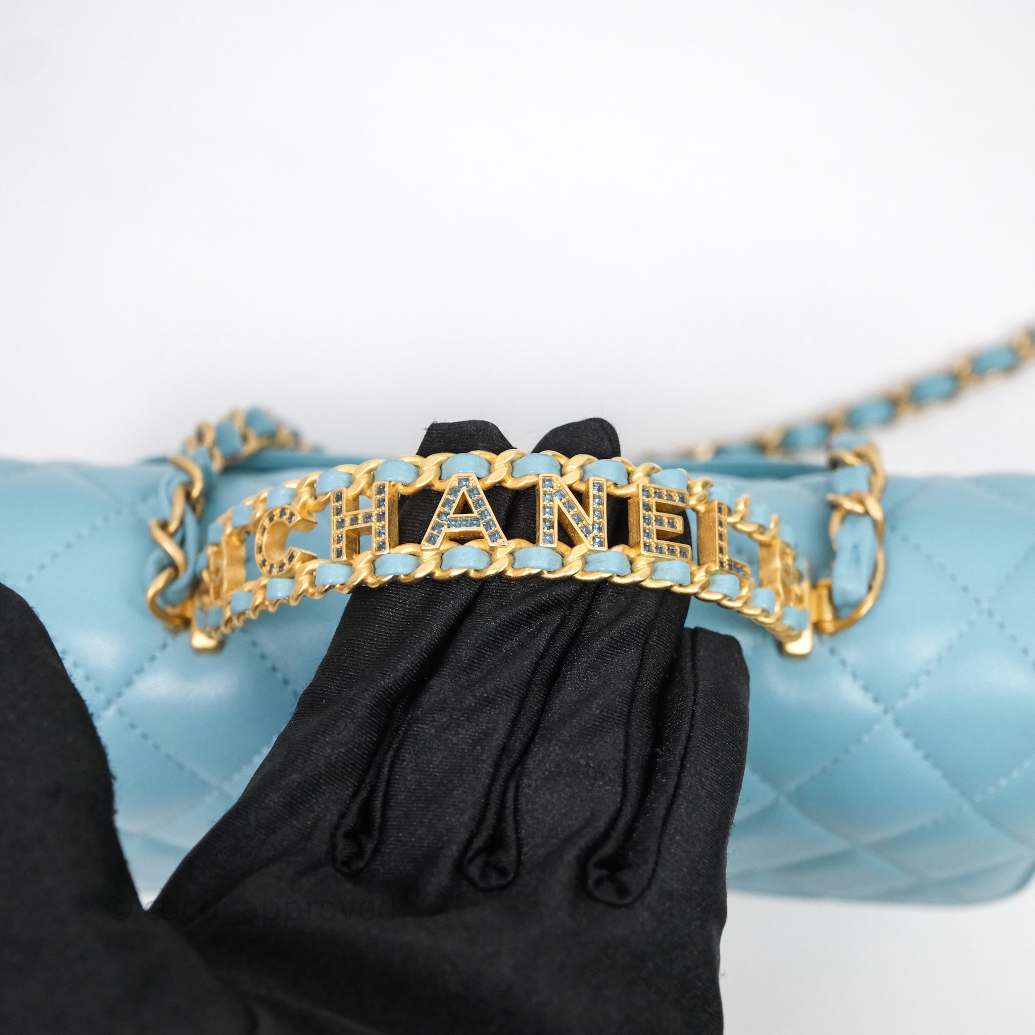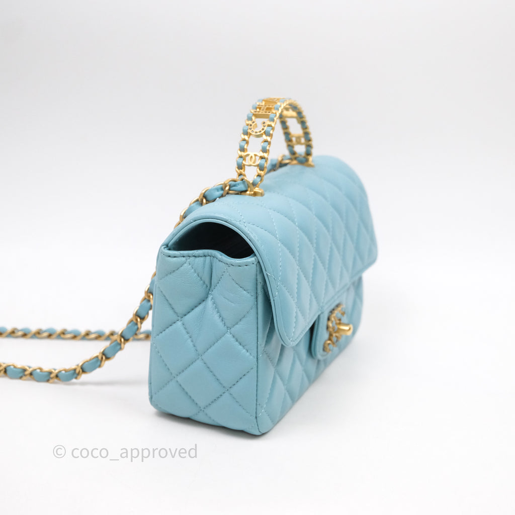 Chanel Flap Bag with Crystal Logo Top Handle Tiffany Blue Lambskin Aged Gold Hardware
