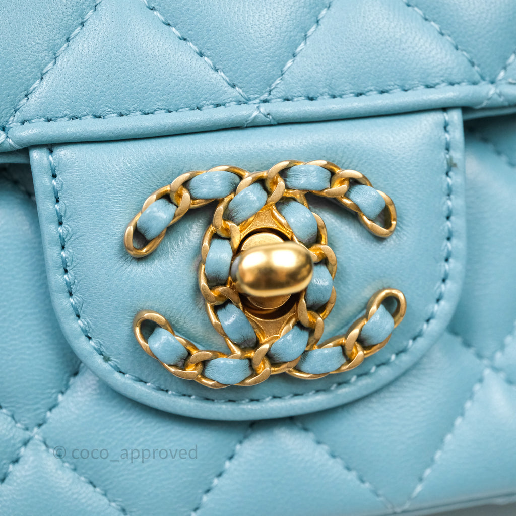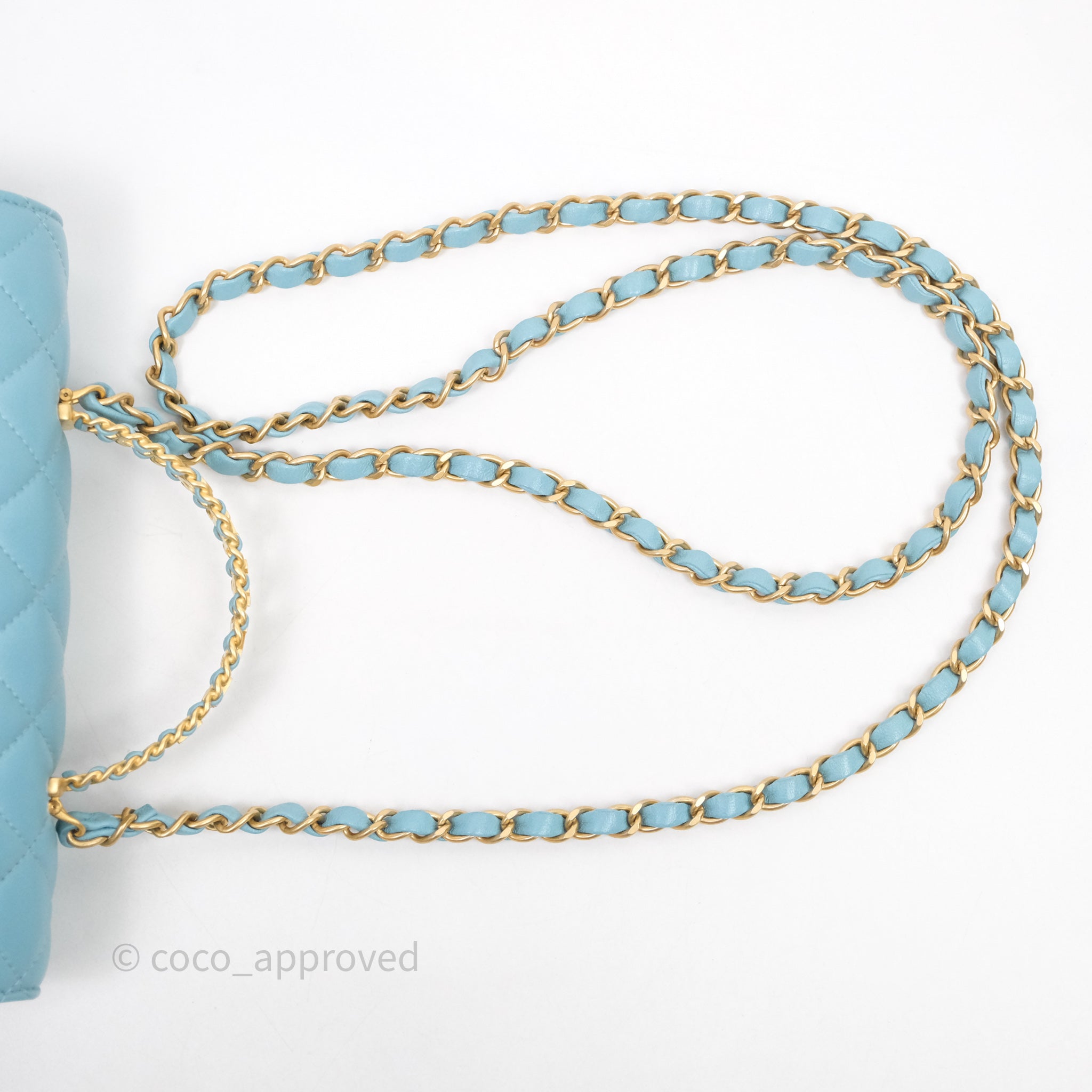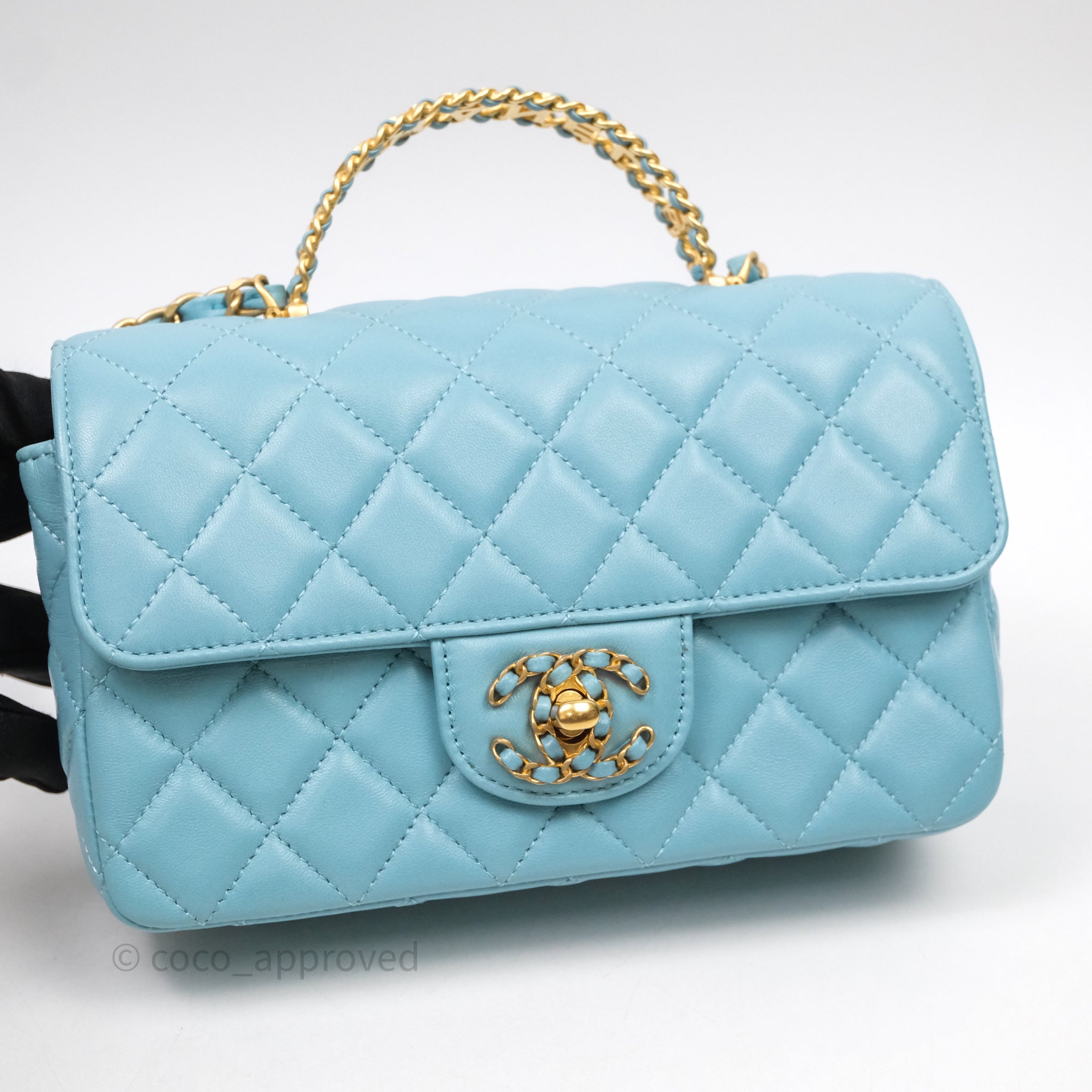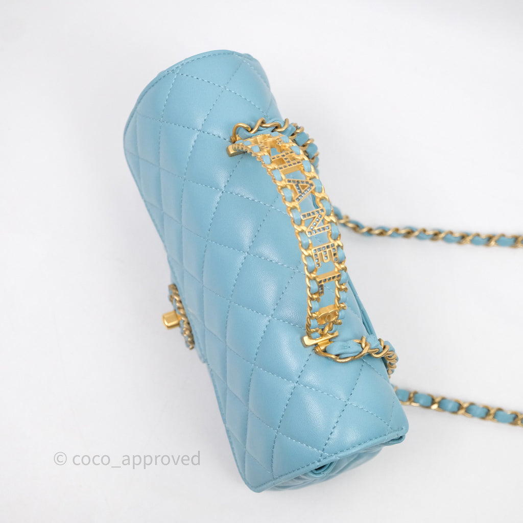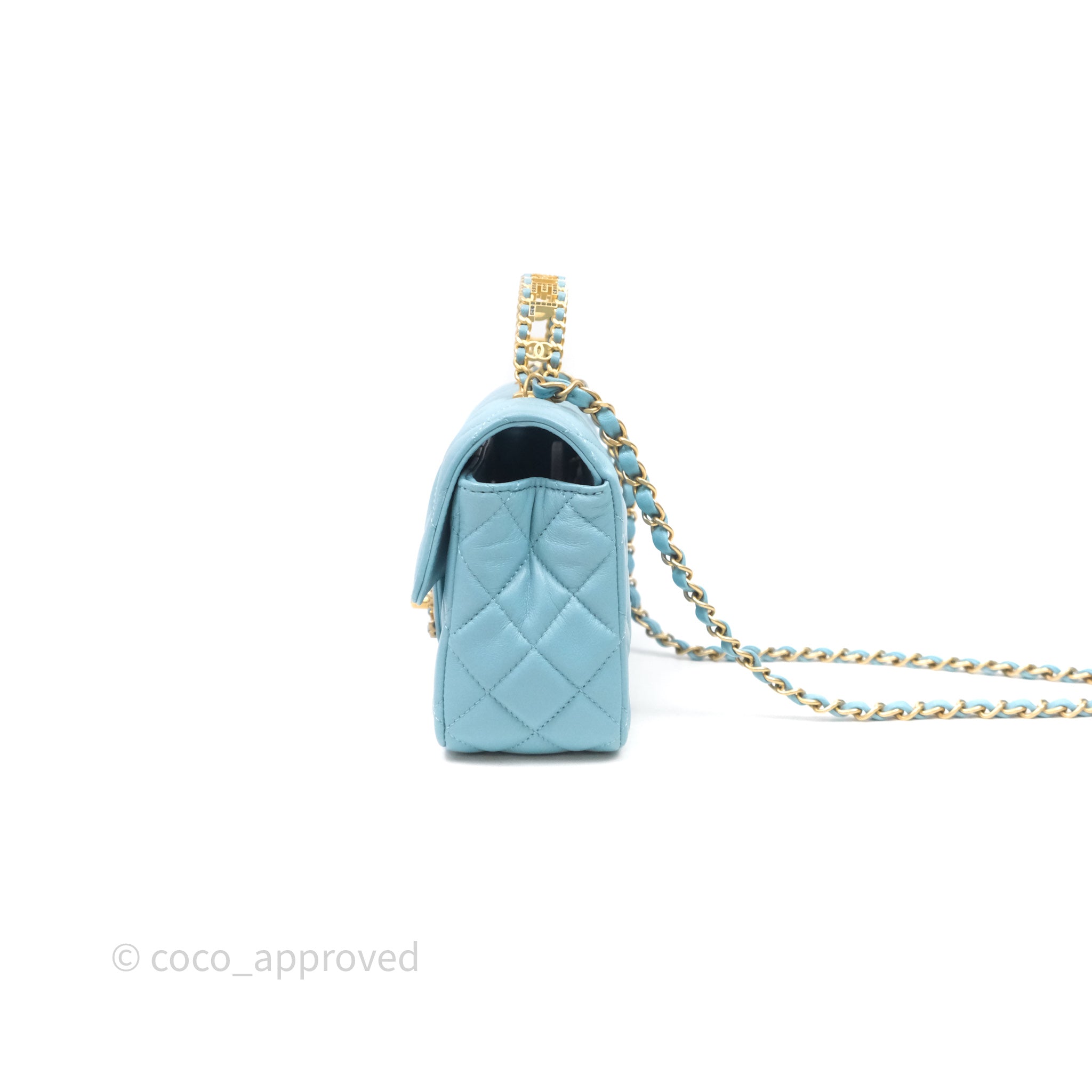 Chanel Flap Bag with Crystal Logo Top Handle Tiffany Blue Lambskin Aged Gold Hardware