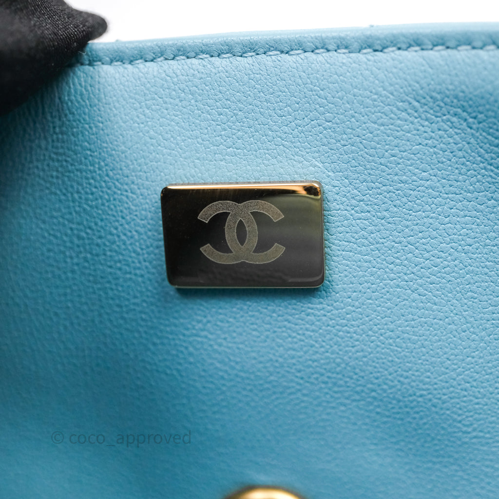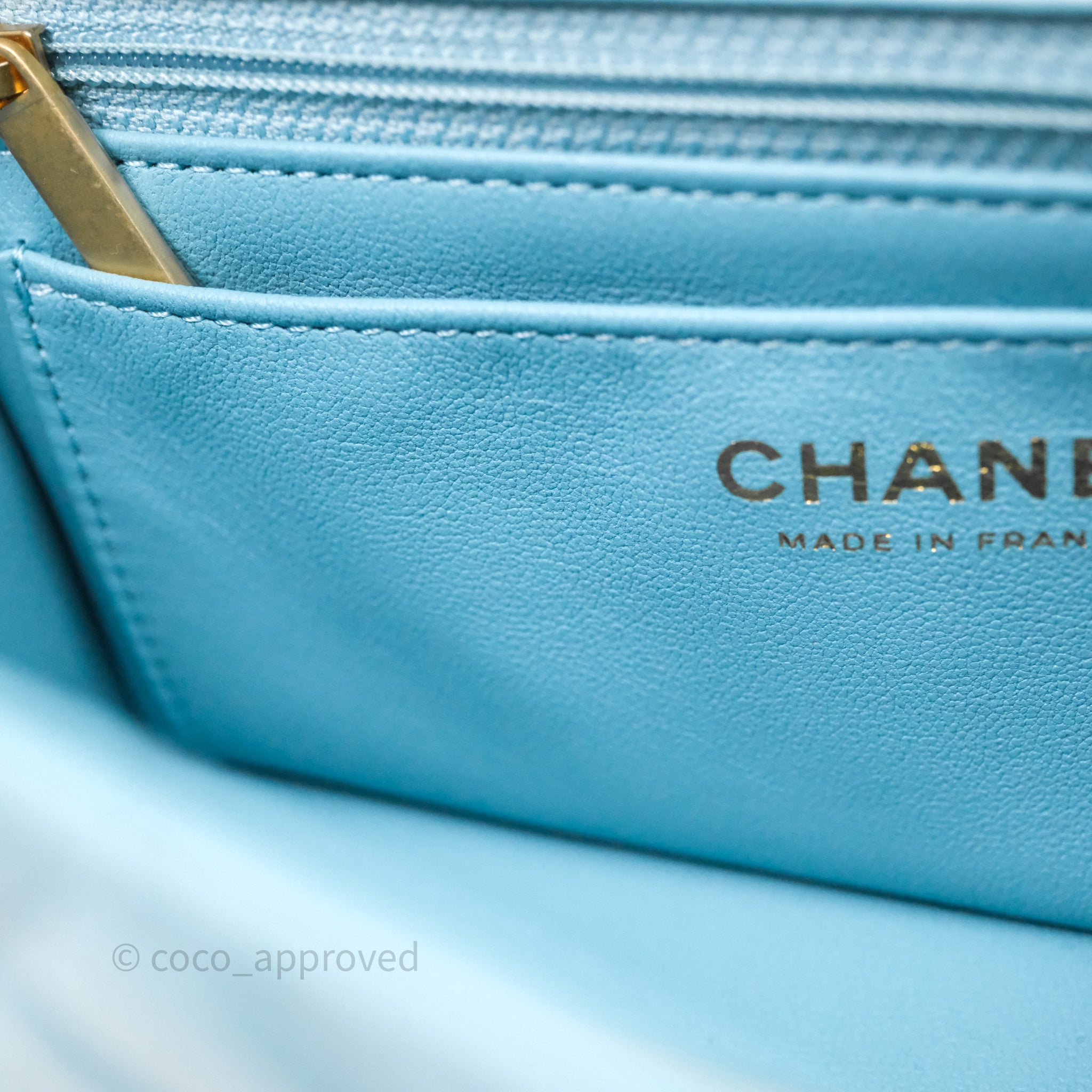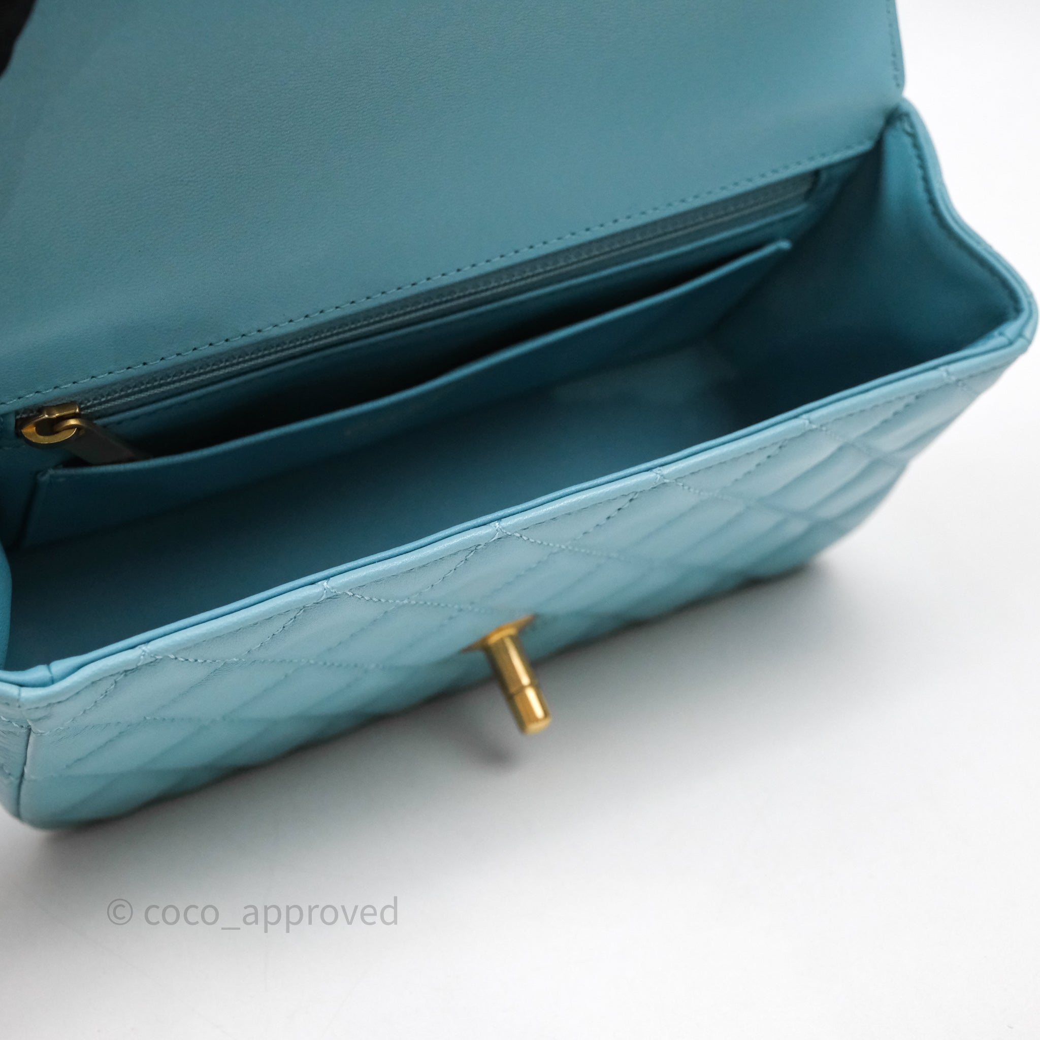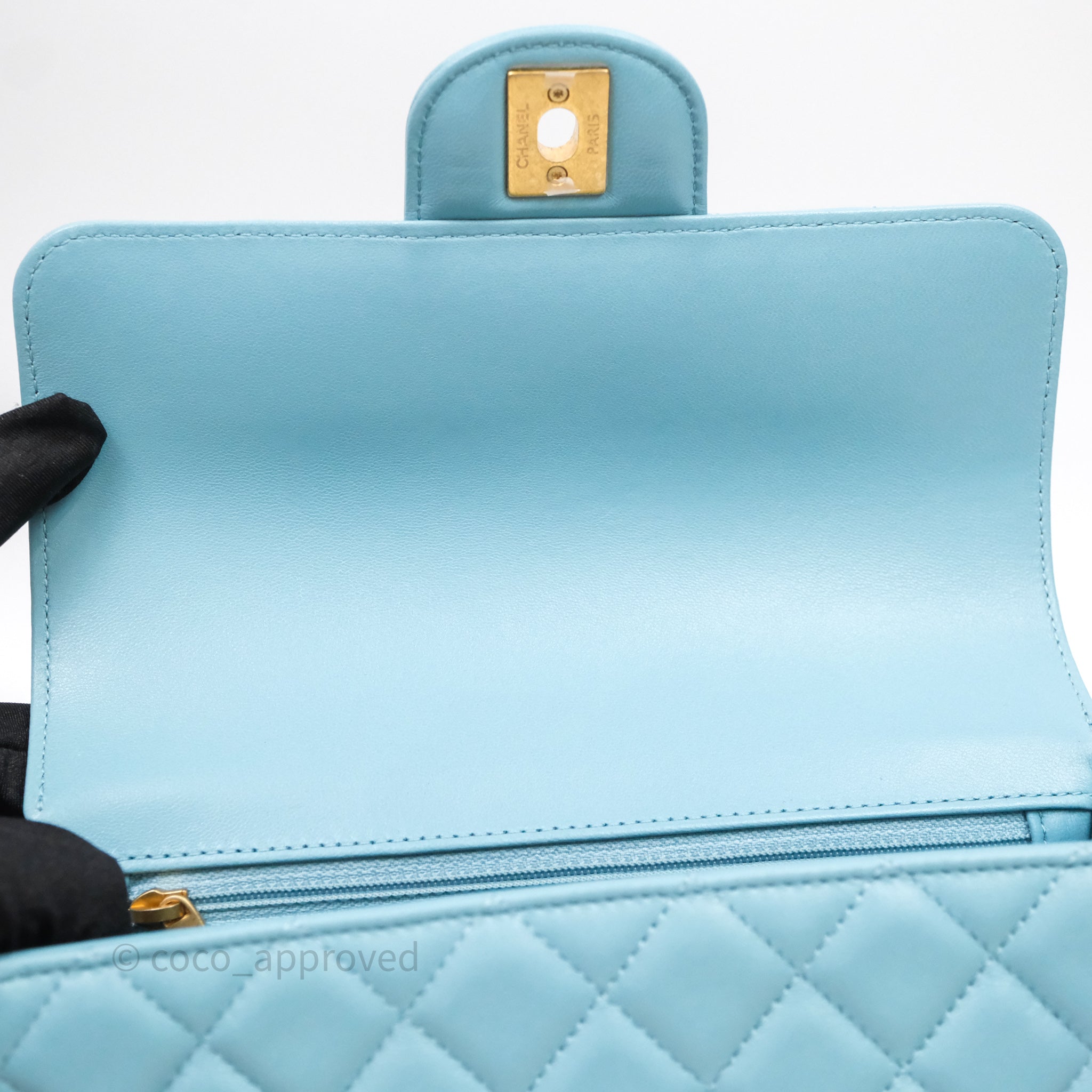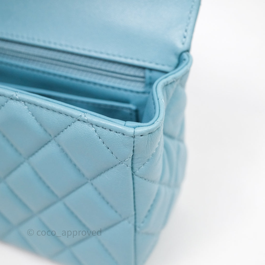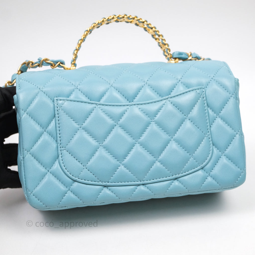 Chanel Flap Bag with Crystal Logo Top Handle Tiffany Blue Lambskin Aged Gold Hardware