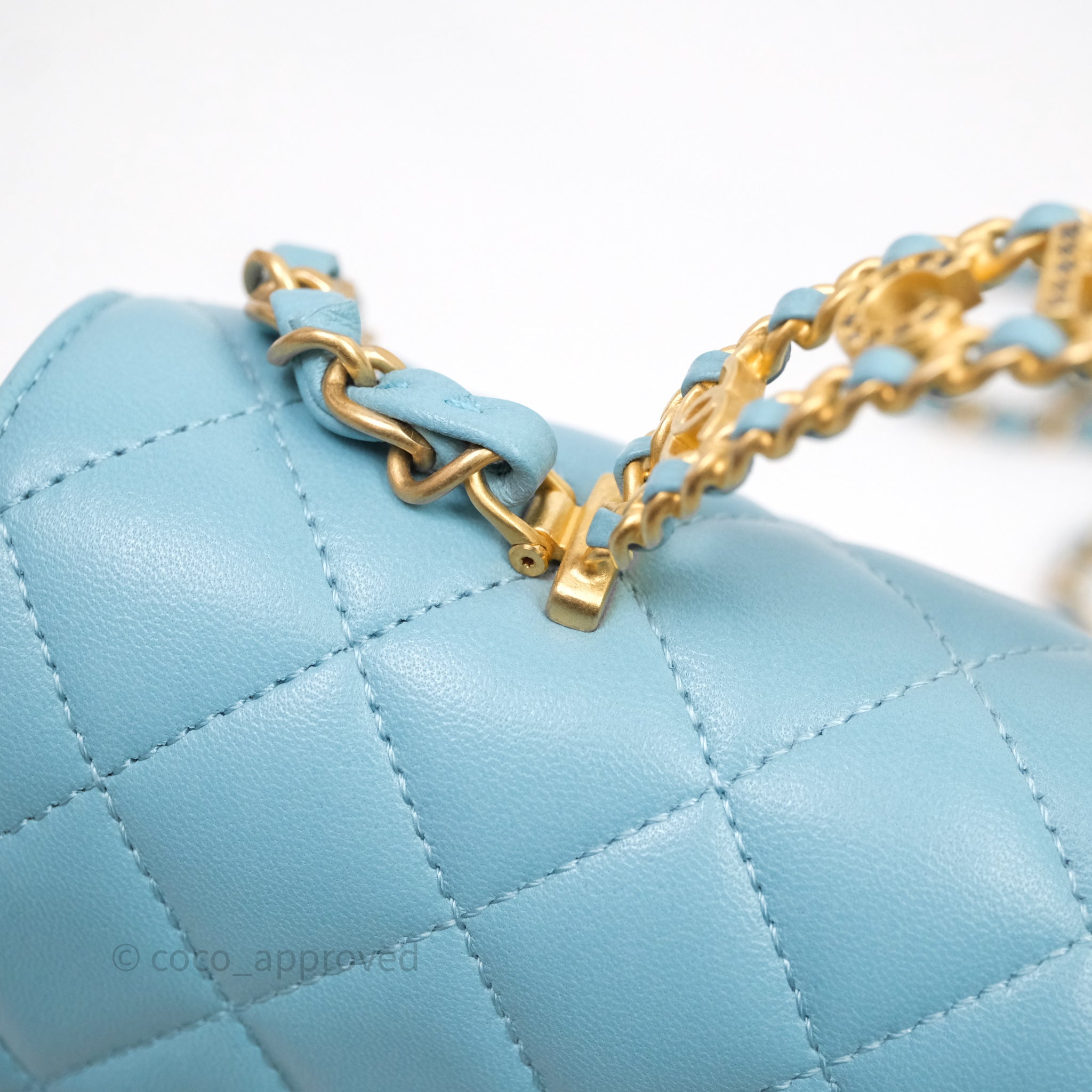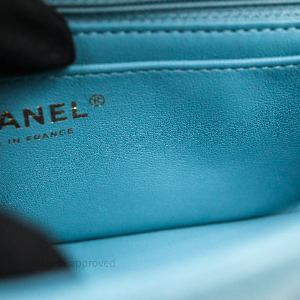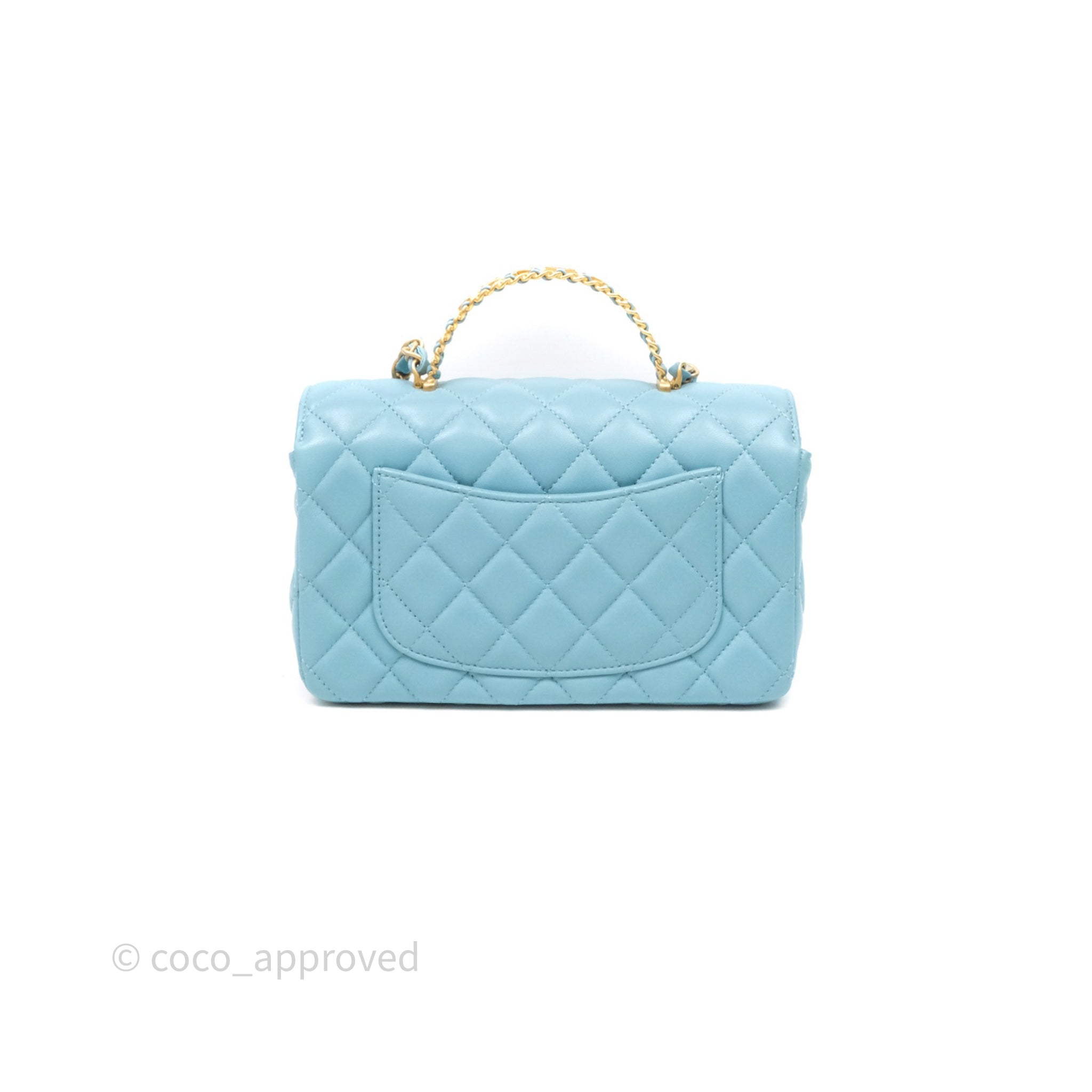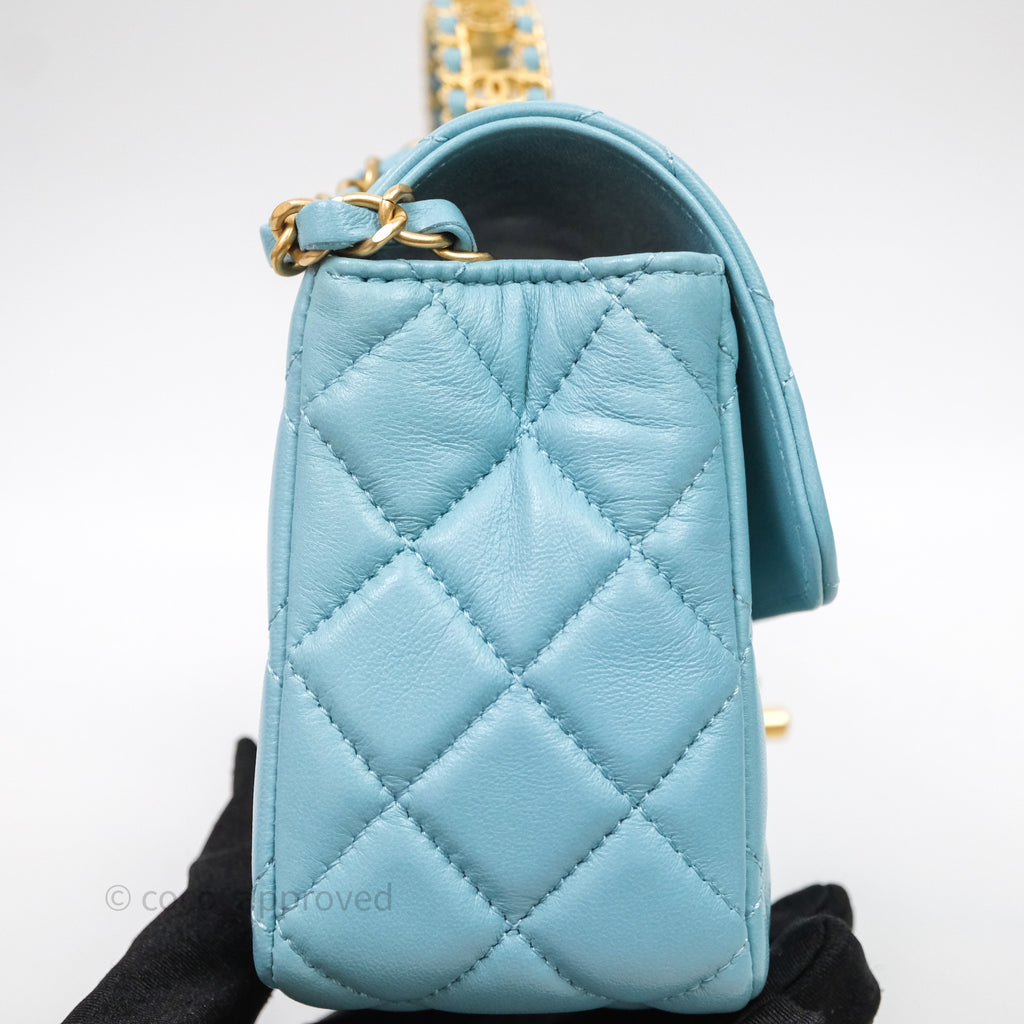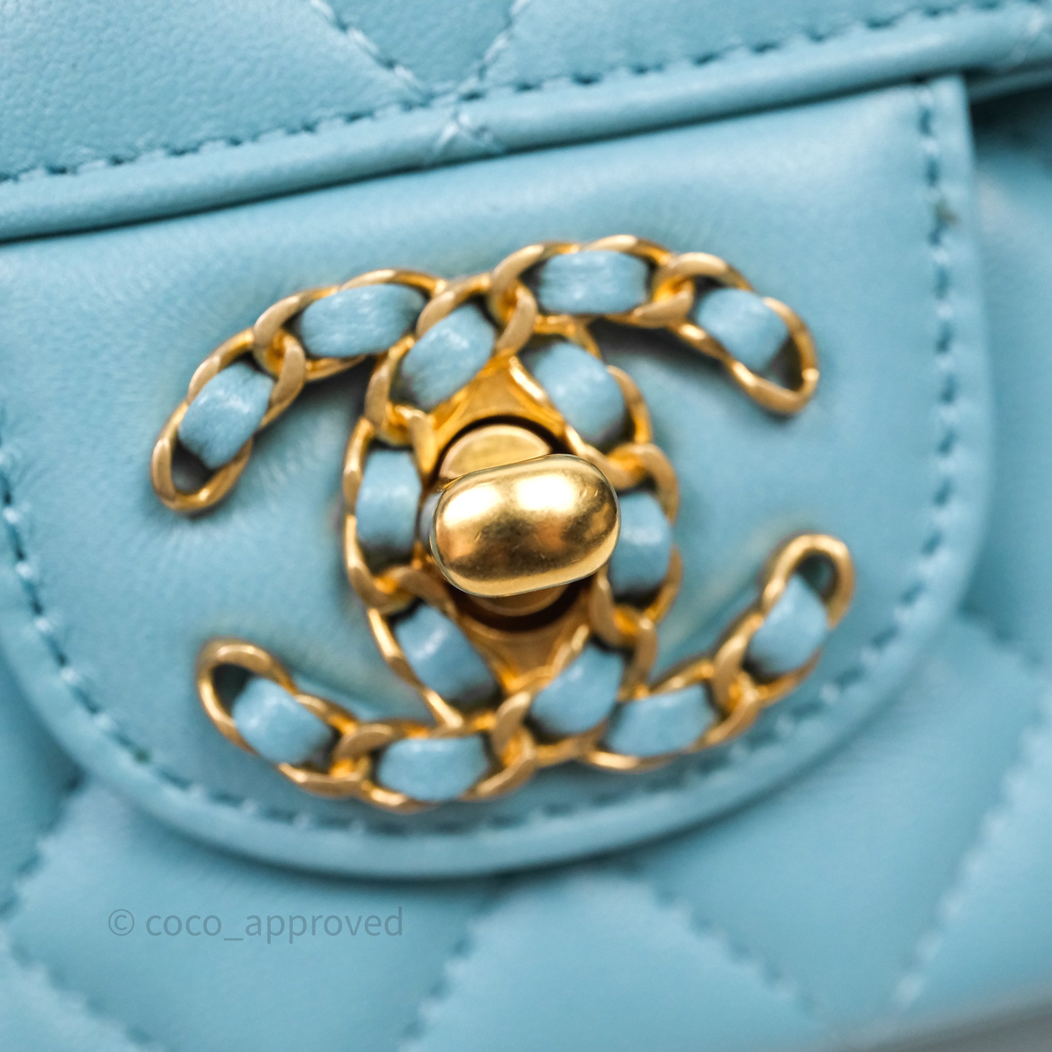 Chanel Flap Bag with Crystal Logo Top Handle Tiffany Blue Lambskin Aged Gold Hardware