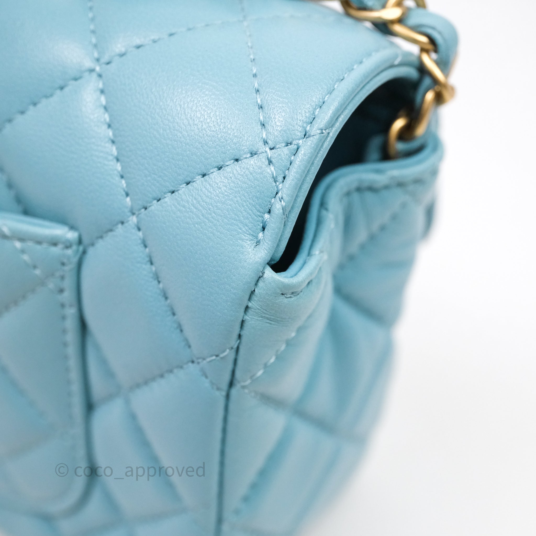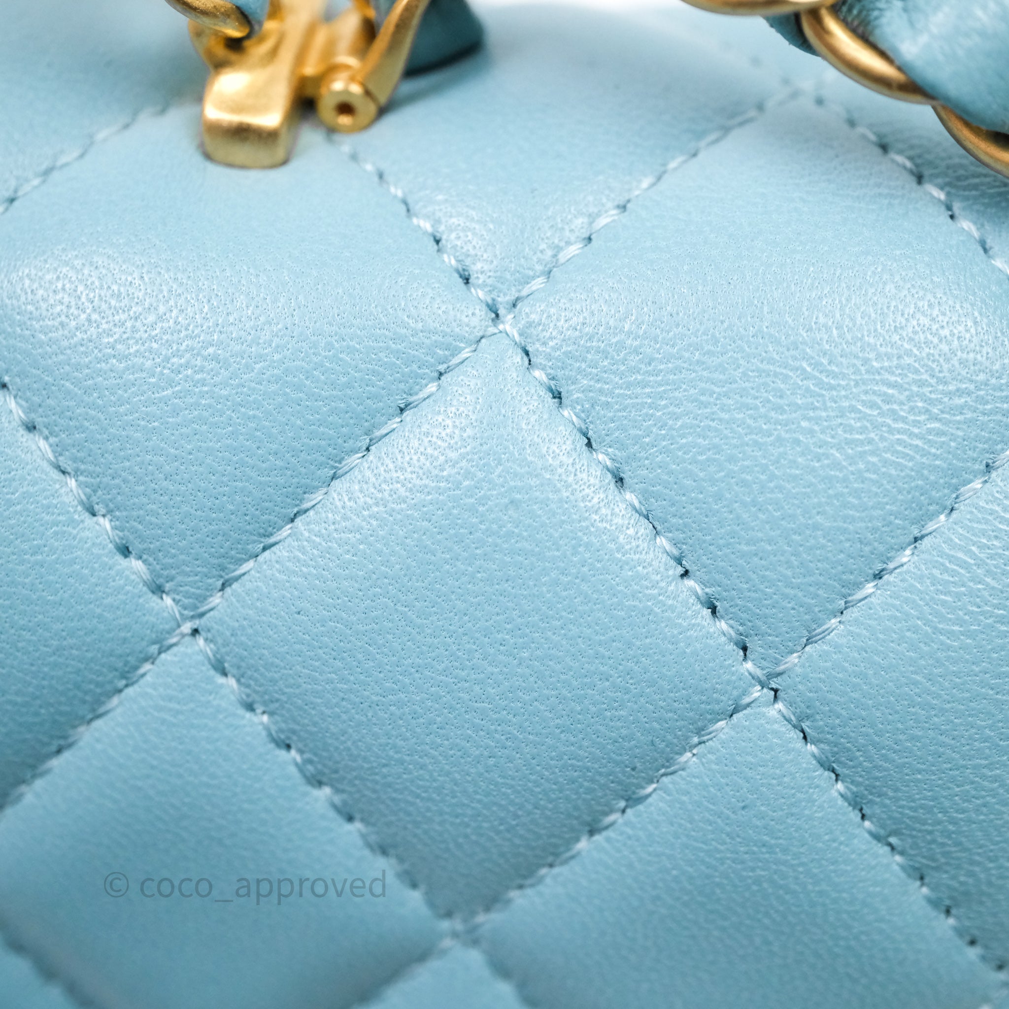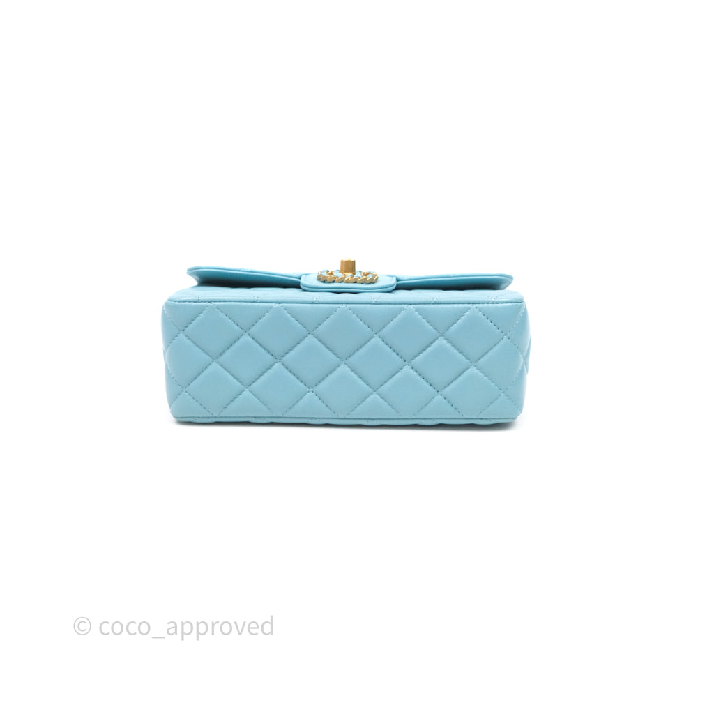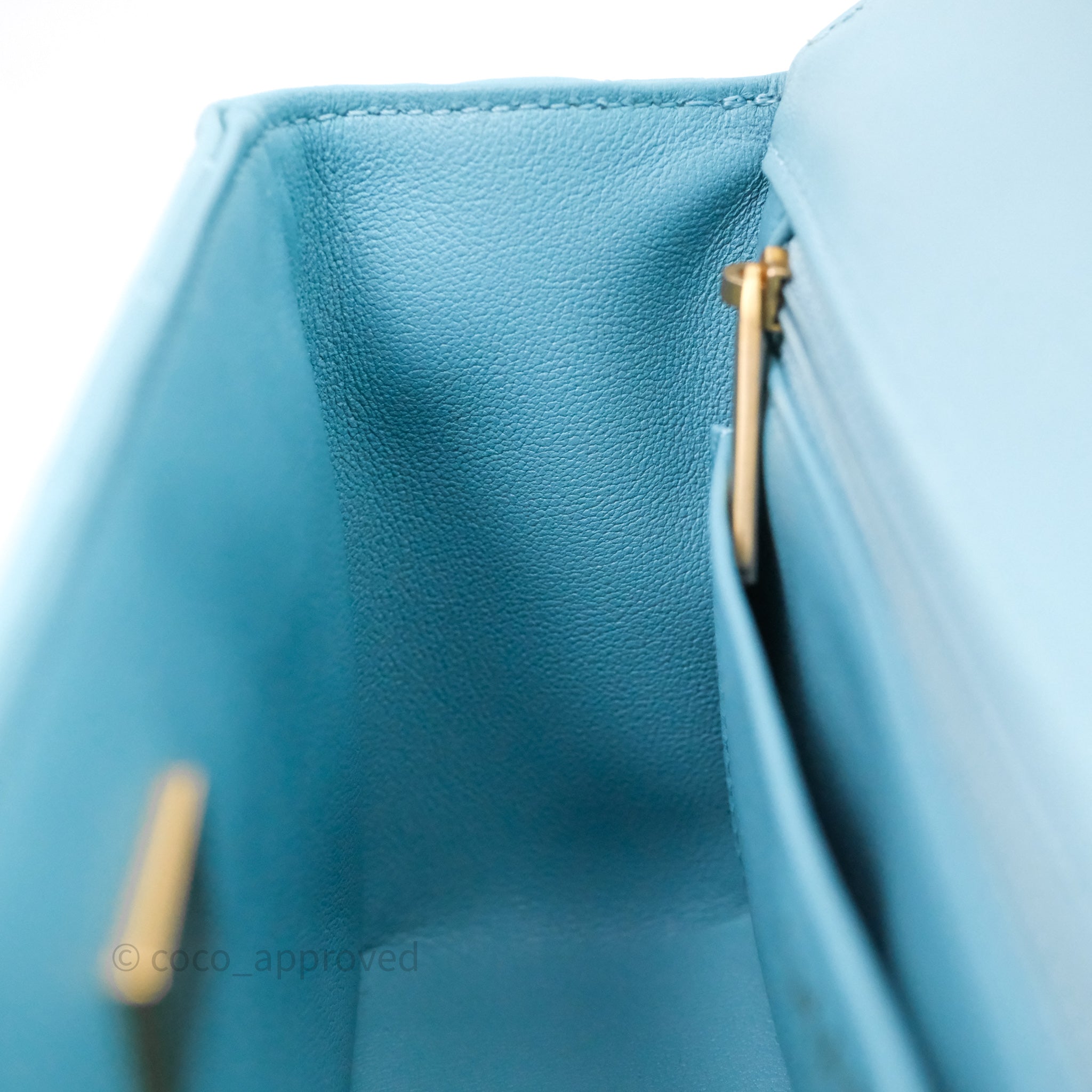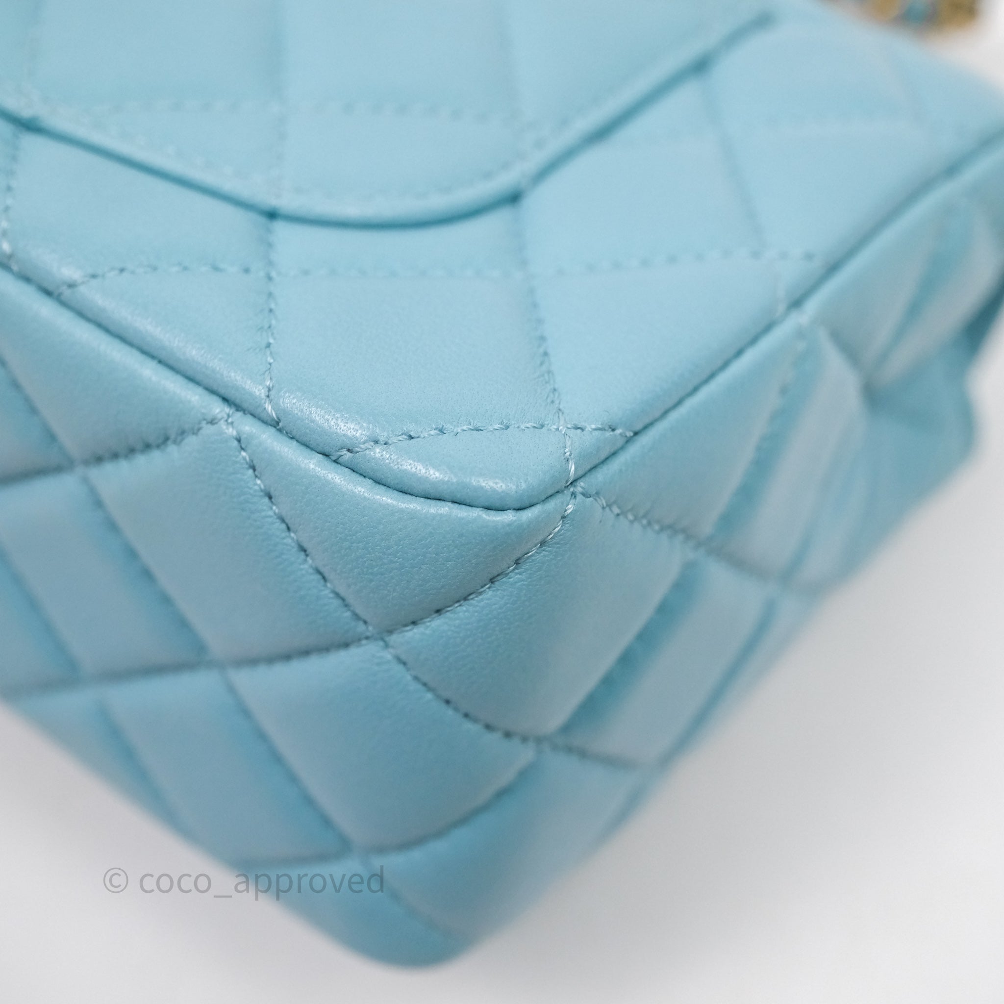 Chanel Flap Bag with Crystal Logo Top Handle Tiffany Blue Lambskin Aged Gold Hardware
