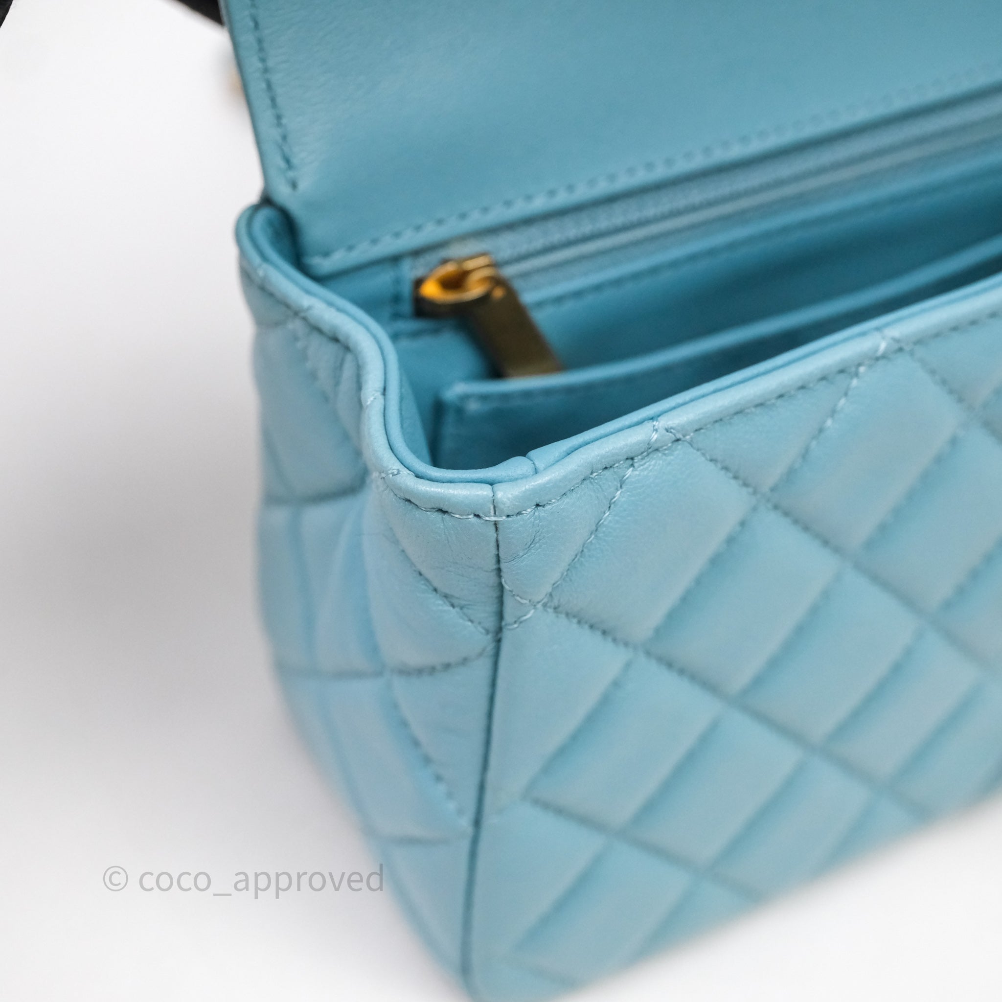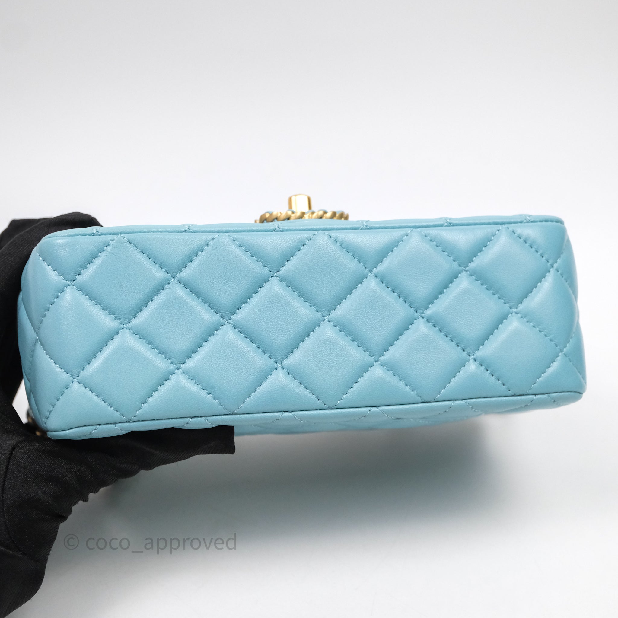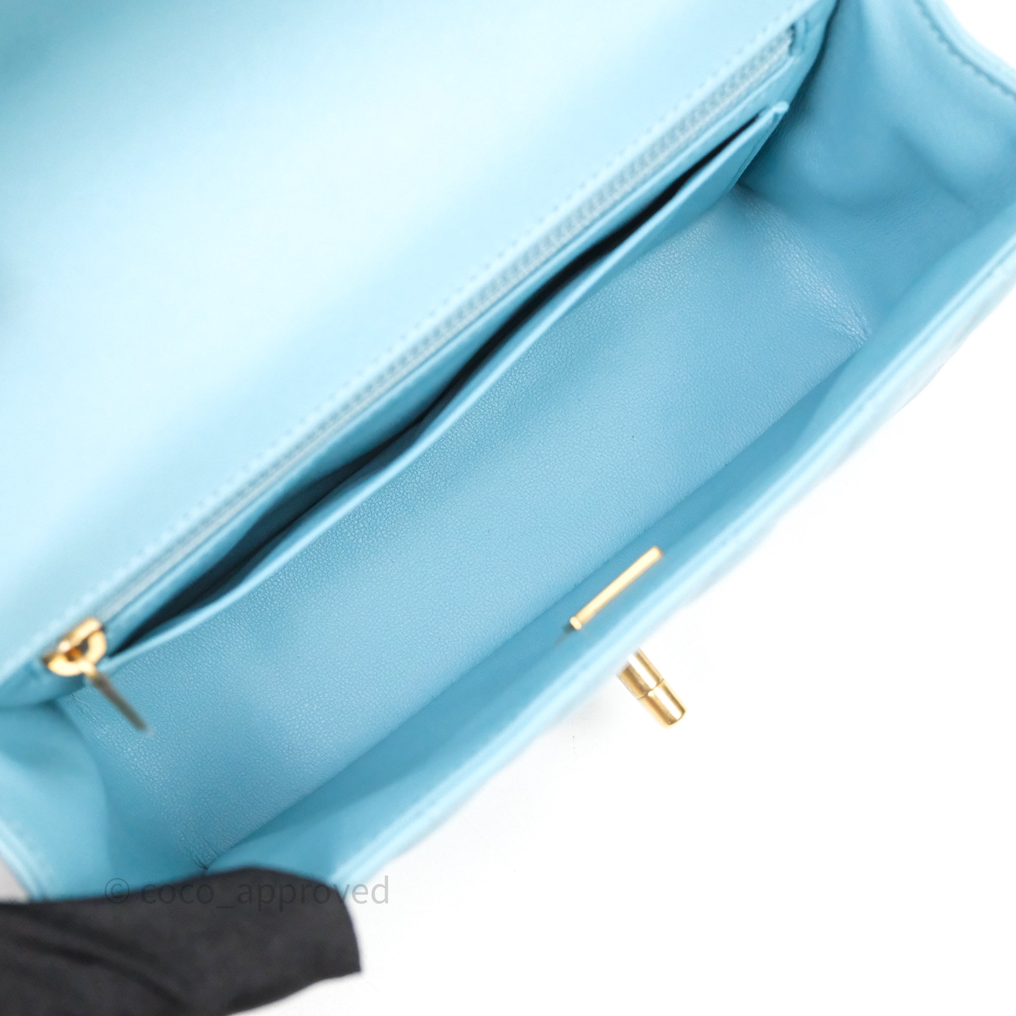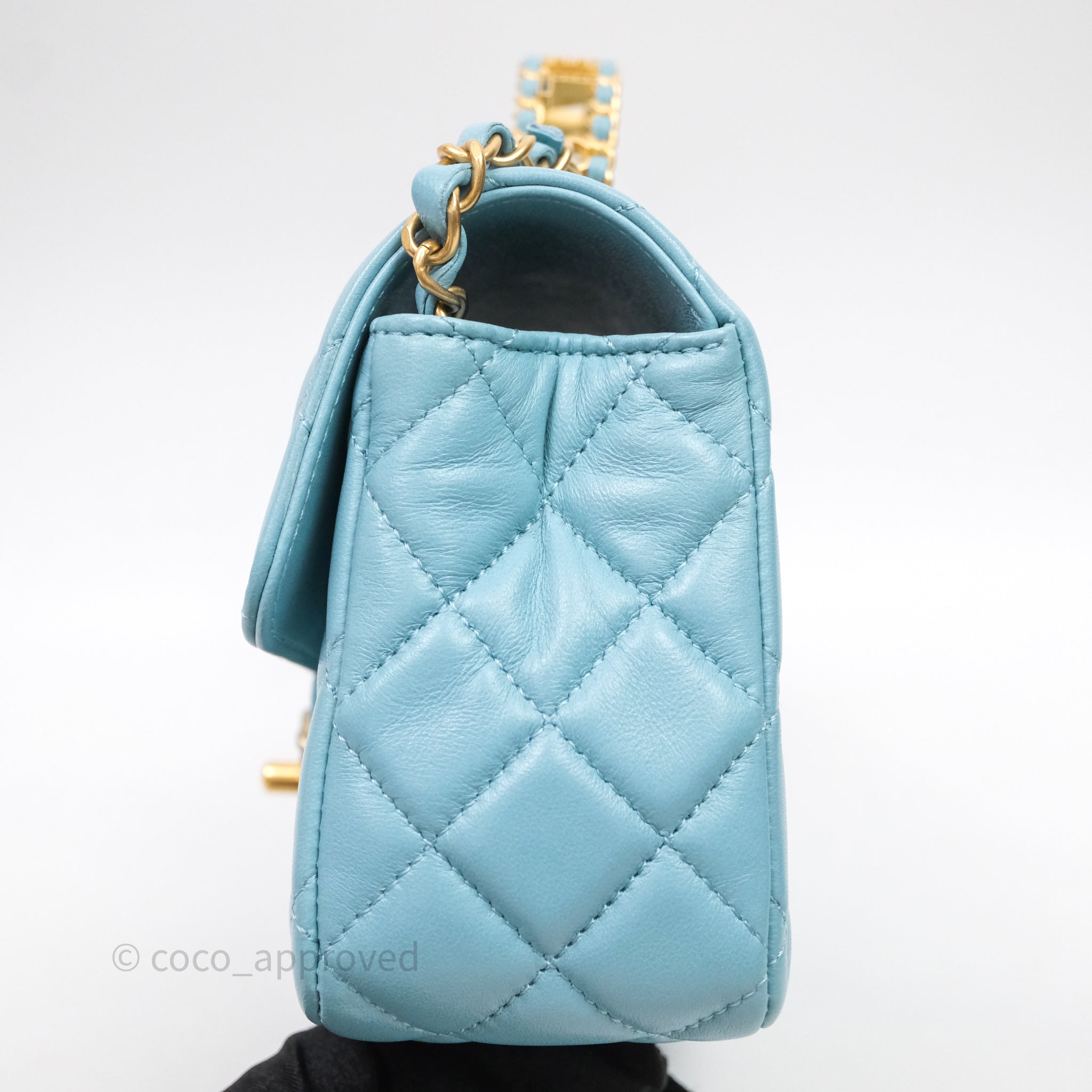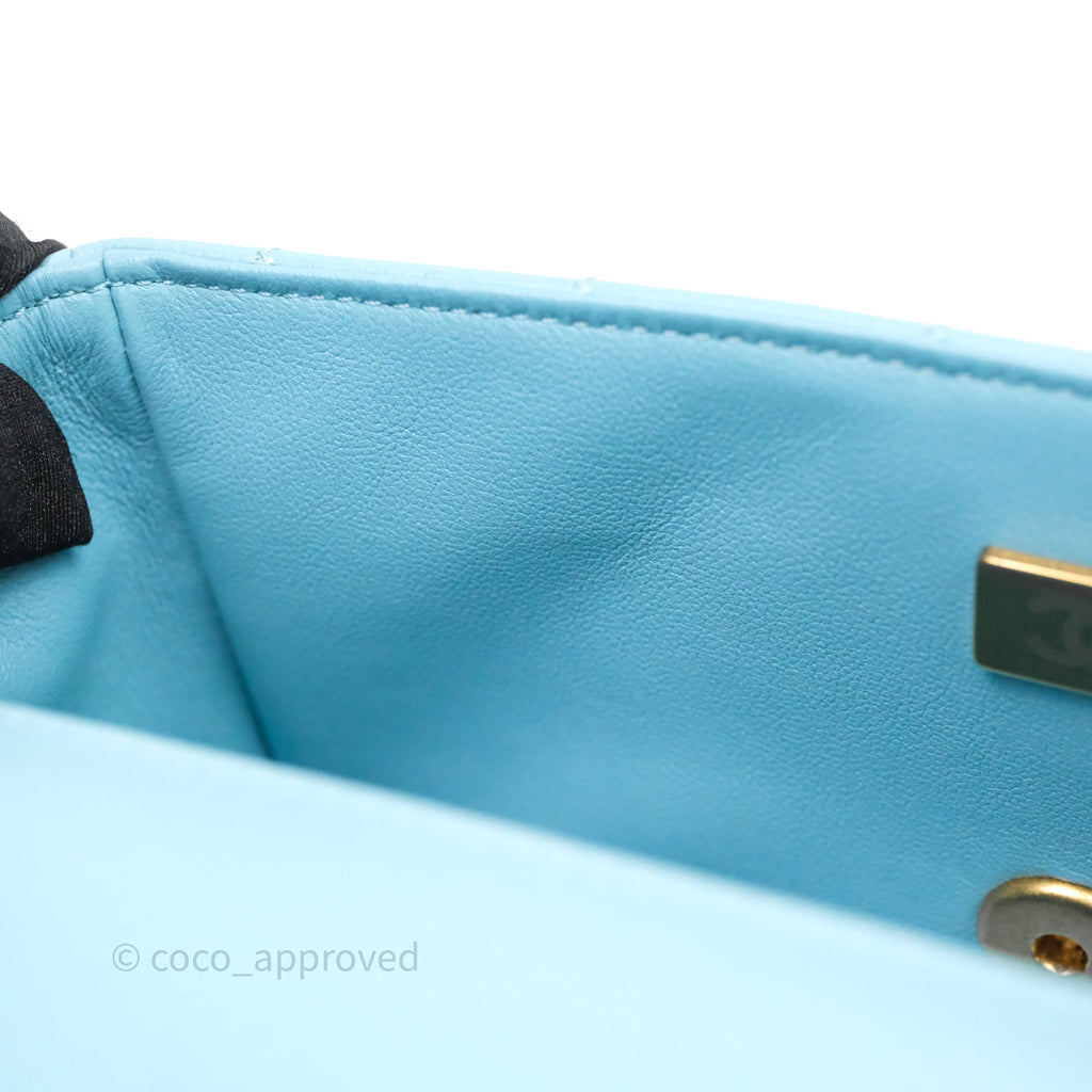 Chanel Flap Bag with Crystal Logo Top Handle Tiffany Blue Lambskin Aged Gold Hardware