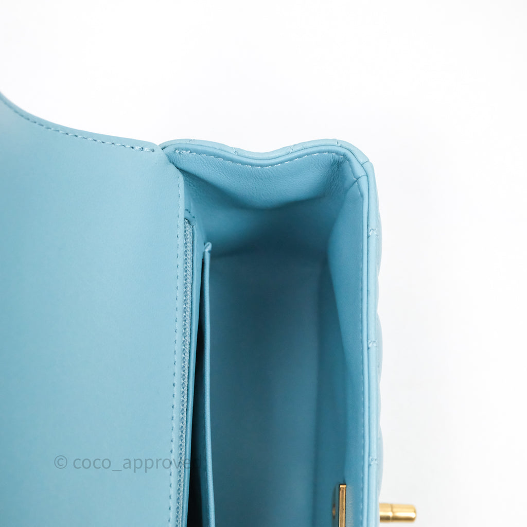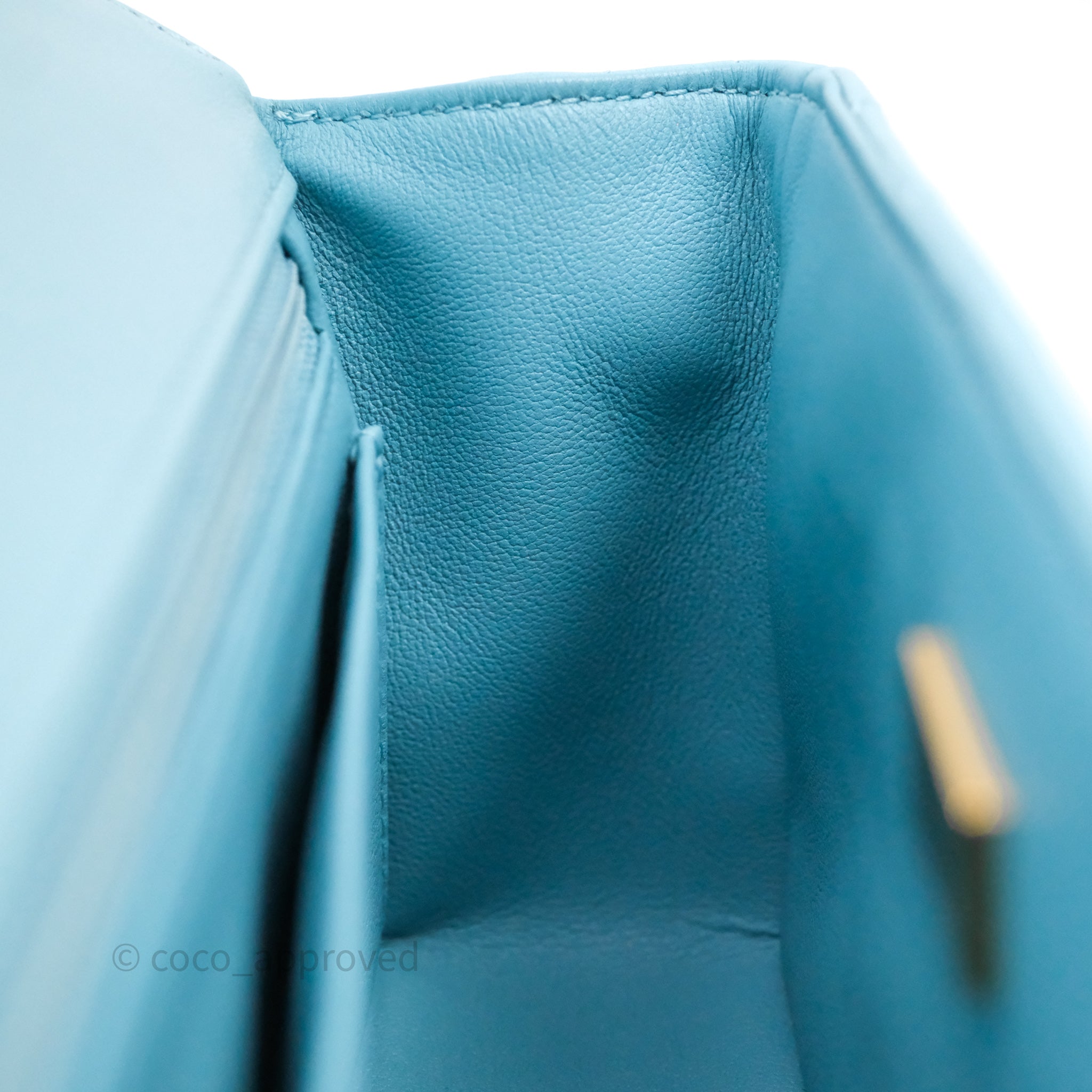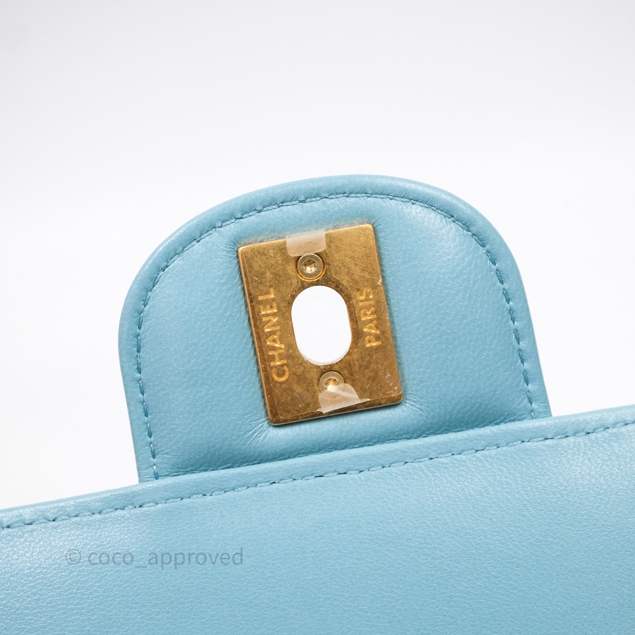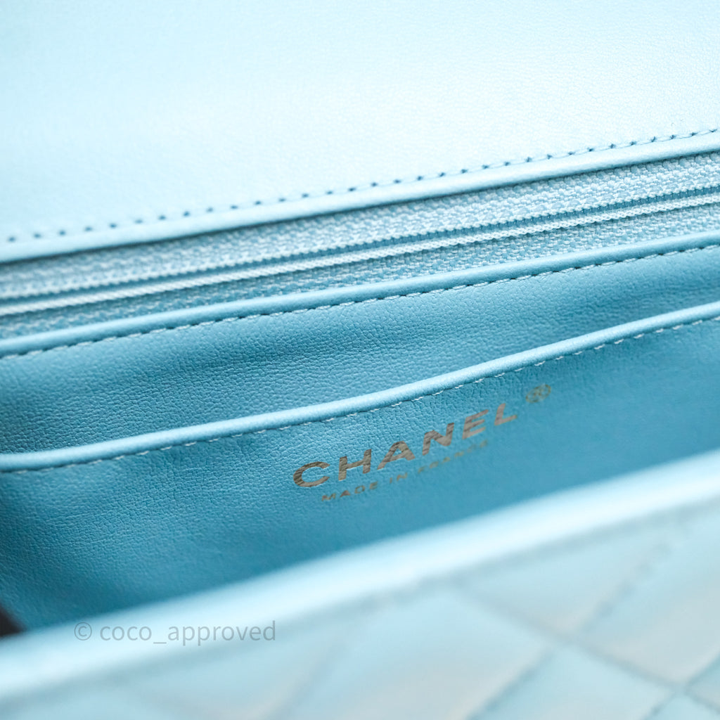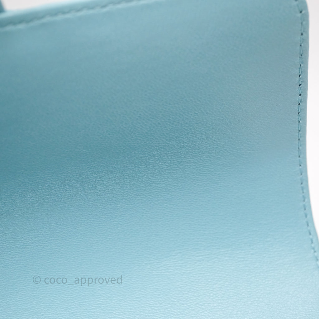 Chanel Flap Bag with Crystal Logo Top Handle Tiffany Blue Lambskin Aged Gold Hardware