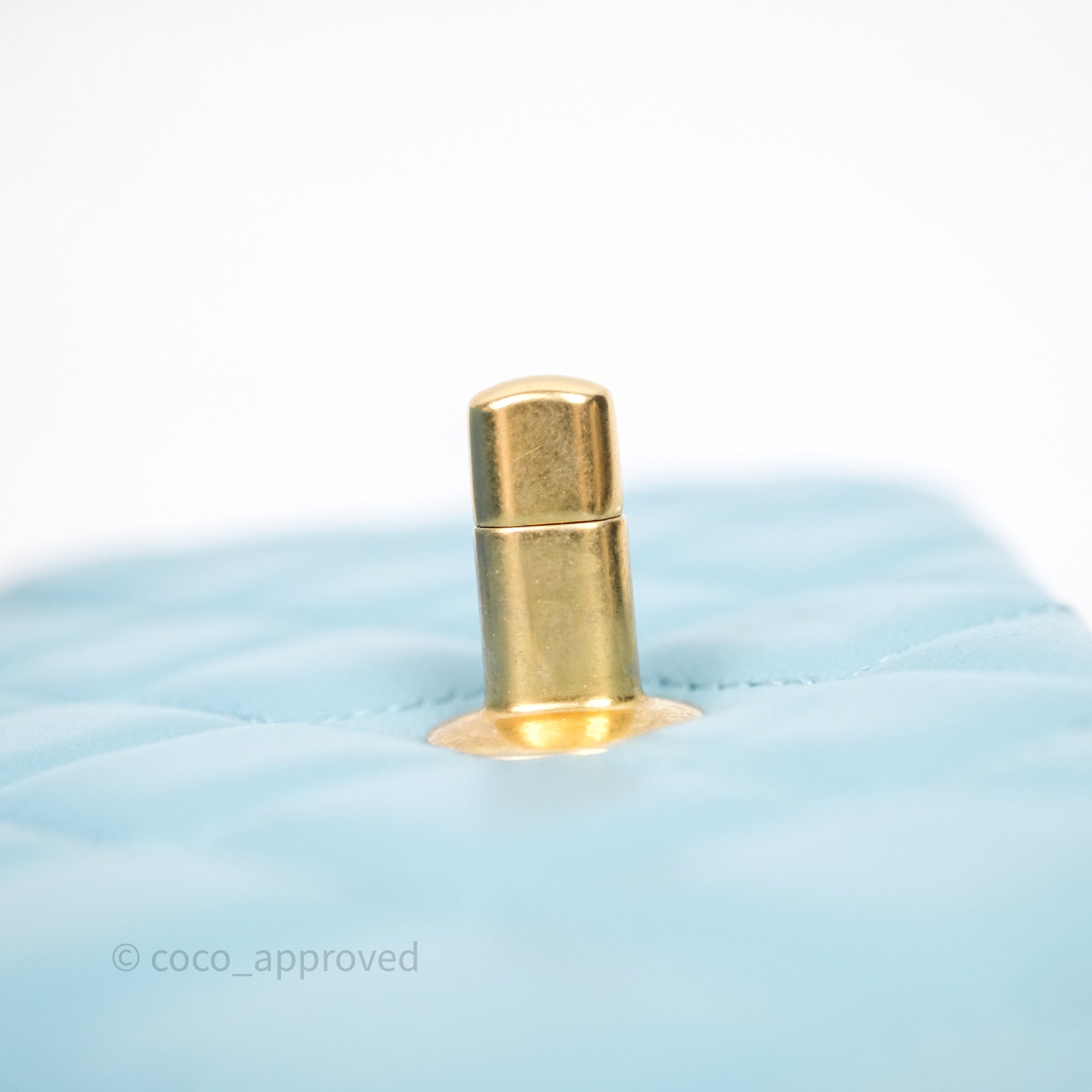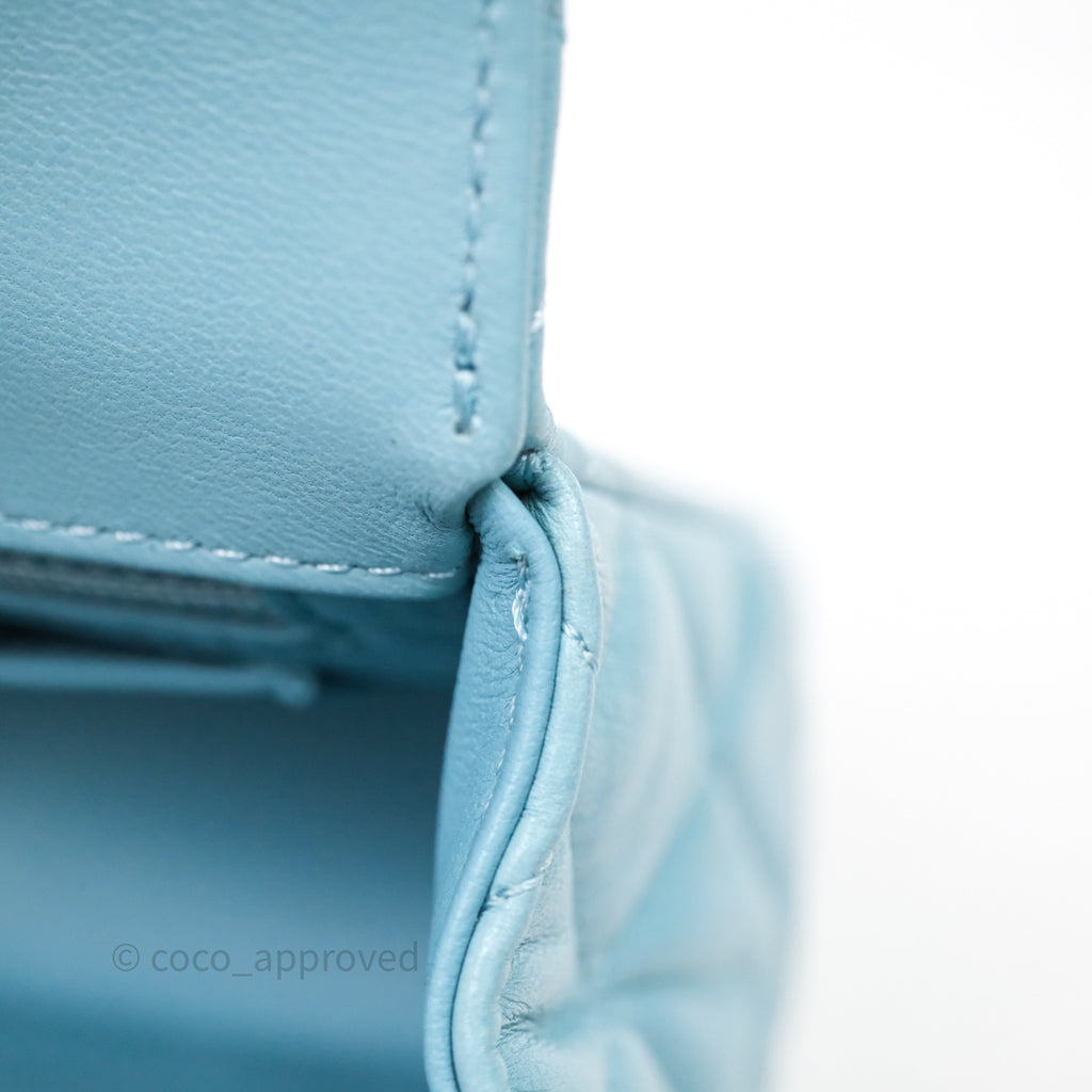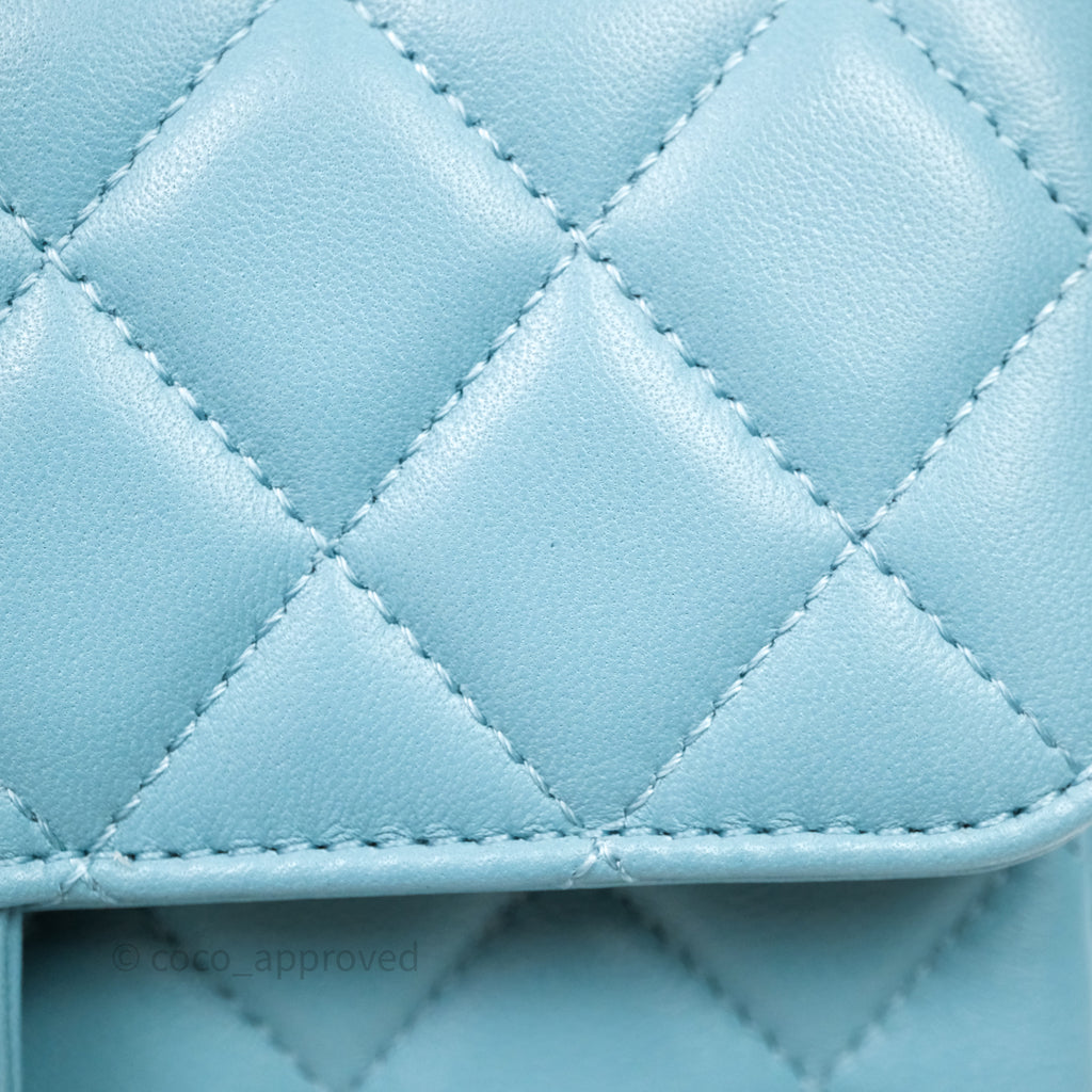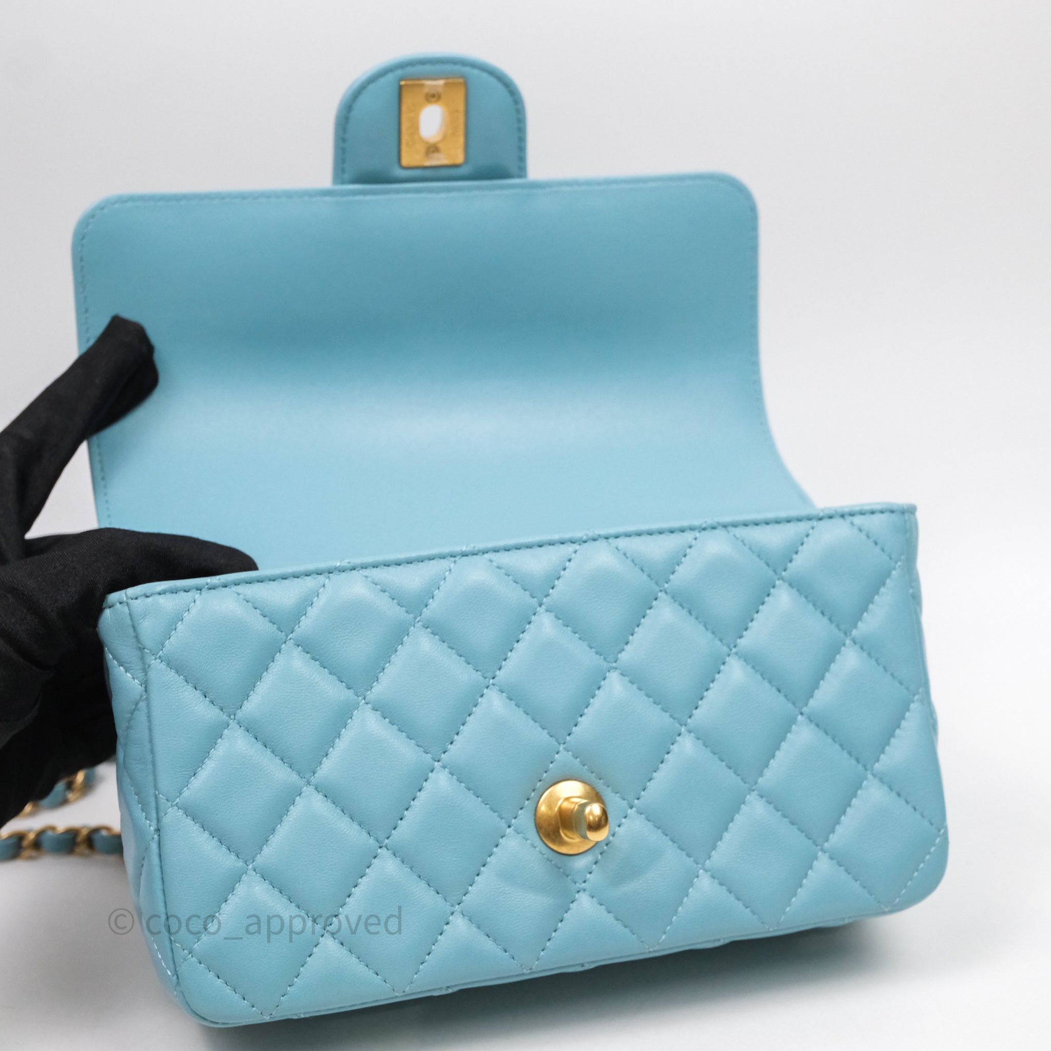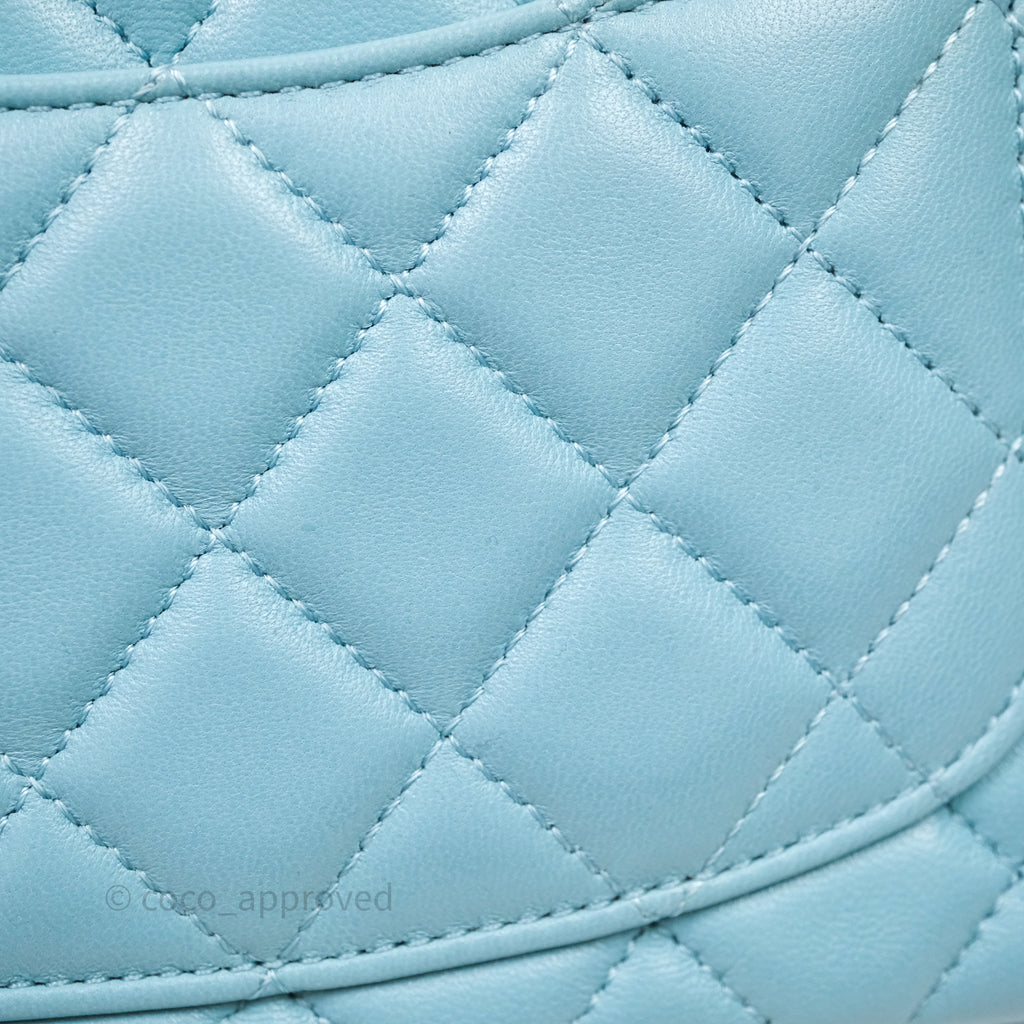 Chanel Flap Bag with Crystal Logo Top Handle Tiffany Blue Lambskin Aged Gold Hardware