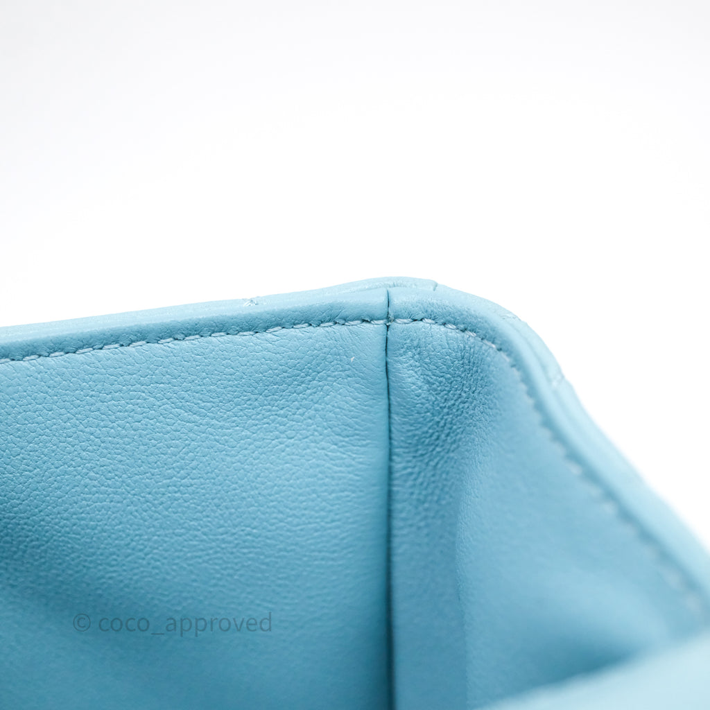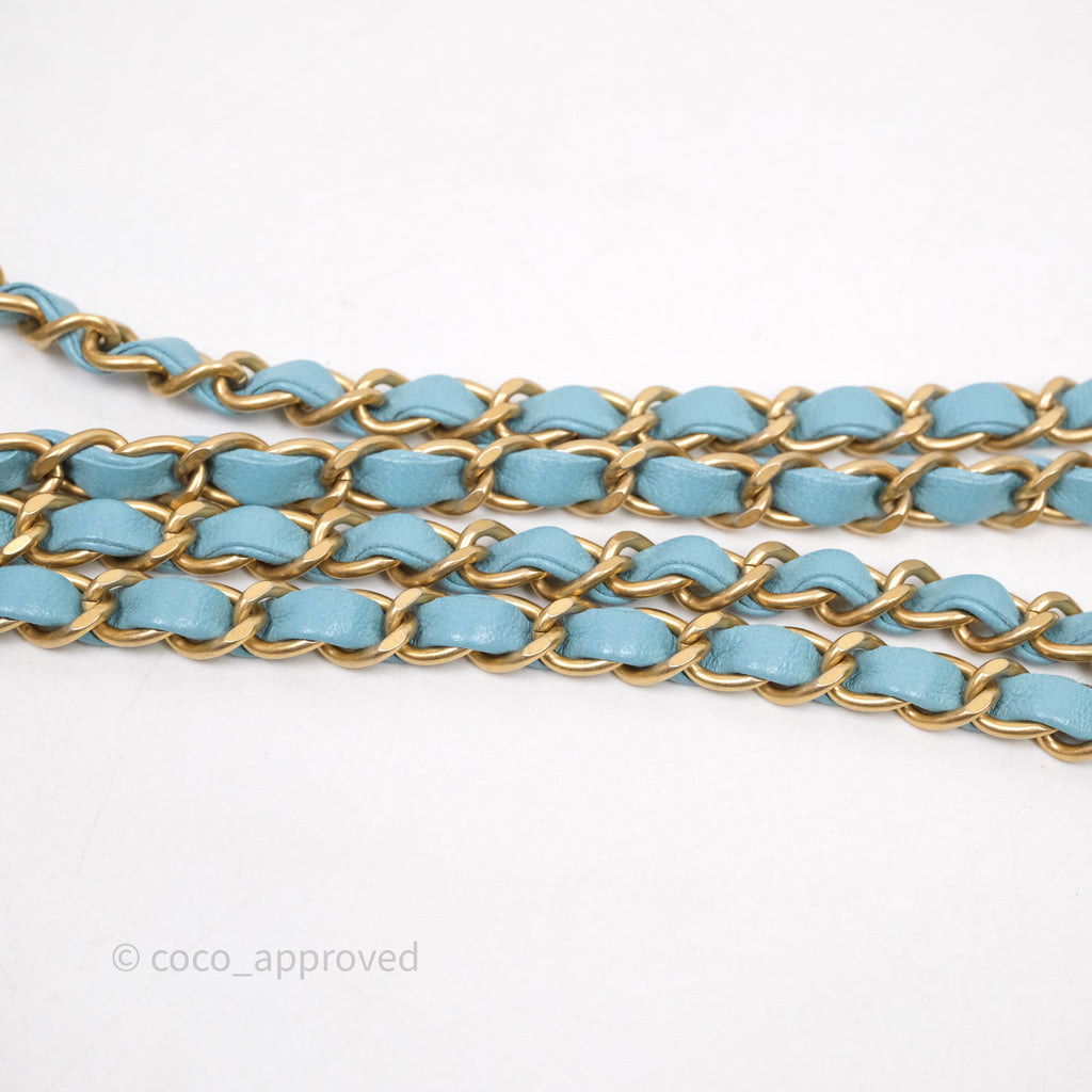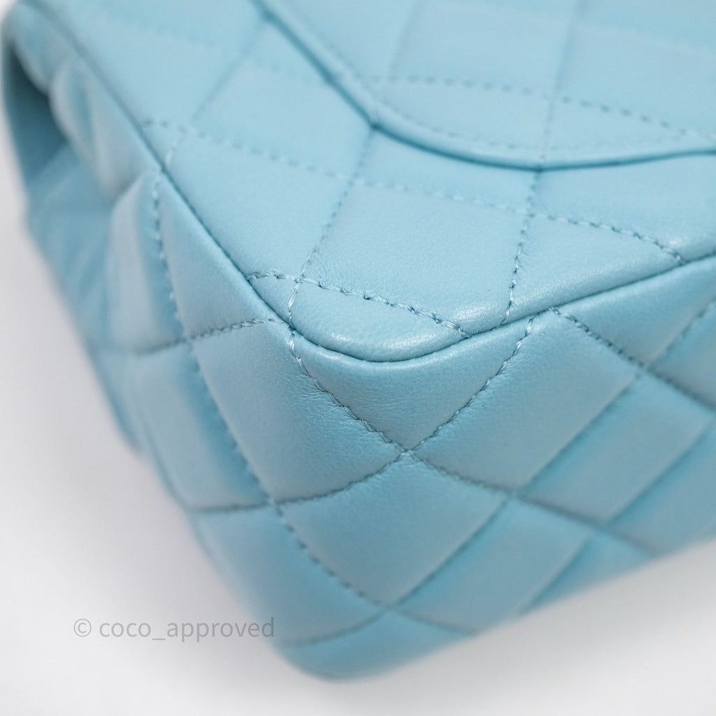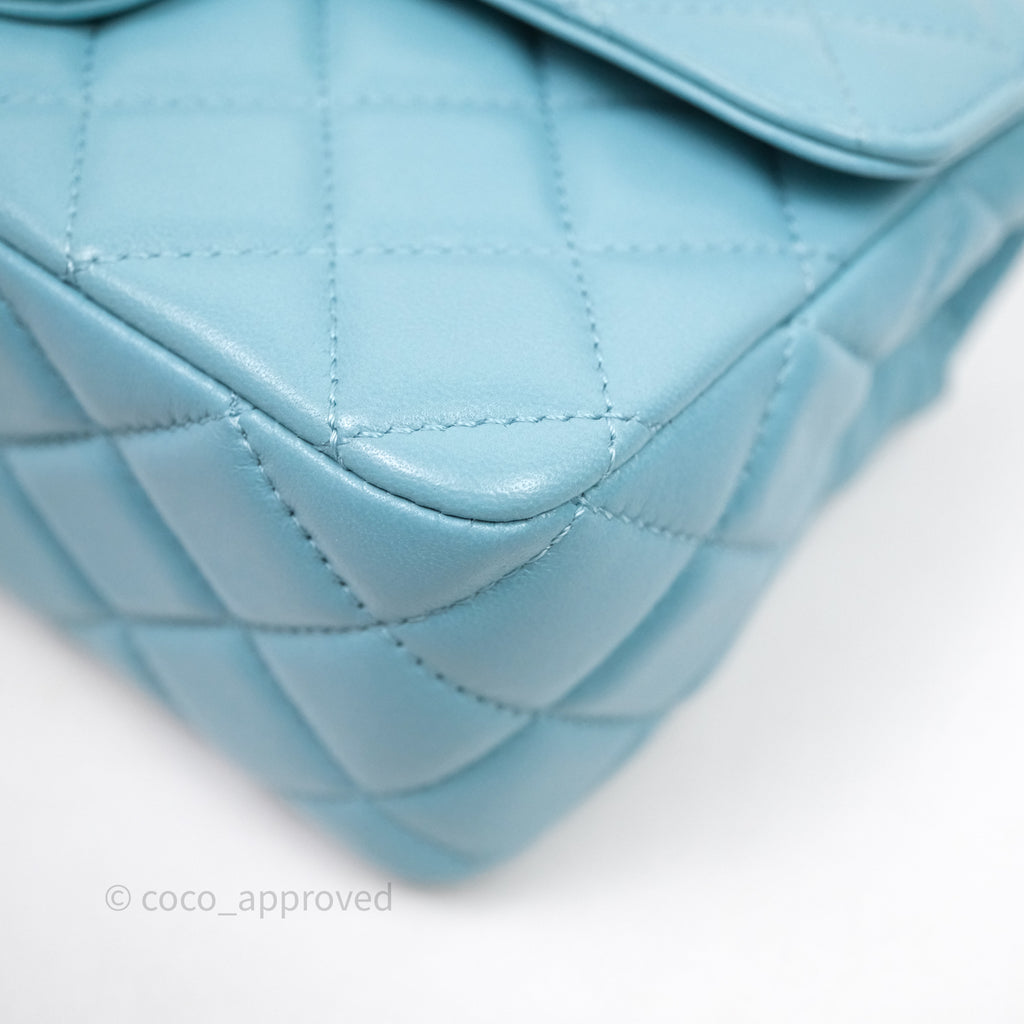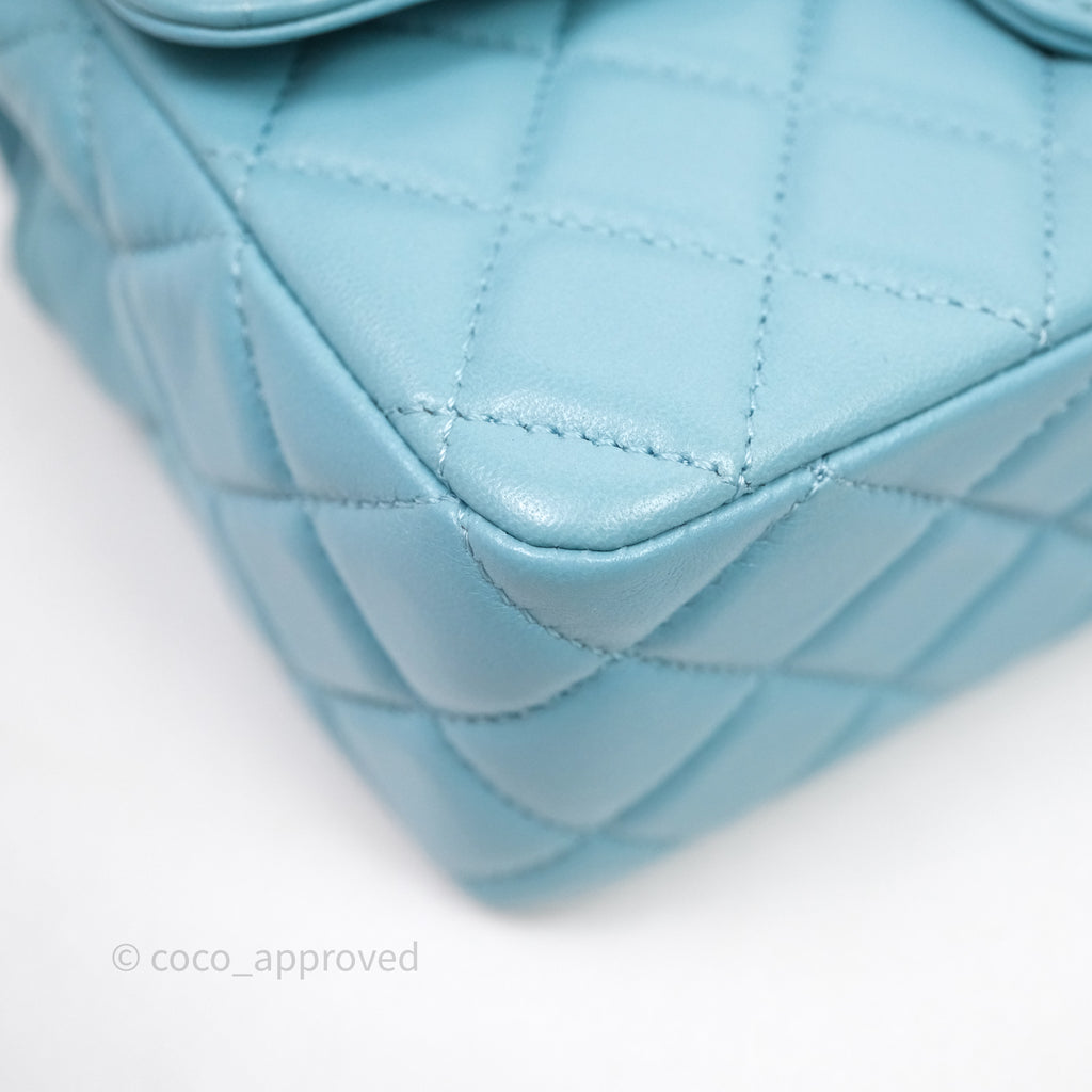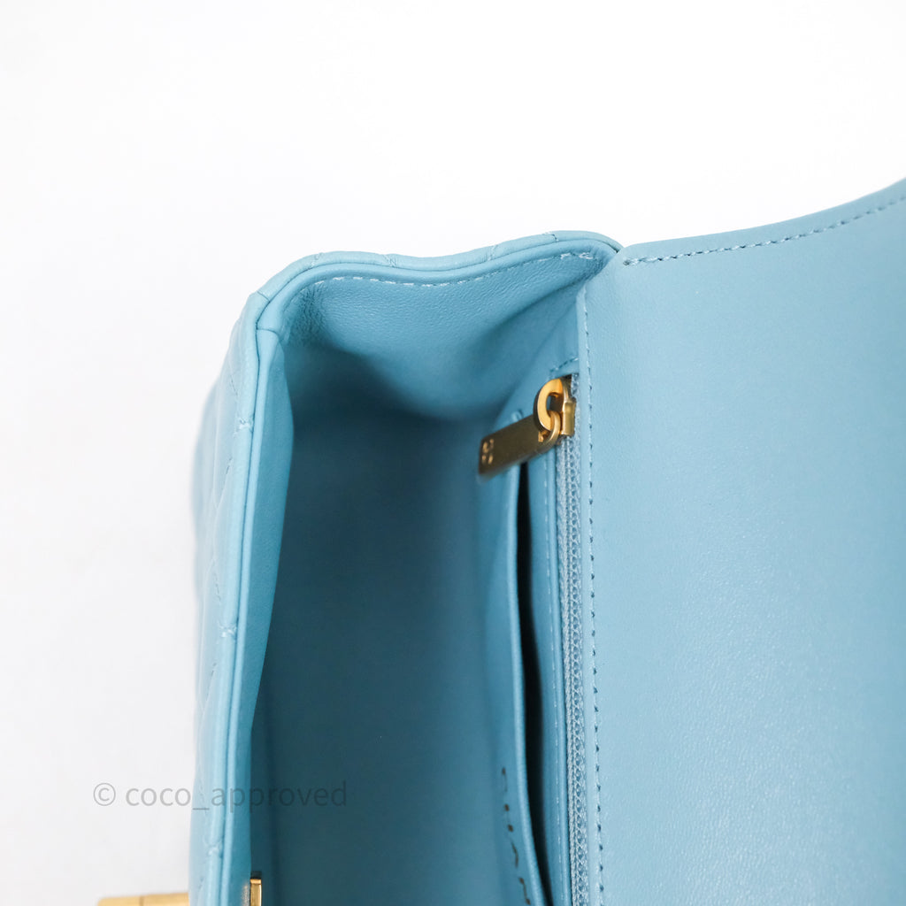 Chanel Flap Bag with Crystal Logo Top Handle Tiffany Blue Lambskin Aged Gold Hardware