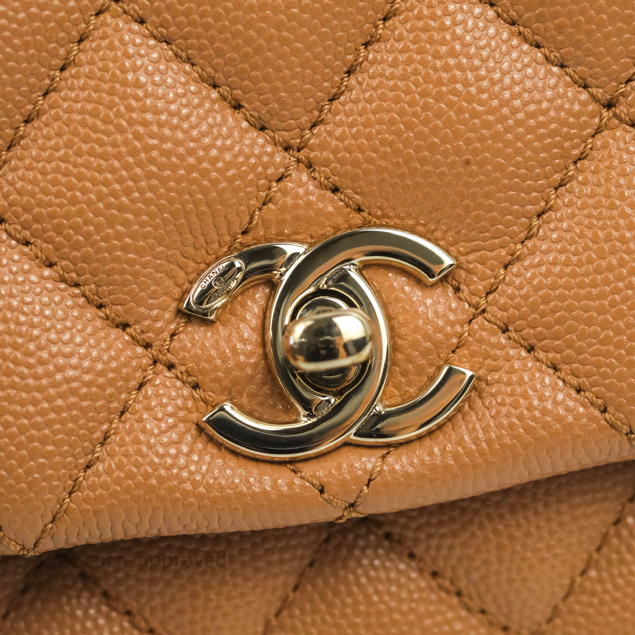 Chanel Mini Coco Handle Quilted Dark Beige Caramel Caviar Lizard Embossed Handle Gold Hardware