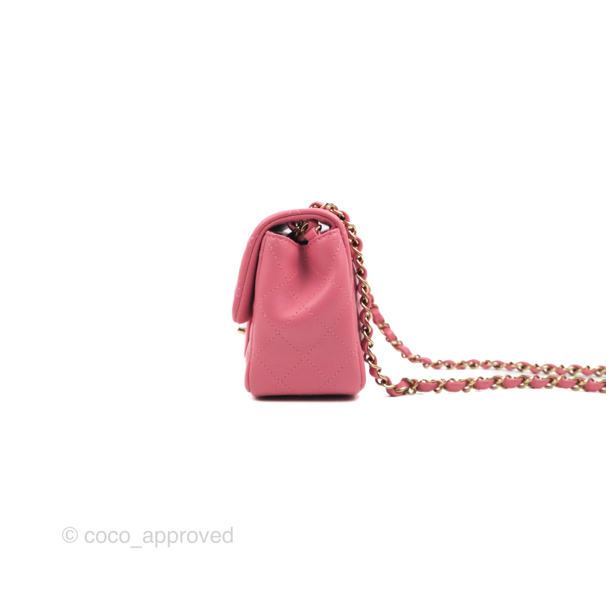 Chanel Mini Square Flap Pink Lambskin Gold Hardware is now sold. Please subscribe for any updates if similar item becomes available.