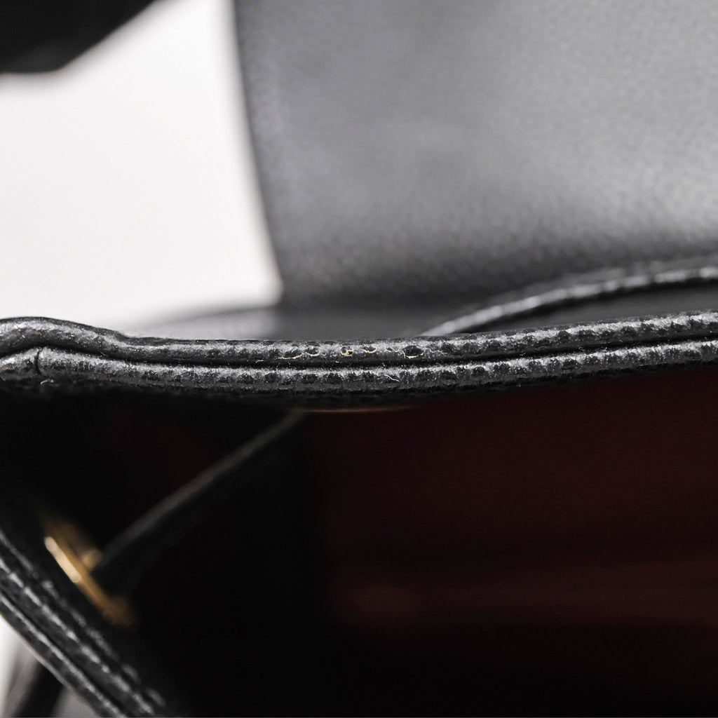 9.4/10 excellent to mint condition. Dent on front and under flap. Marks on under flap and interior. Leather softened.