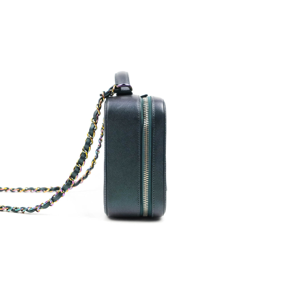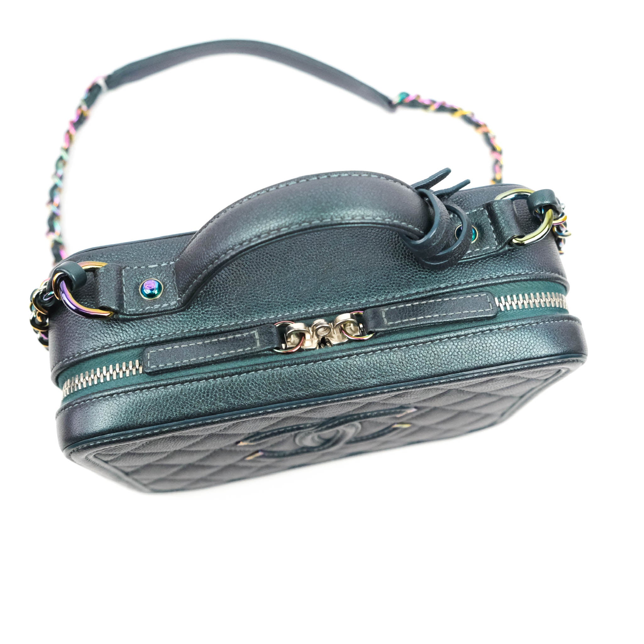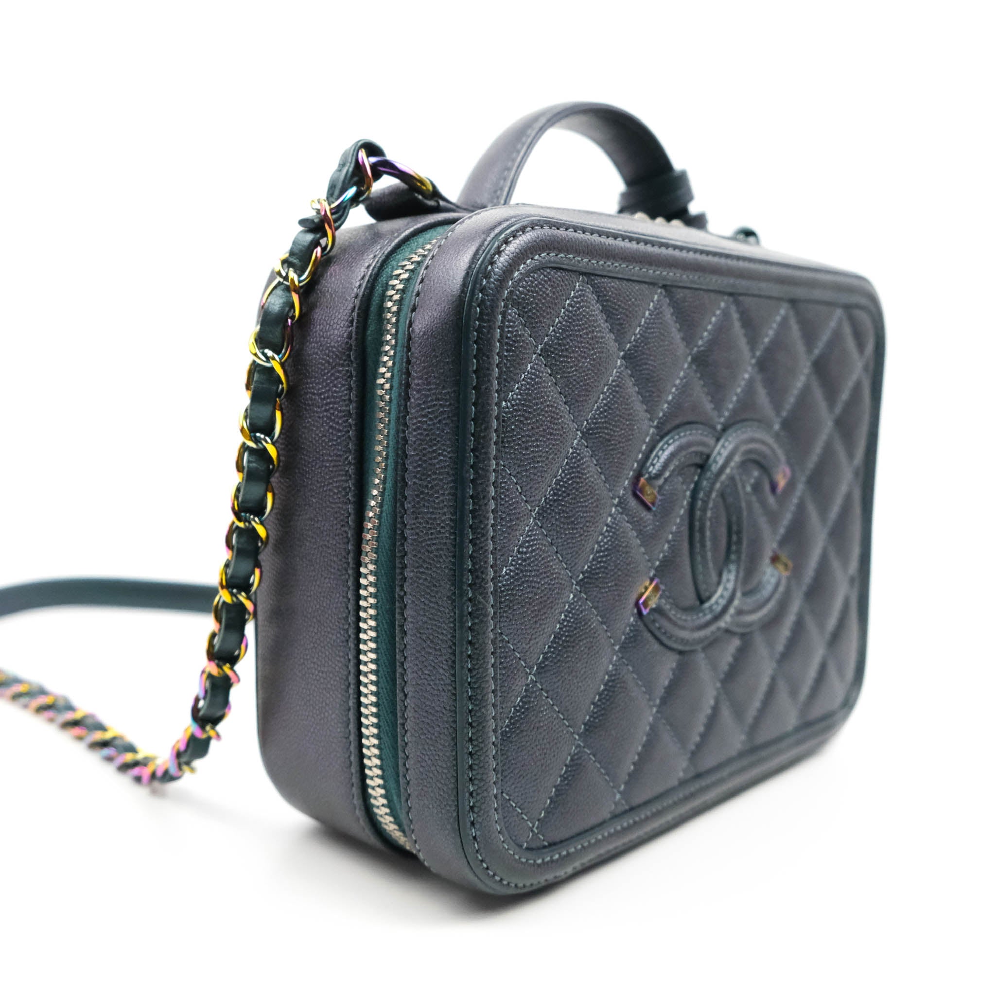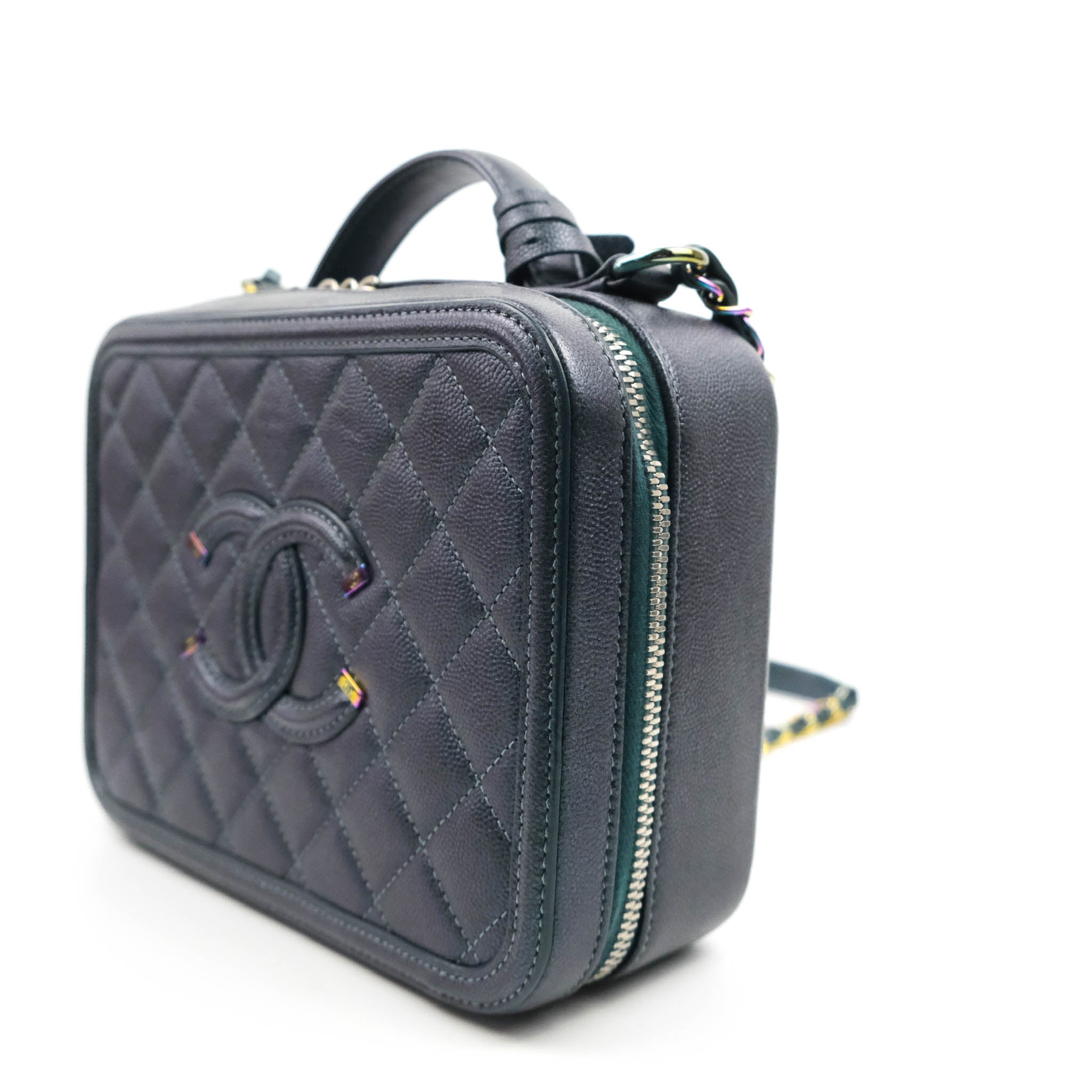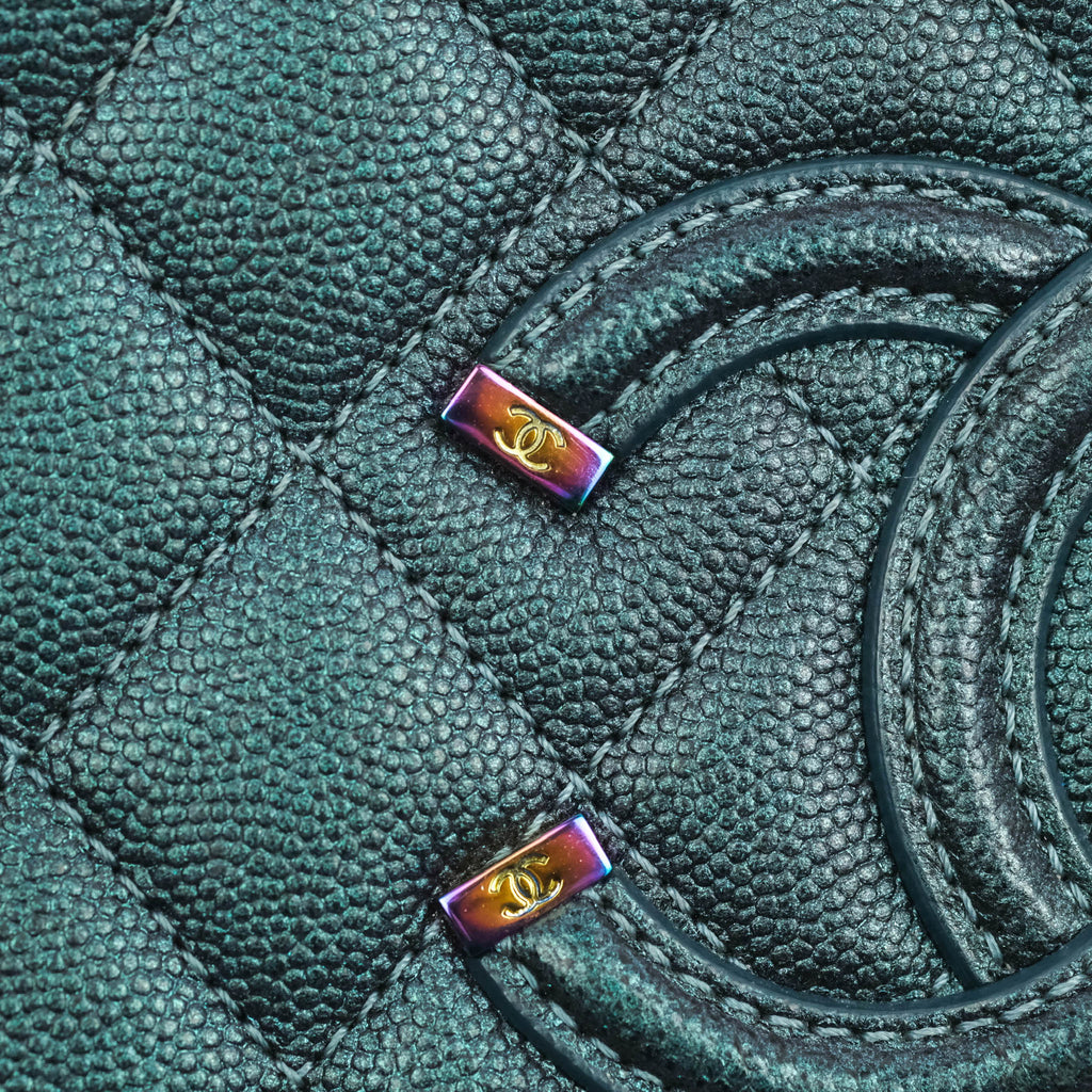 Chanel Quilted Medium CC Filigree Vanity Case Iridescent Dark Turquoise Caviar Rainbow Hardware
