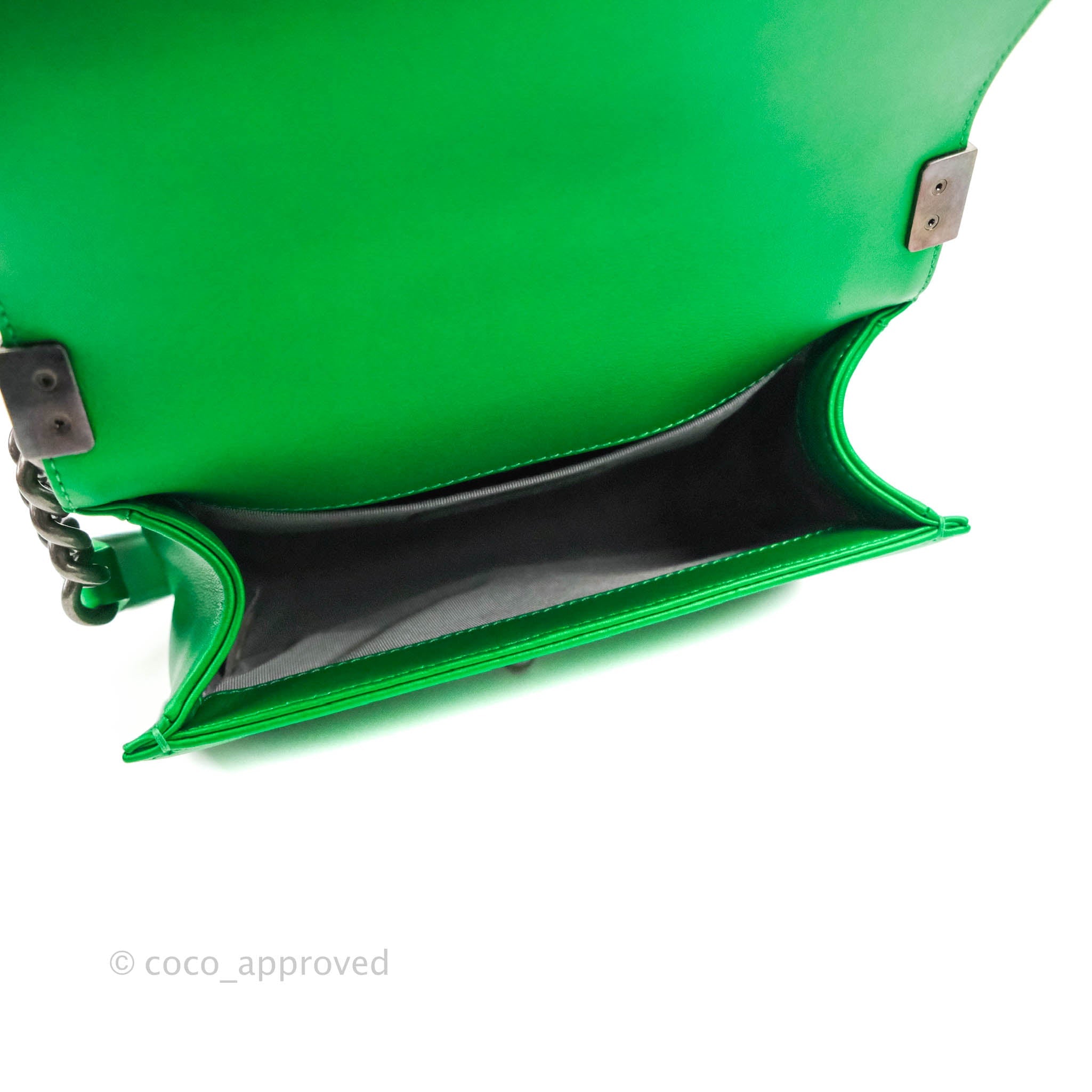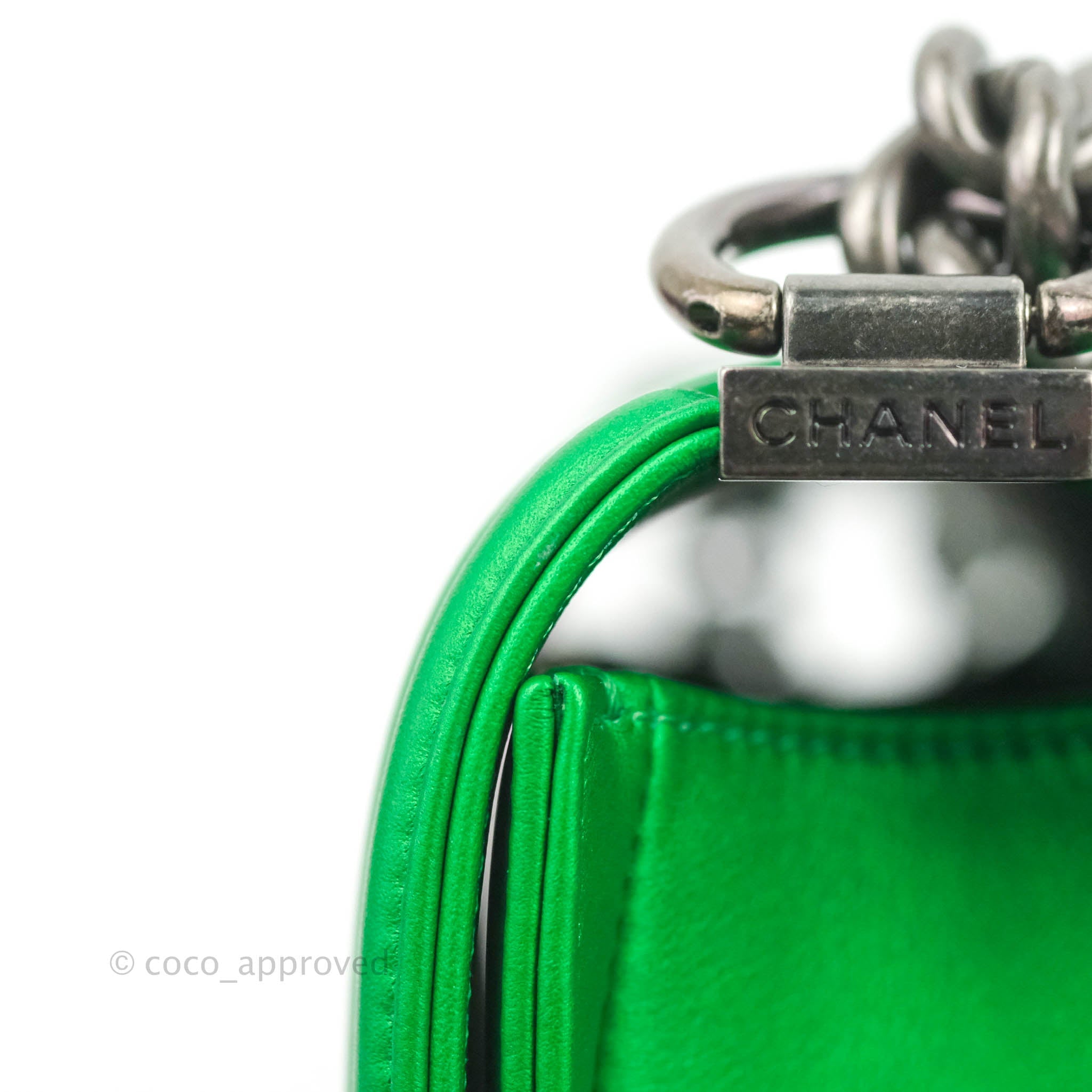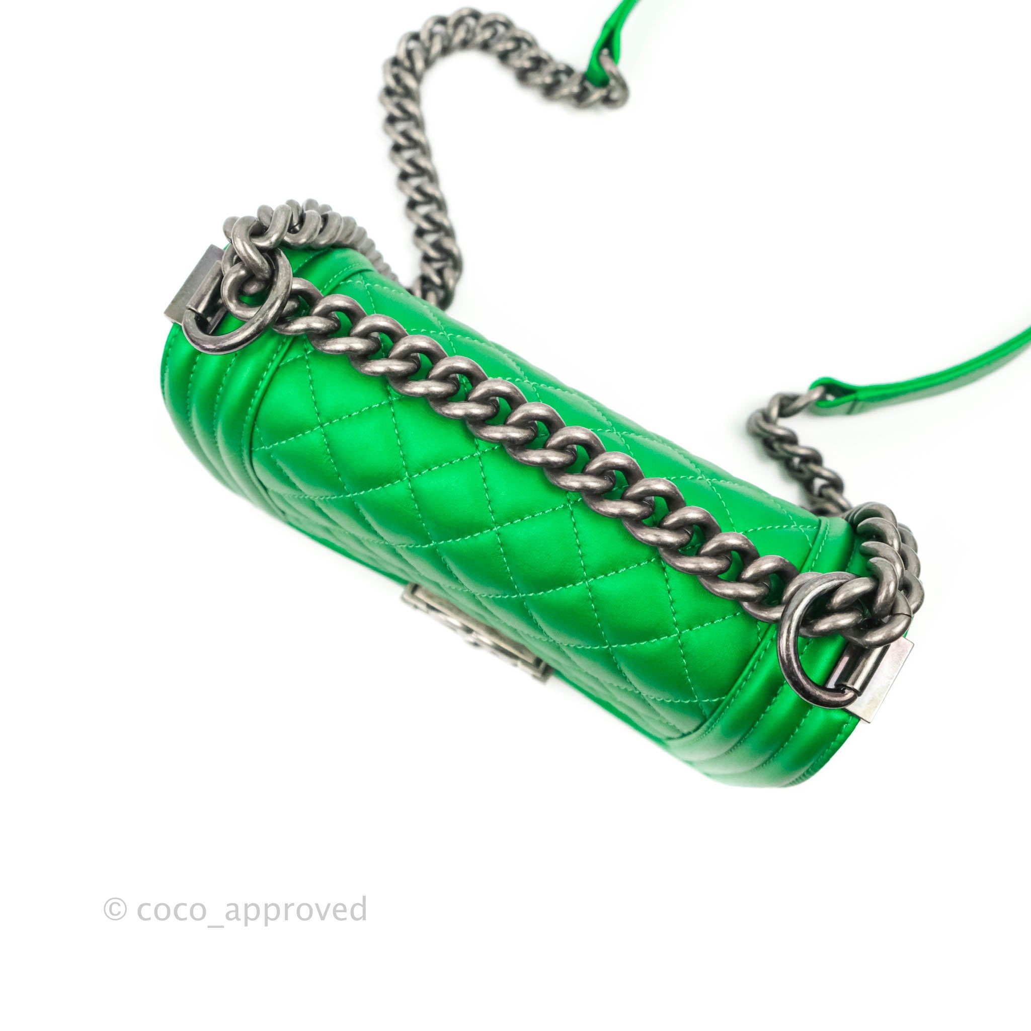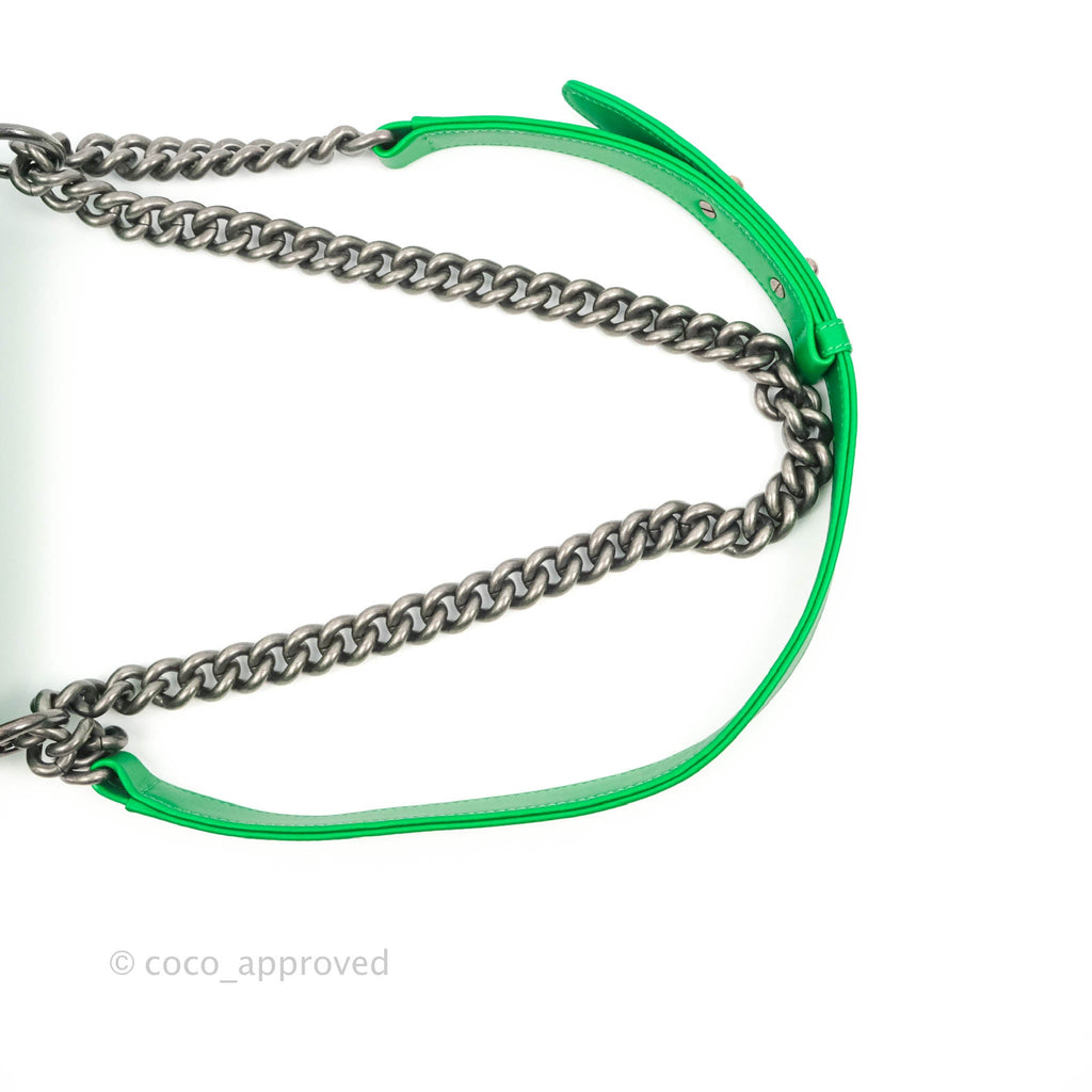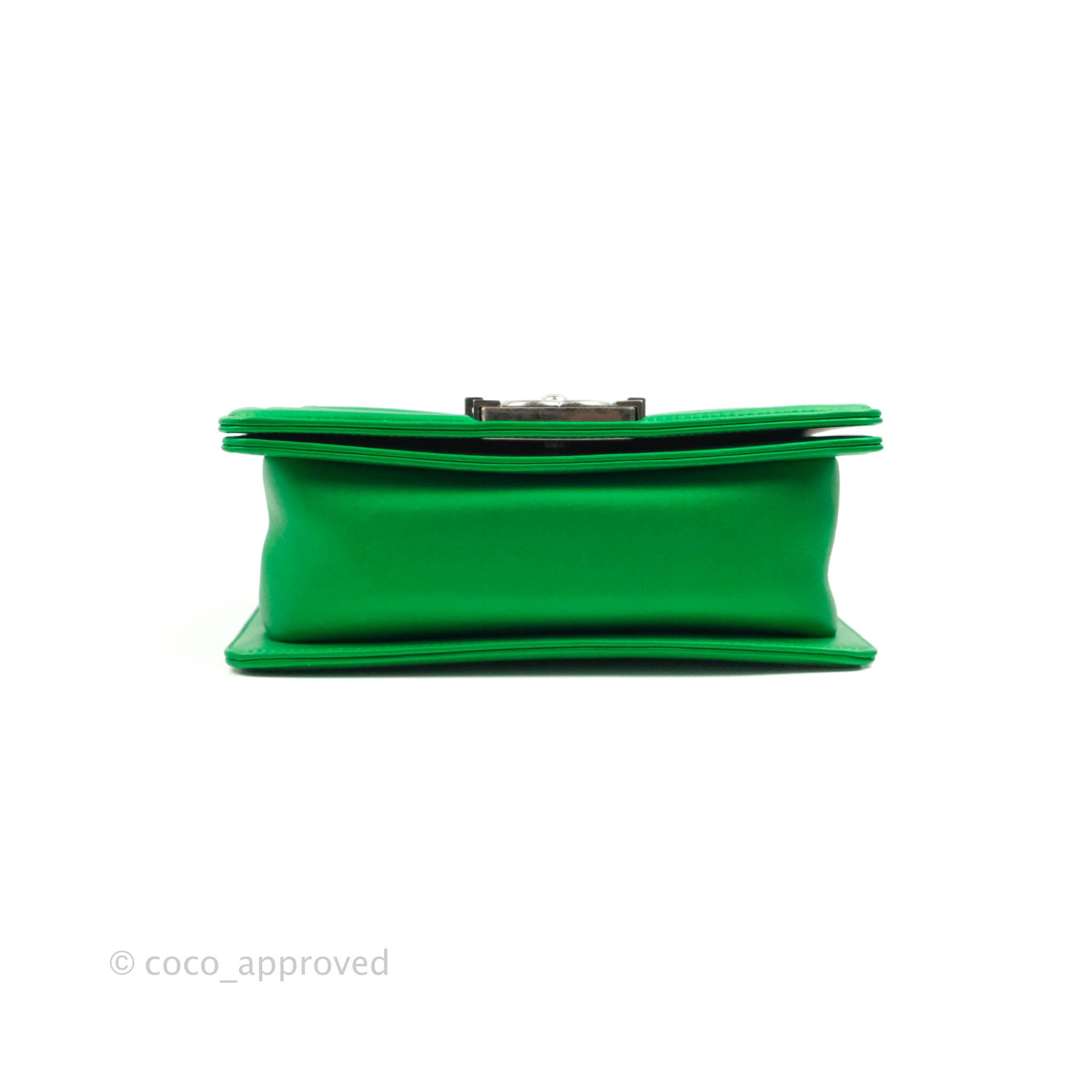 Chanel Small Boy Green Calfskin Ruthenium Hardware is now sold. Please subscribe for any updates if similar item becomes available.