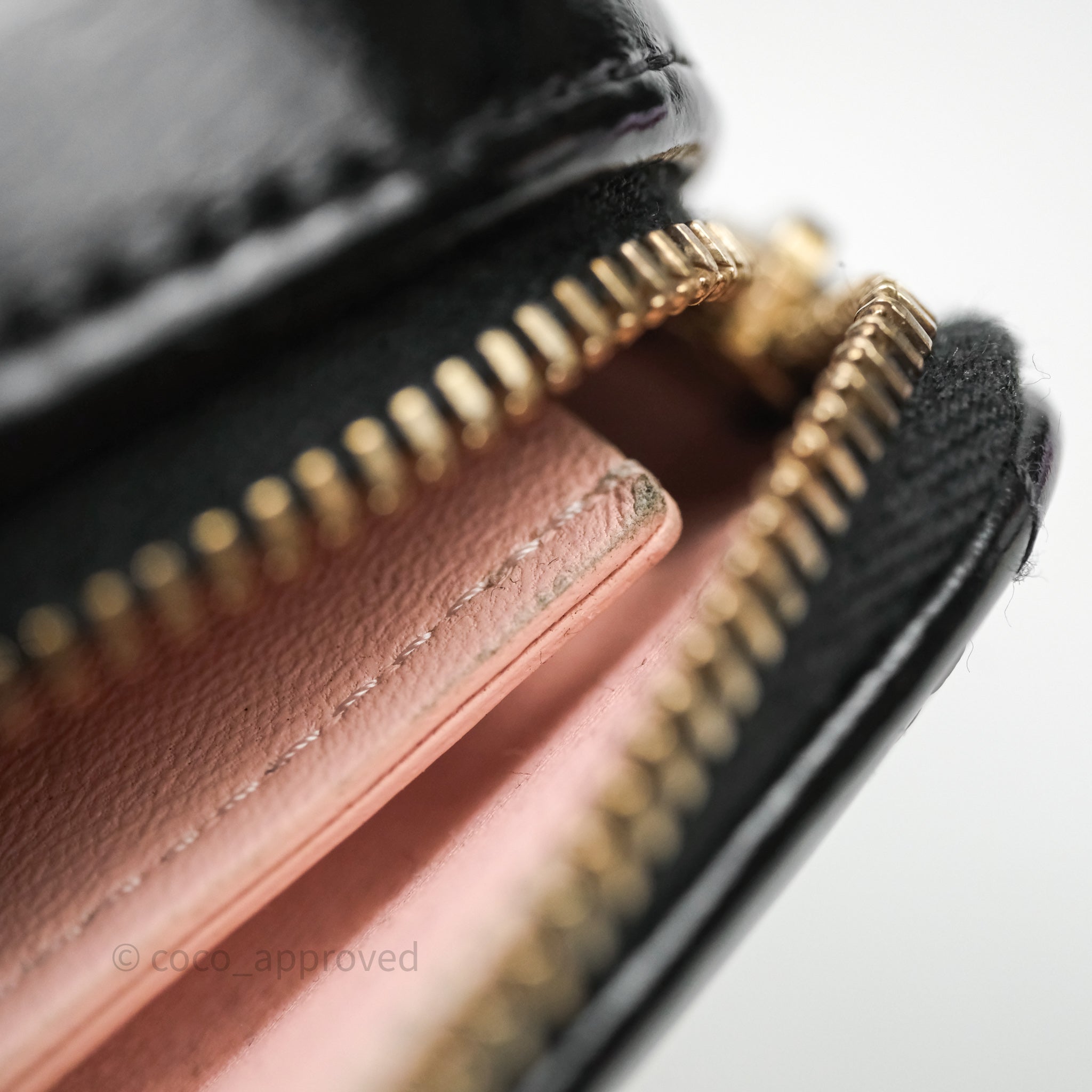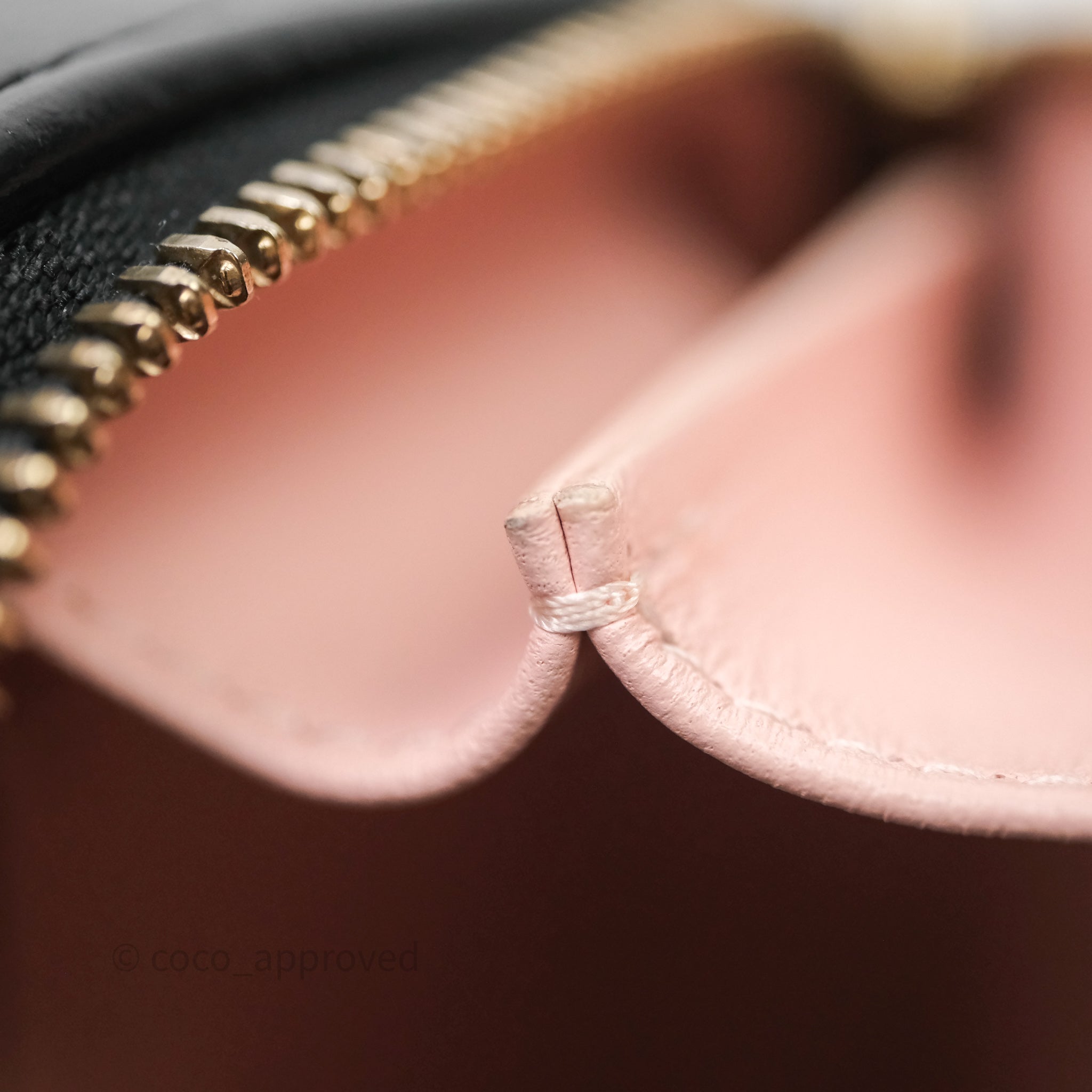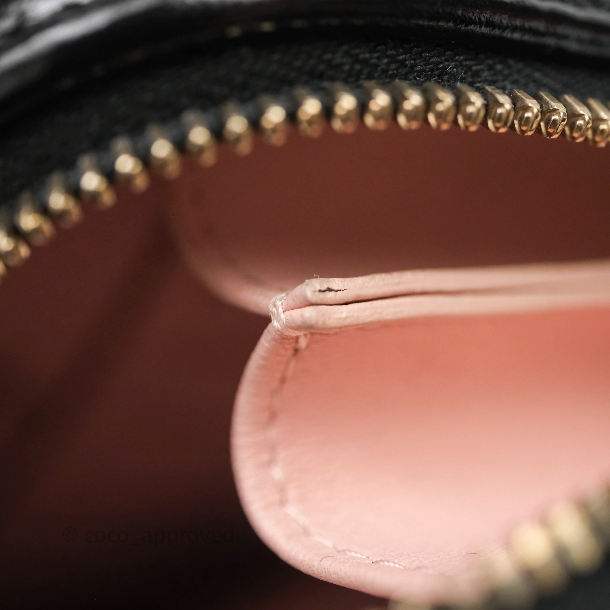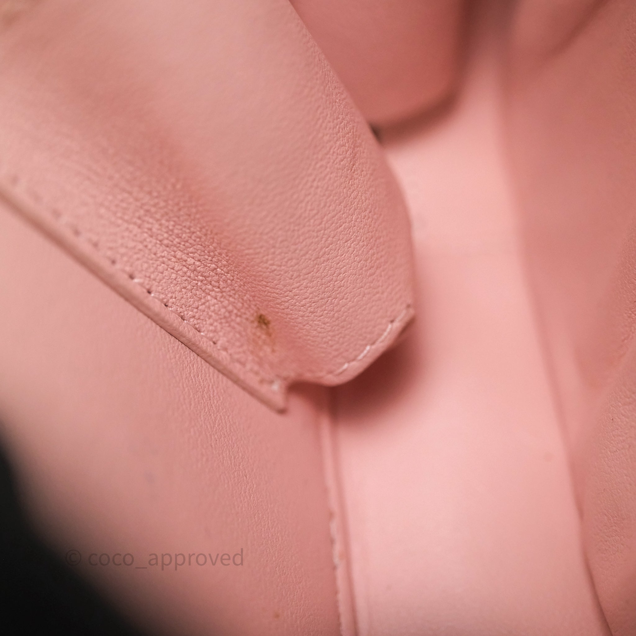 9.4/10 excellent to mint condition. Hairlines on hardware. Dent and mark in interior. Minor rubbing on corner.