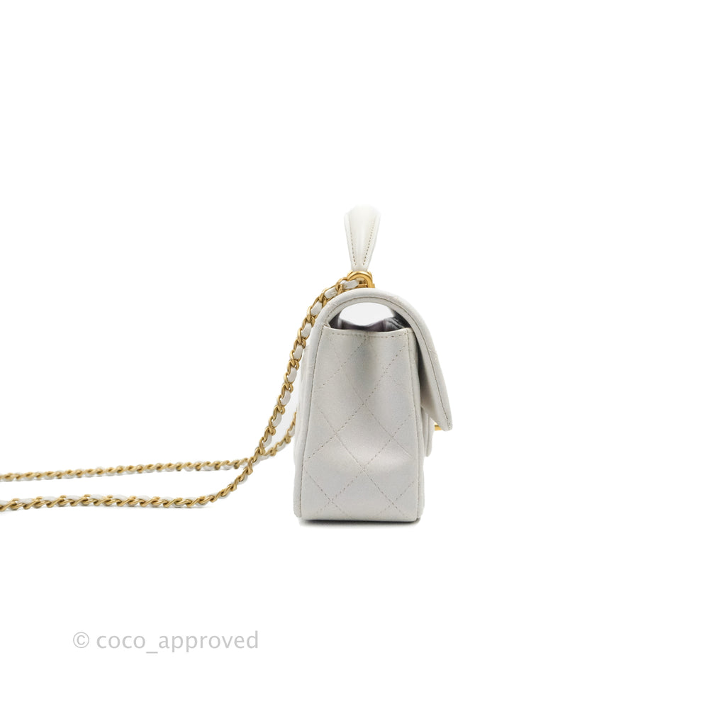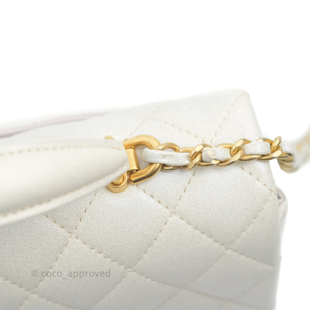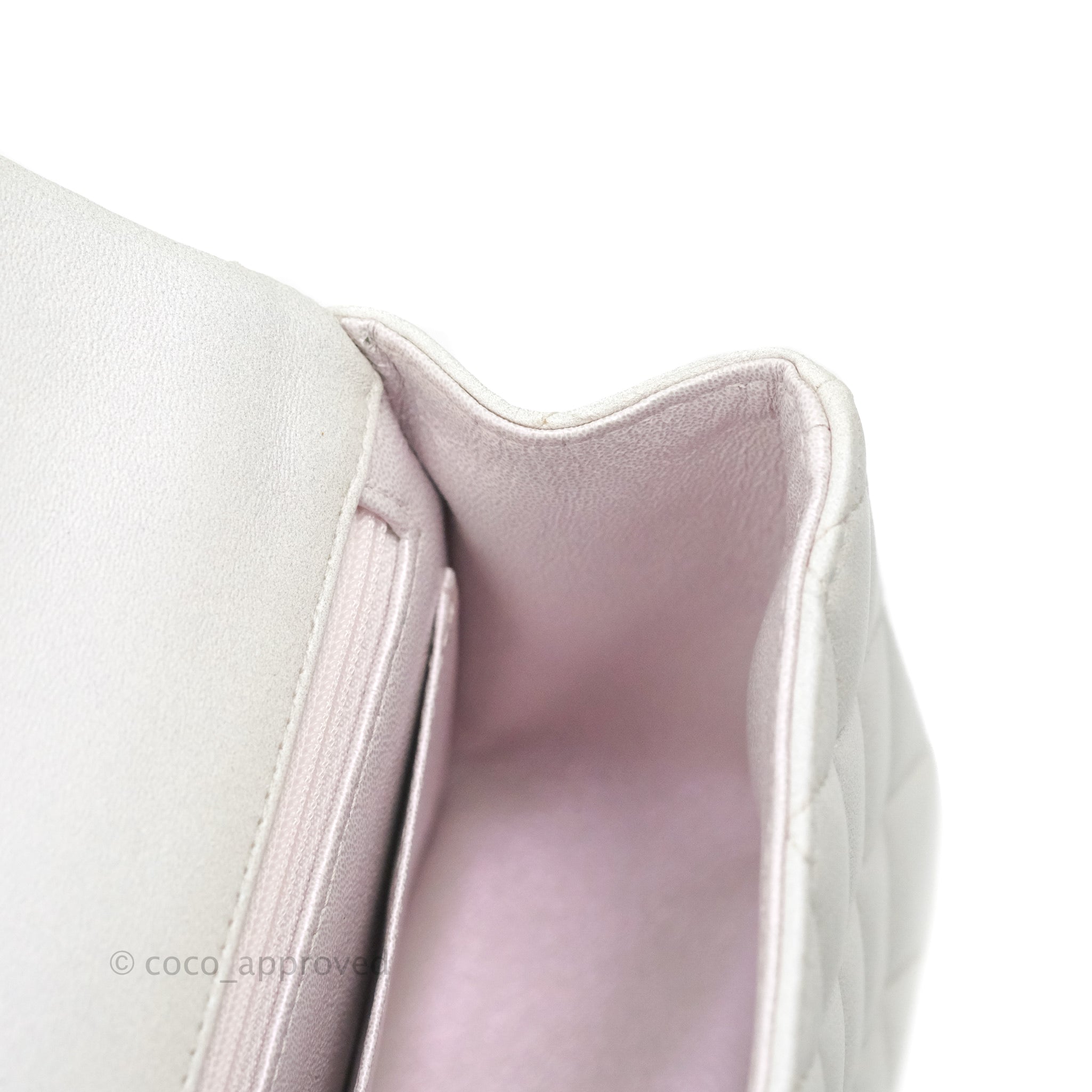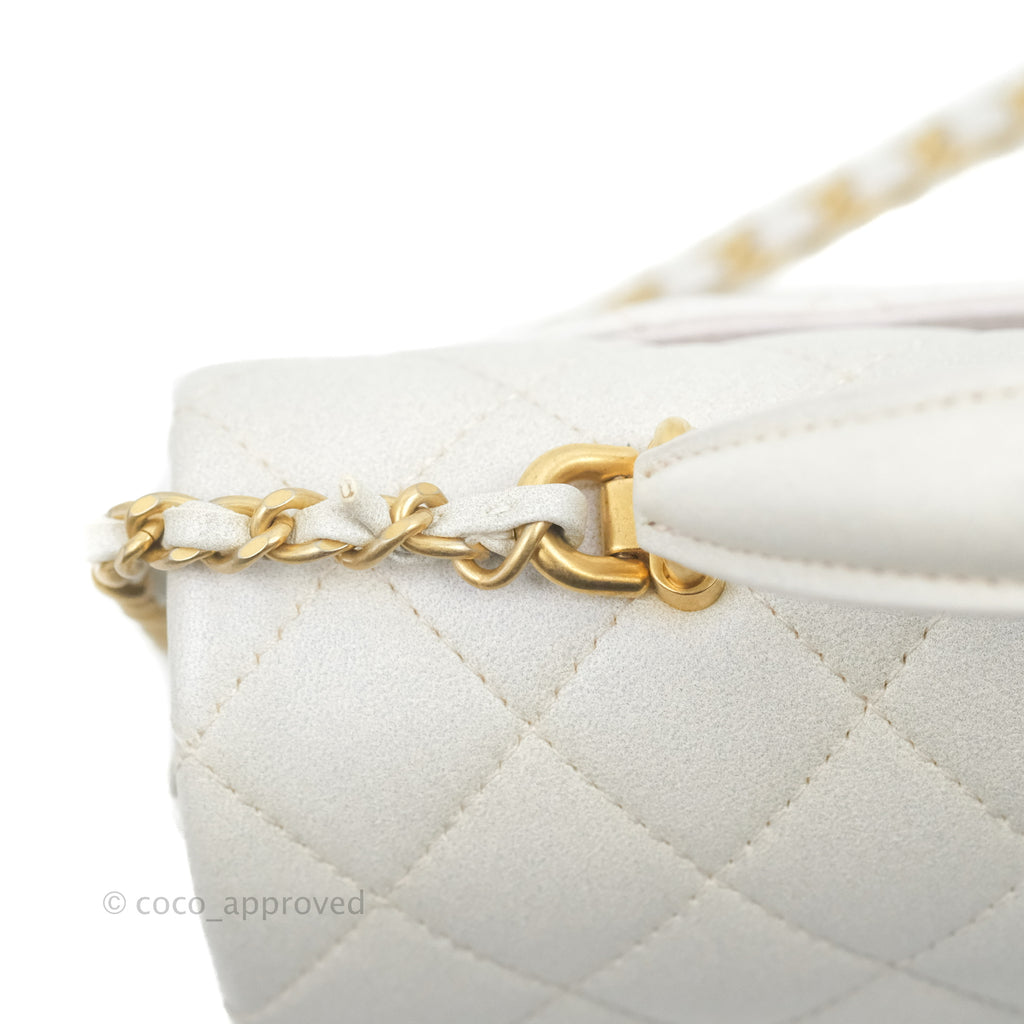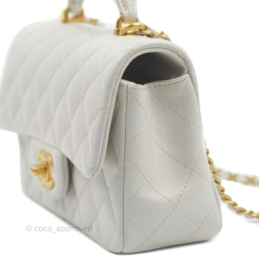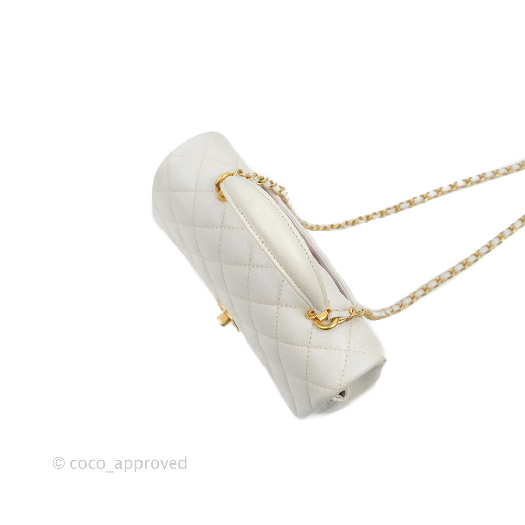 Chanel Top Handle Mini Rectangular Flap Bag Iridescent White Lambskin Aged Gold Hardware