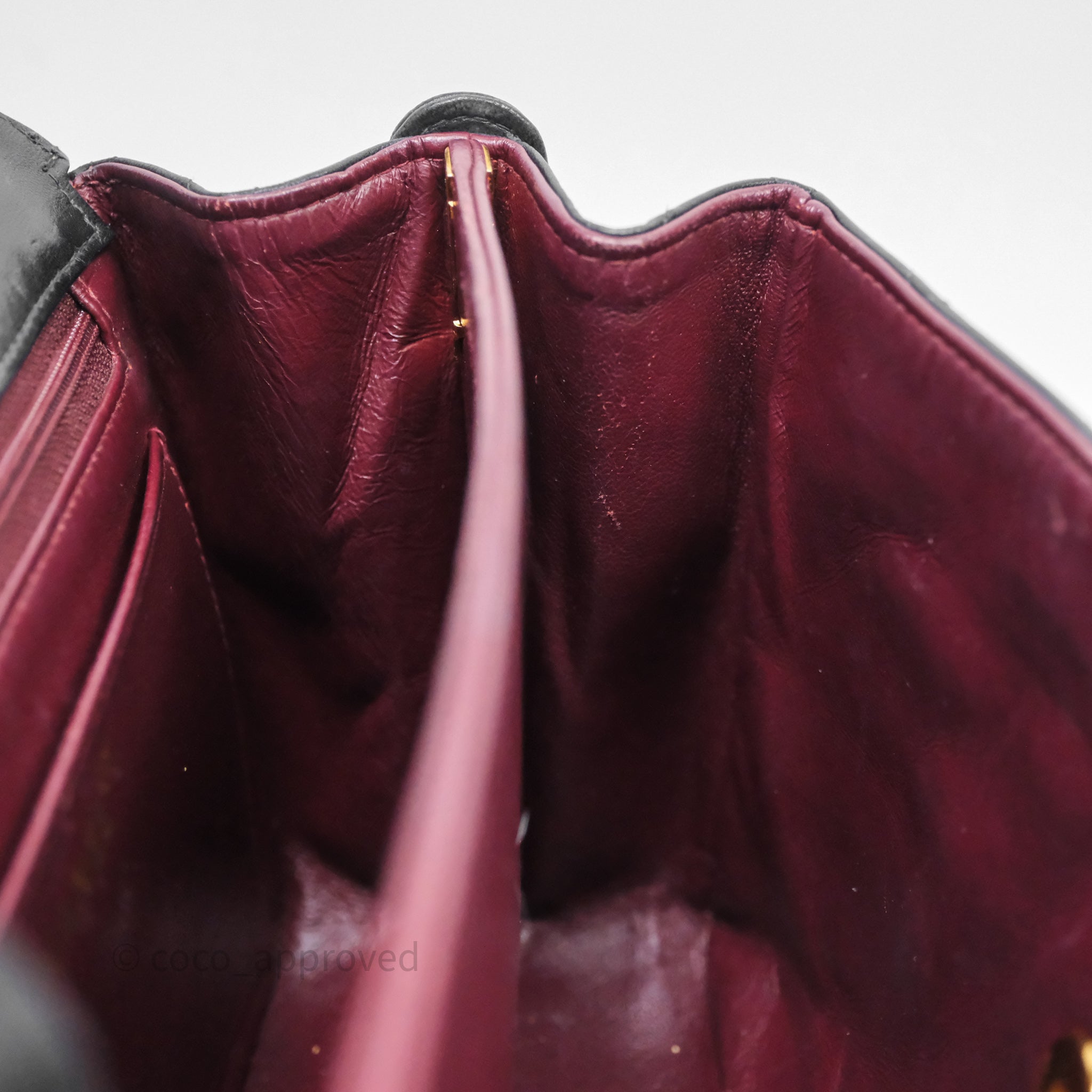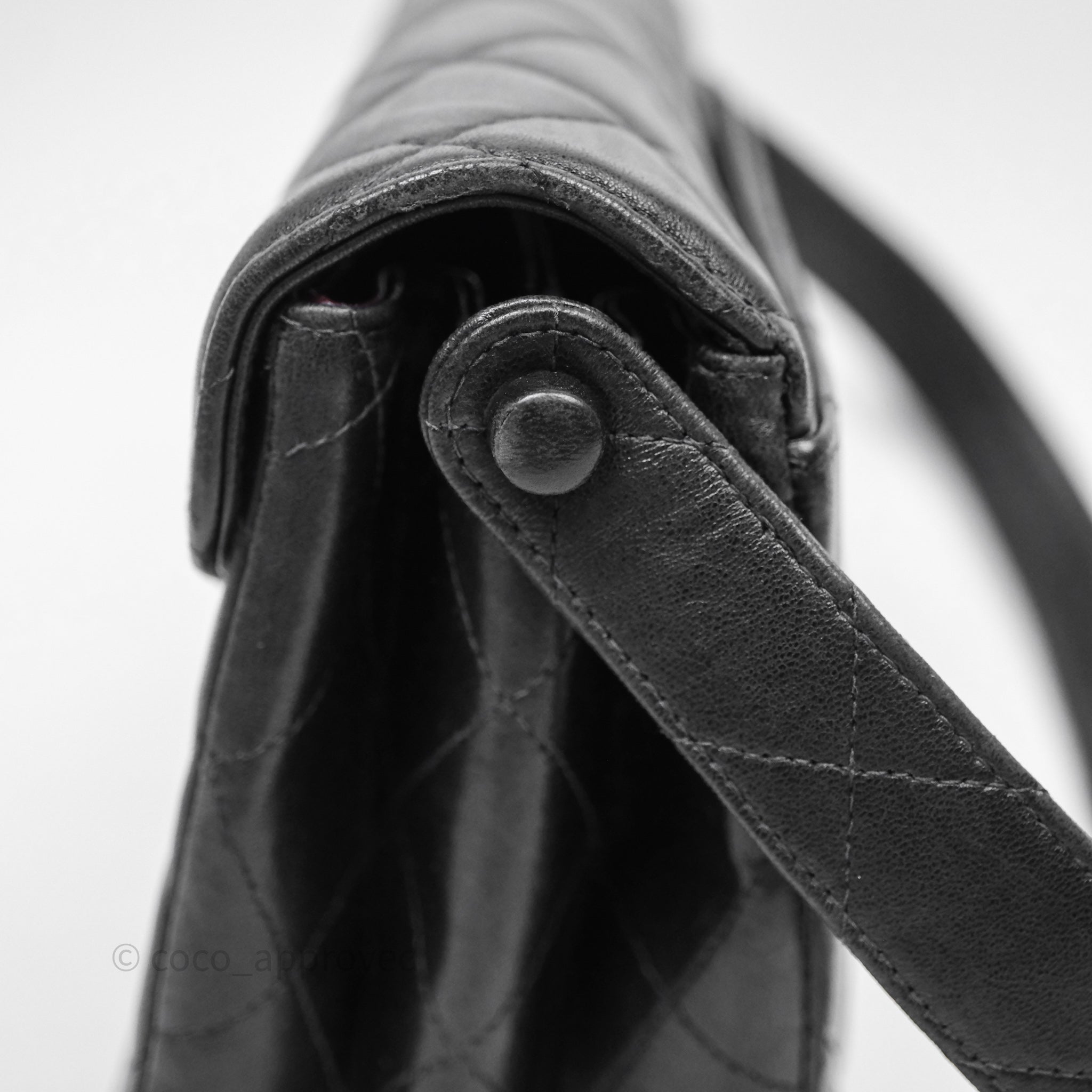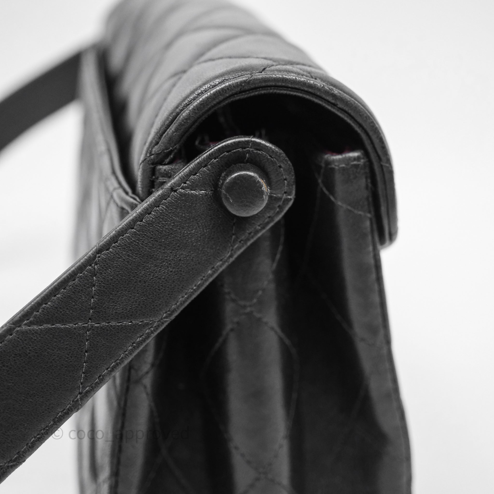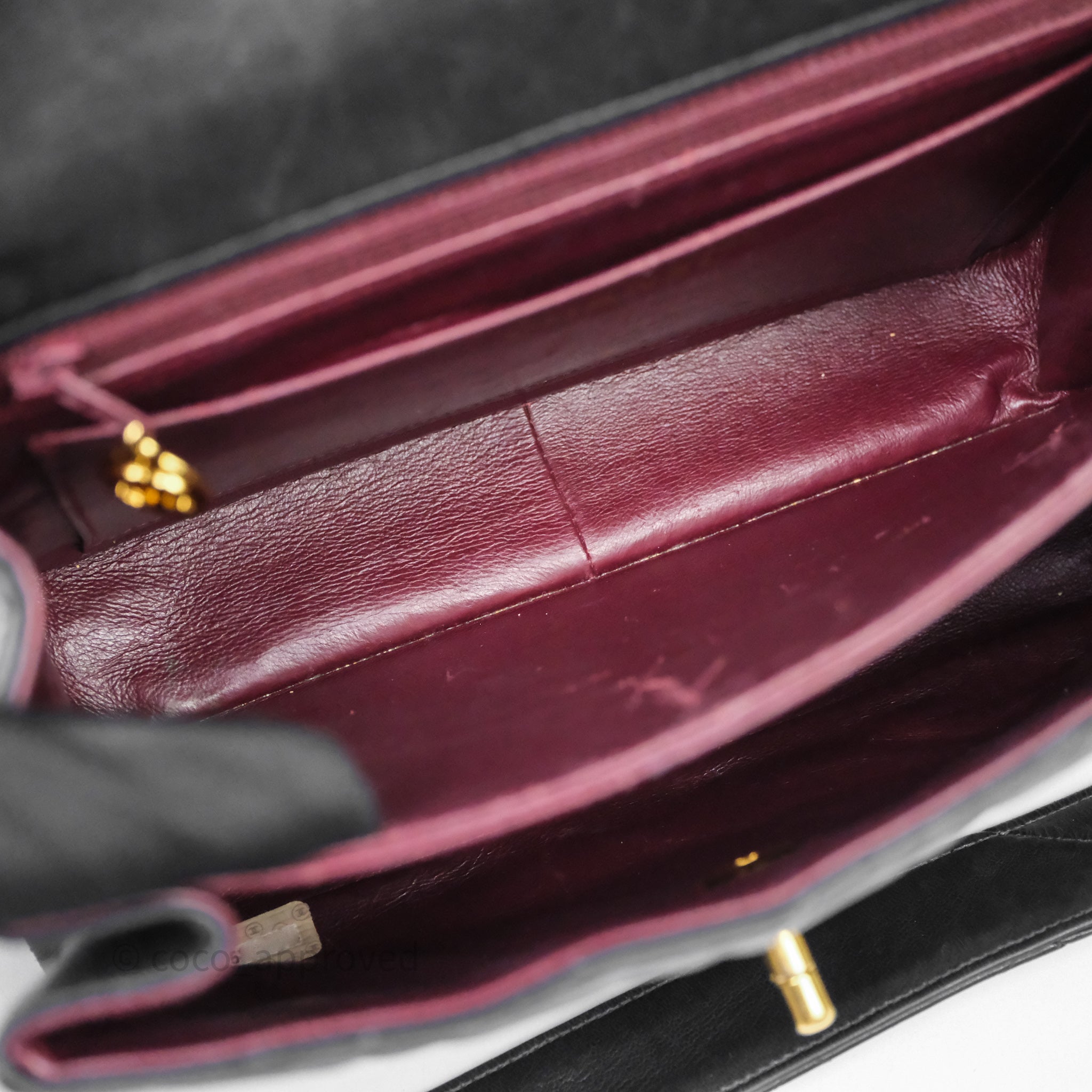 Vintage rank B. Rubbing on corners, rims and strap. Scratches and marks on surfaces under flap and interior. Scratches on hardware.