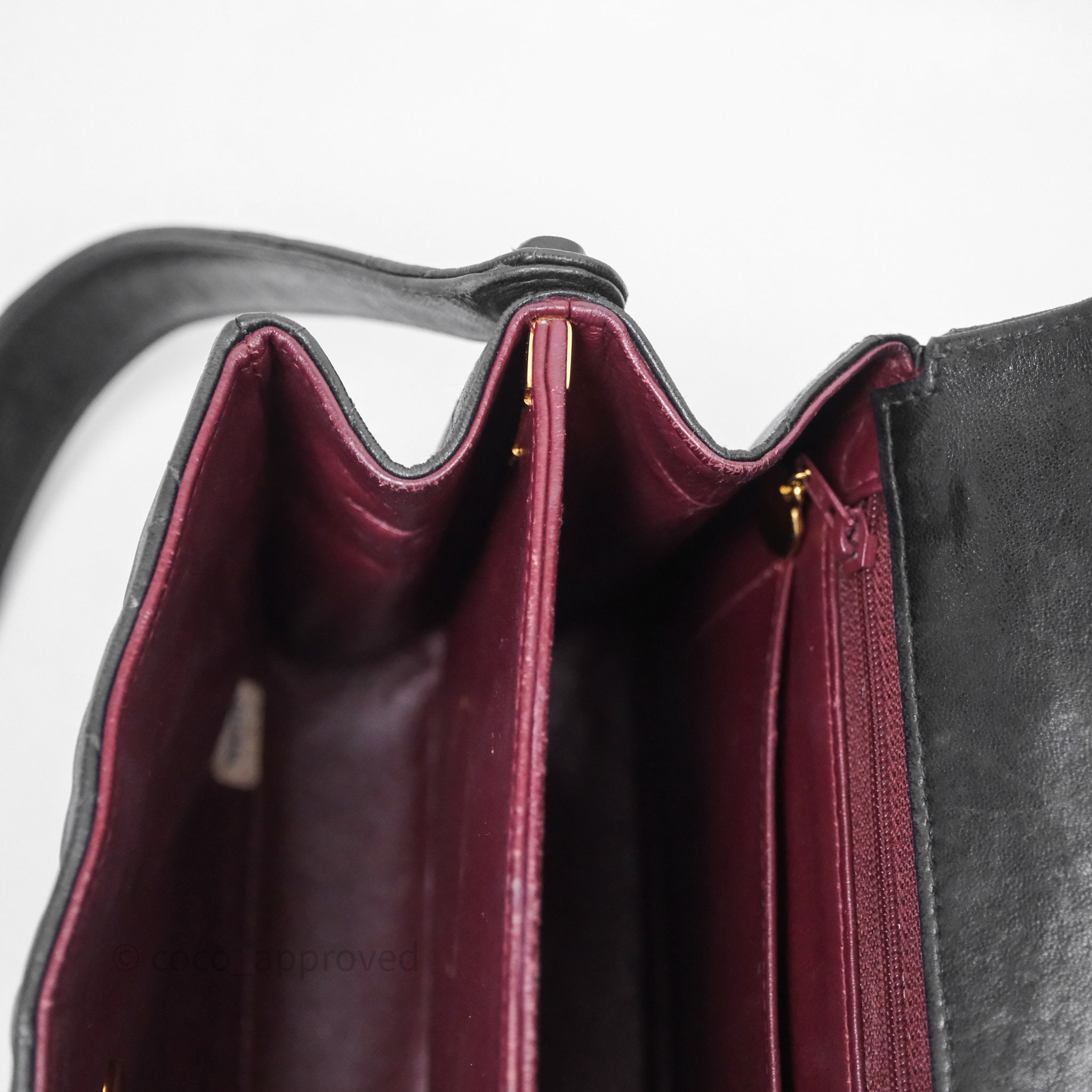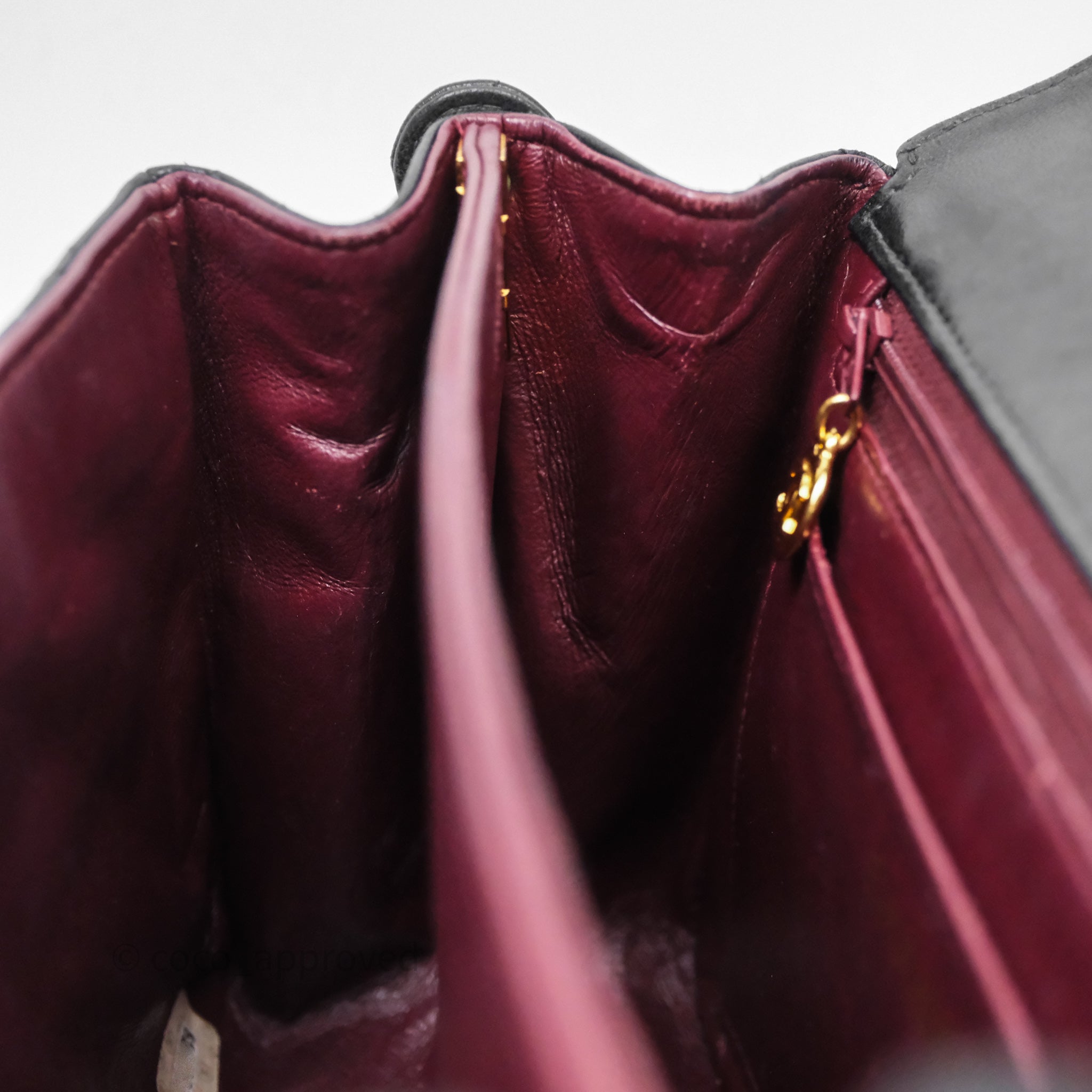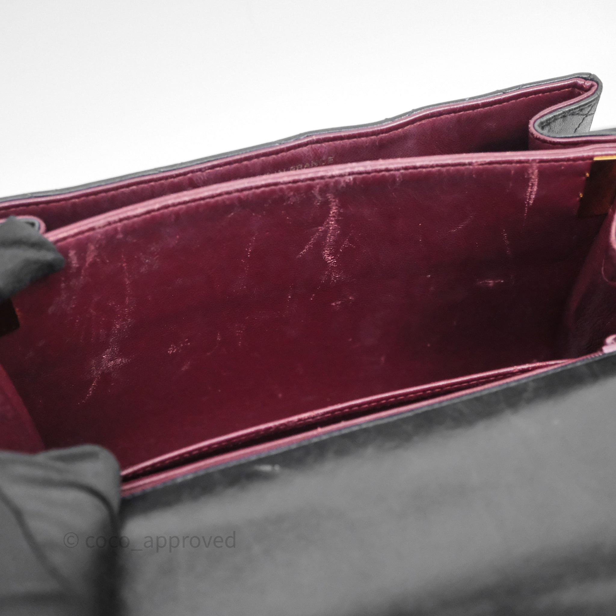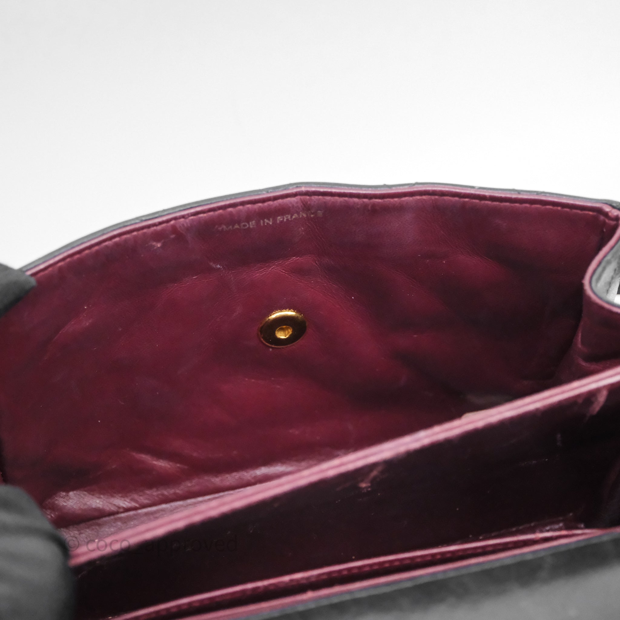 Vintage rank B. Rubbing on corners, rims and strap. Scratches and marks on surfaces under flap and interior. Scratches on hardware.