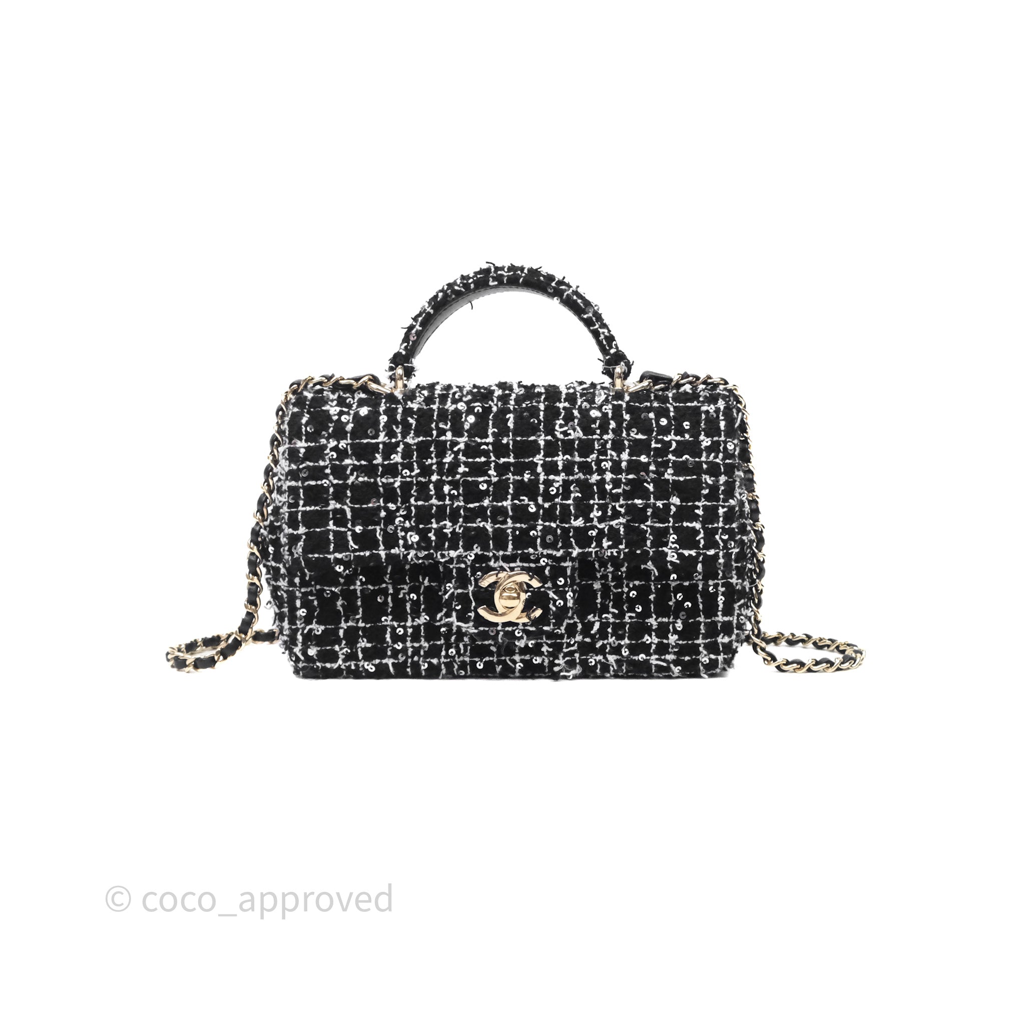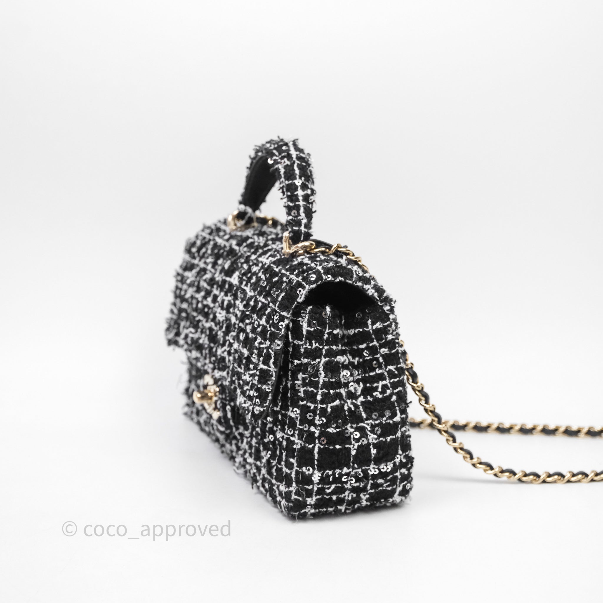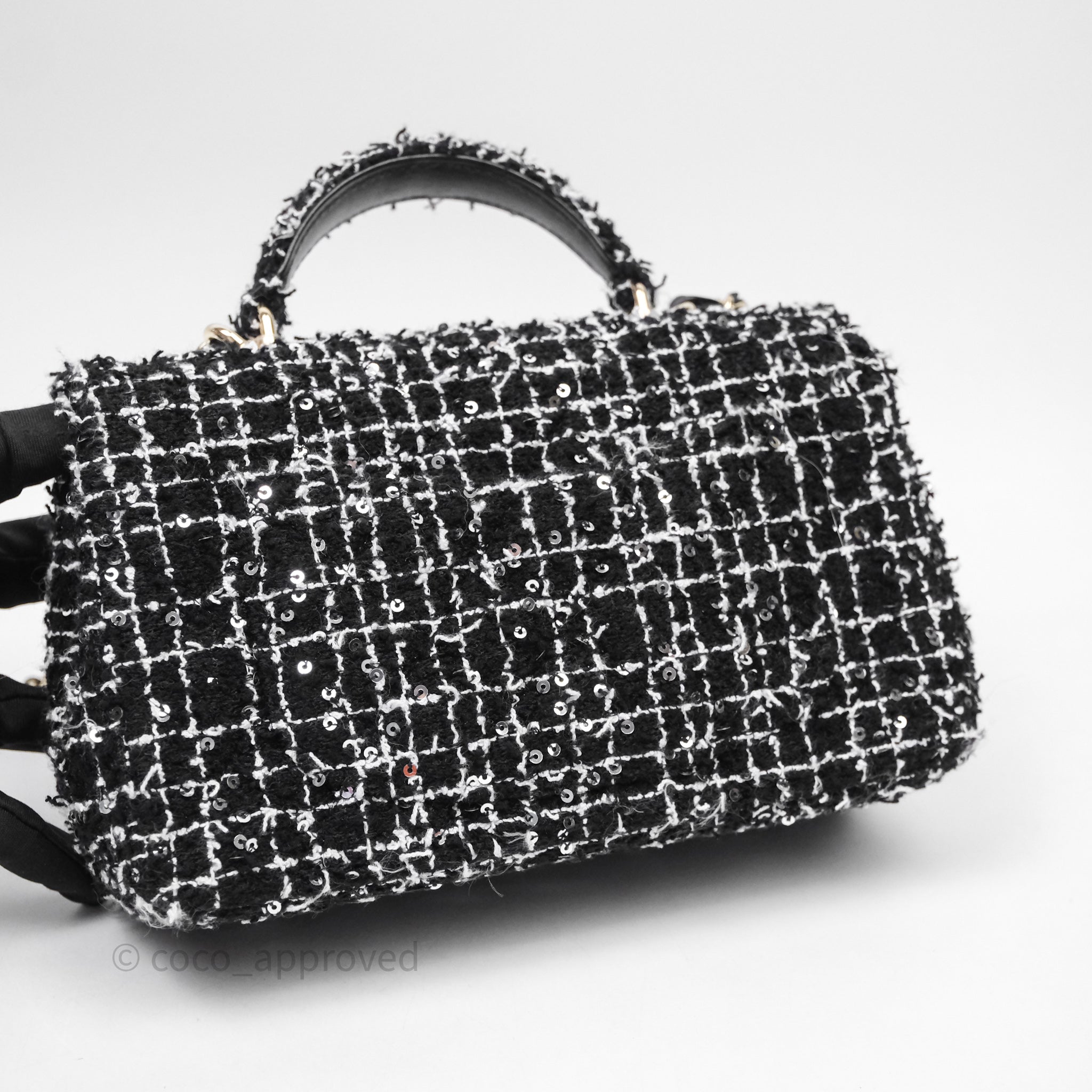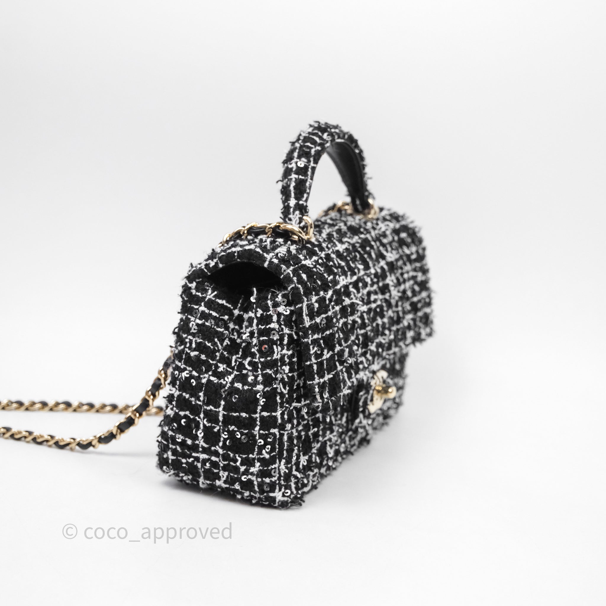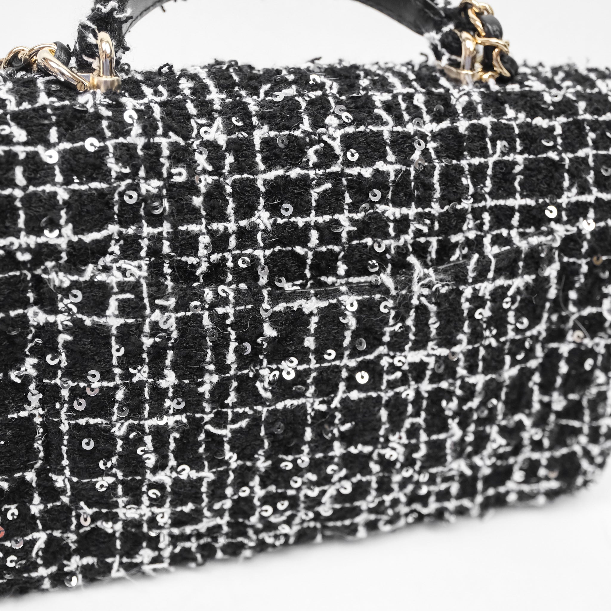 Chanel Top Handle Mini Rectangular Flap Black/ White Sequin Tweed Gold Hardware