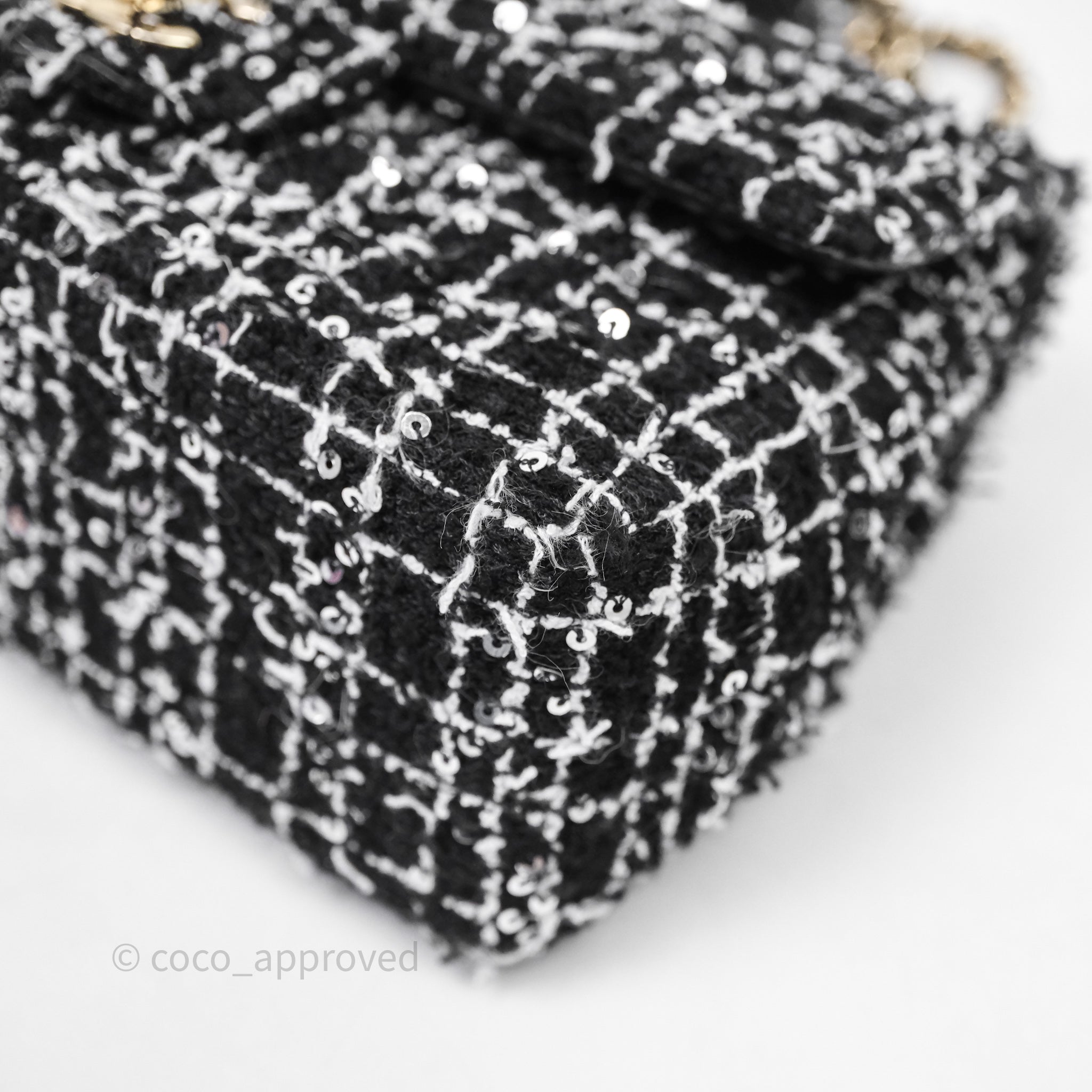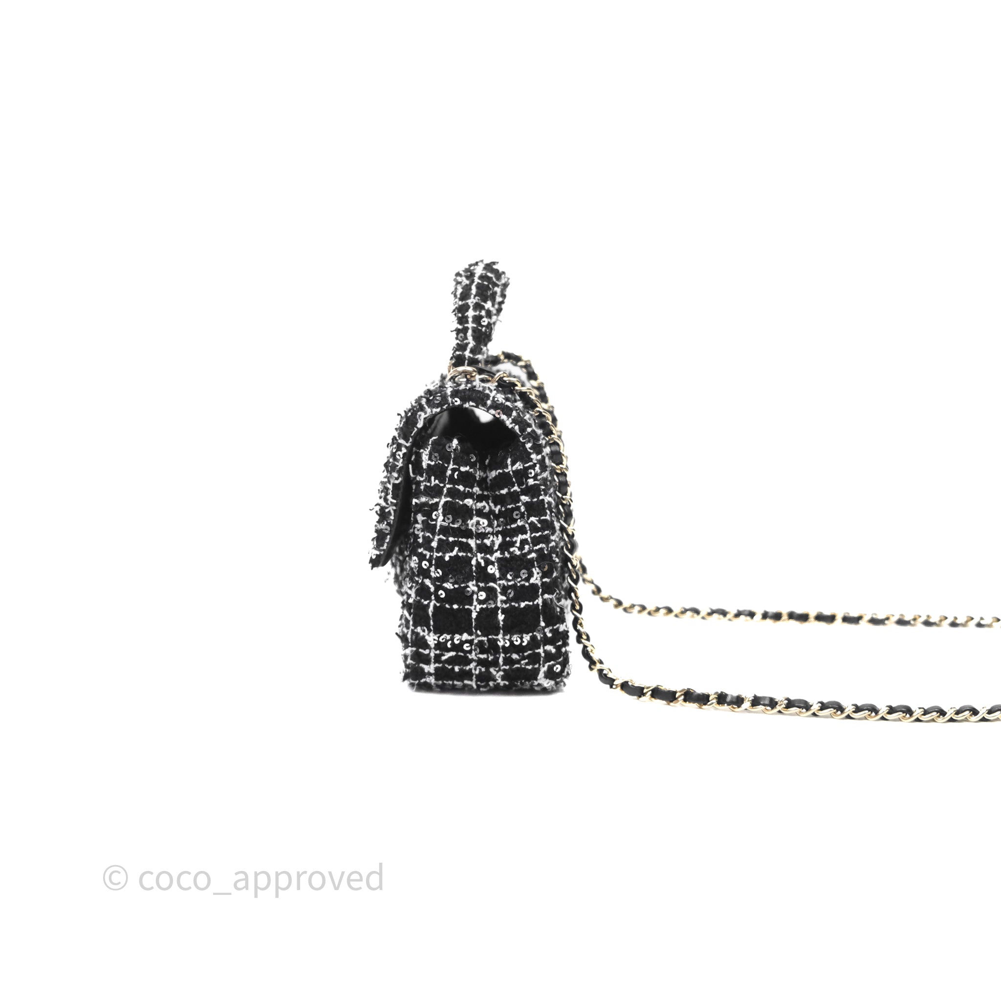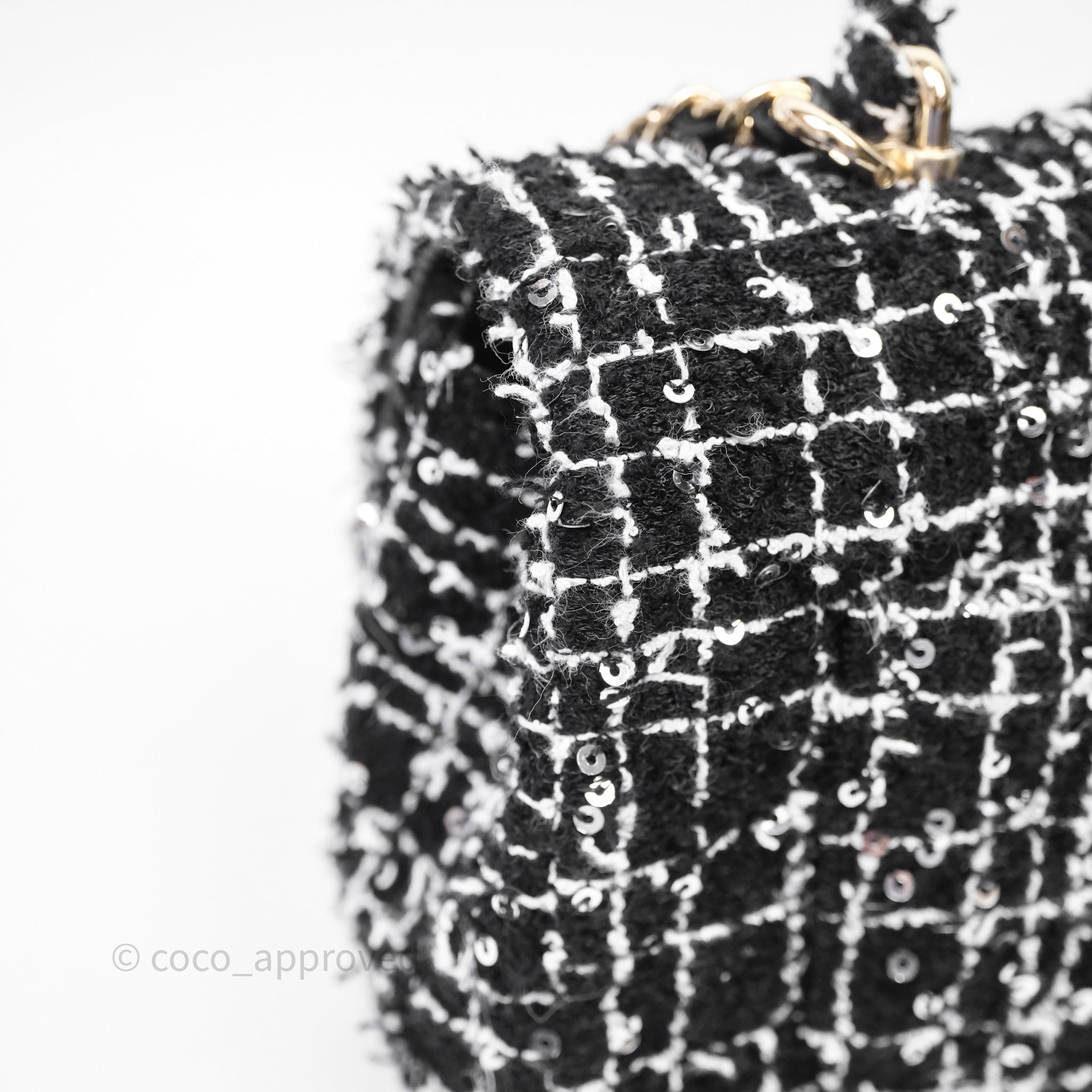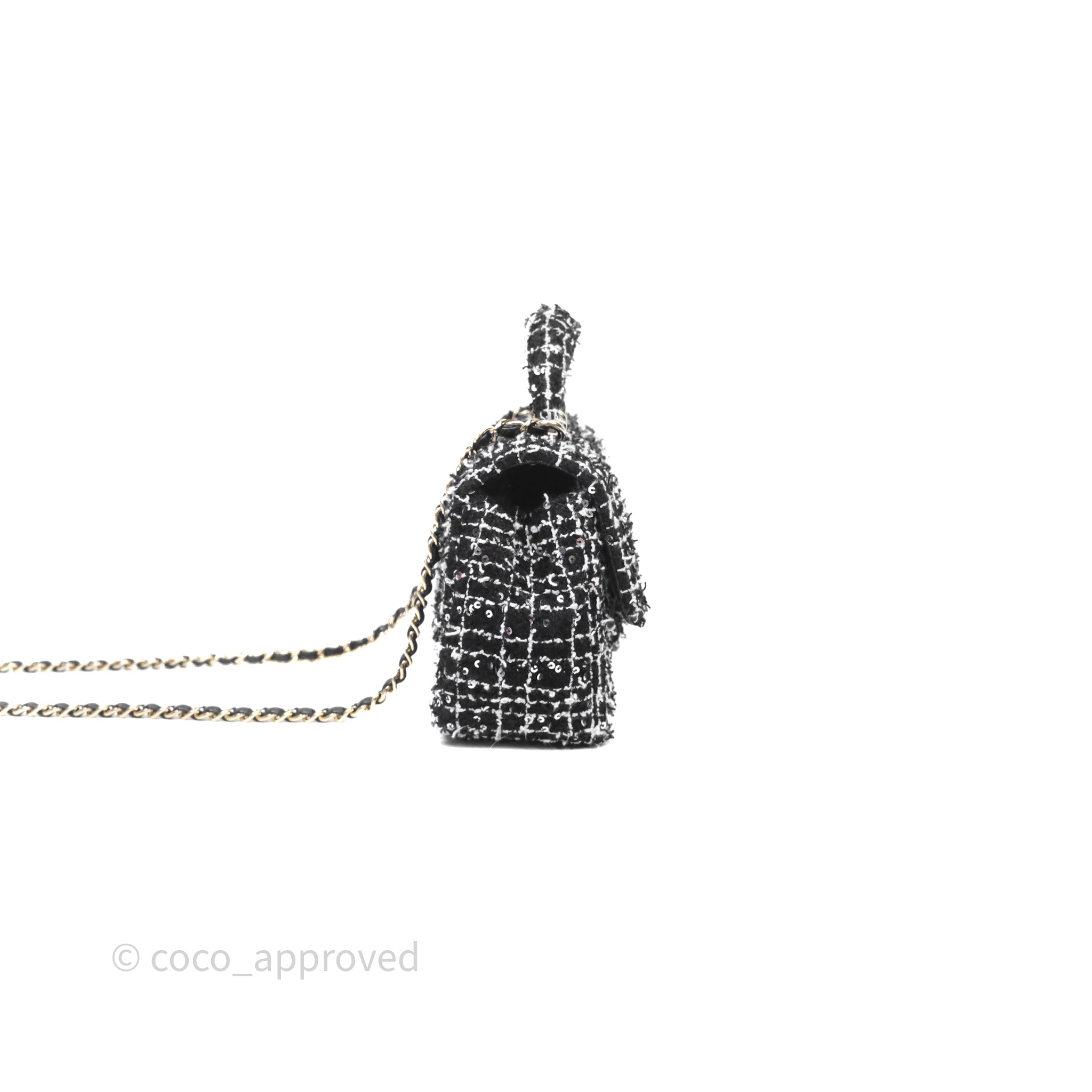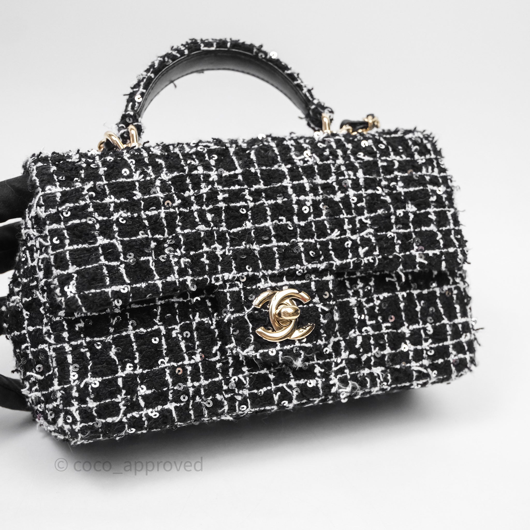 Chanel Top Handle Mini Rectangular Flap Black/ White Sequin Tweed Gold Hardware