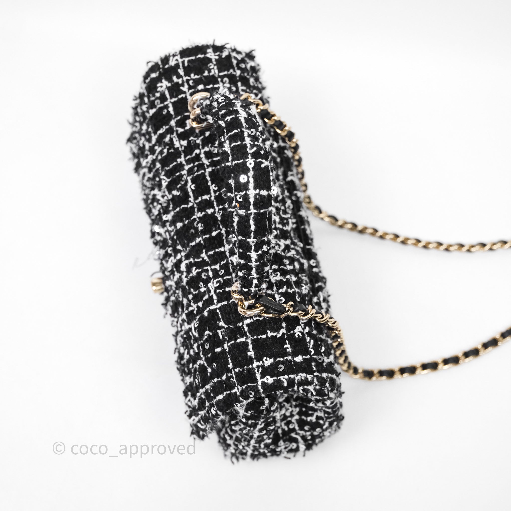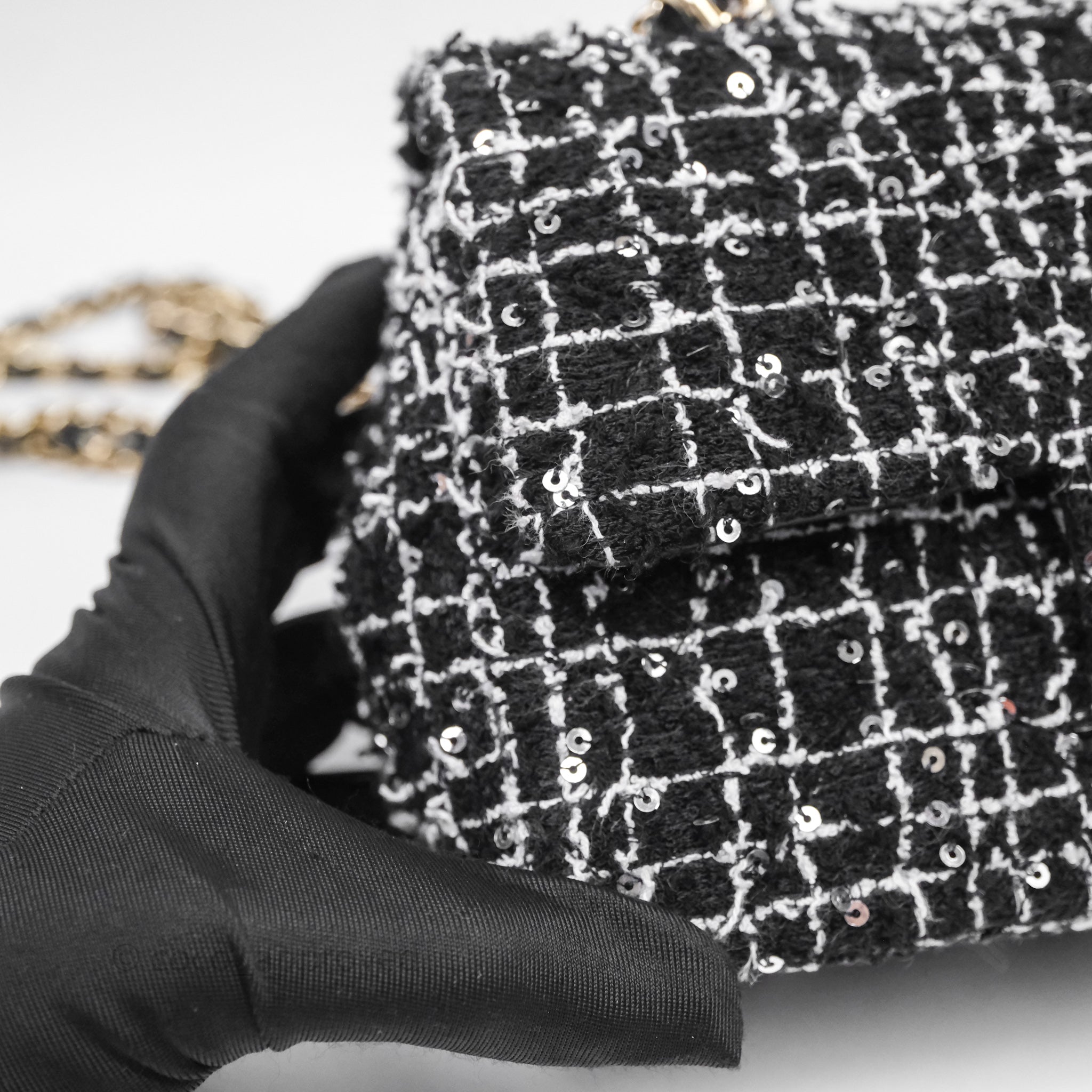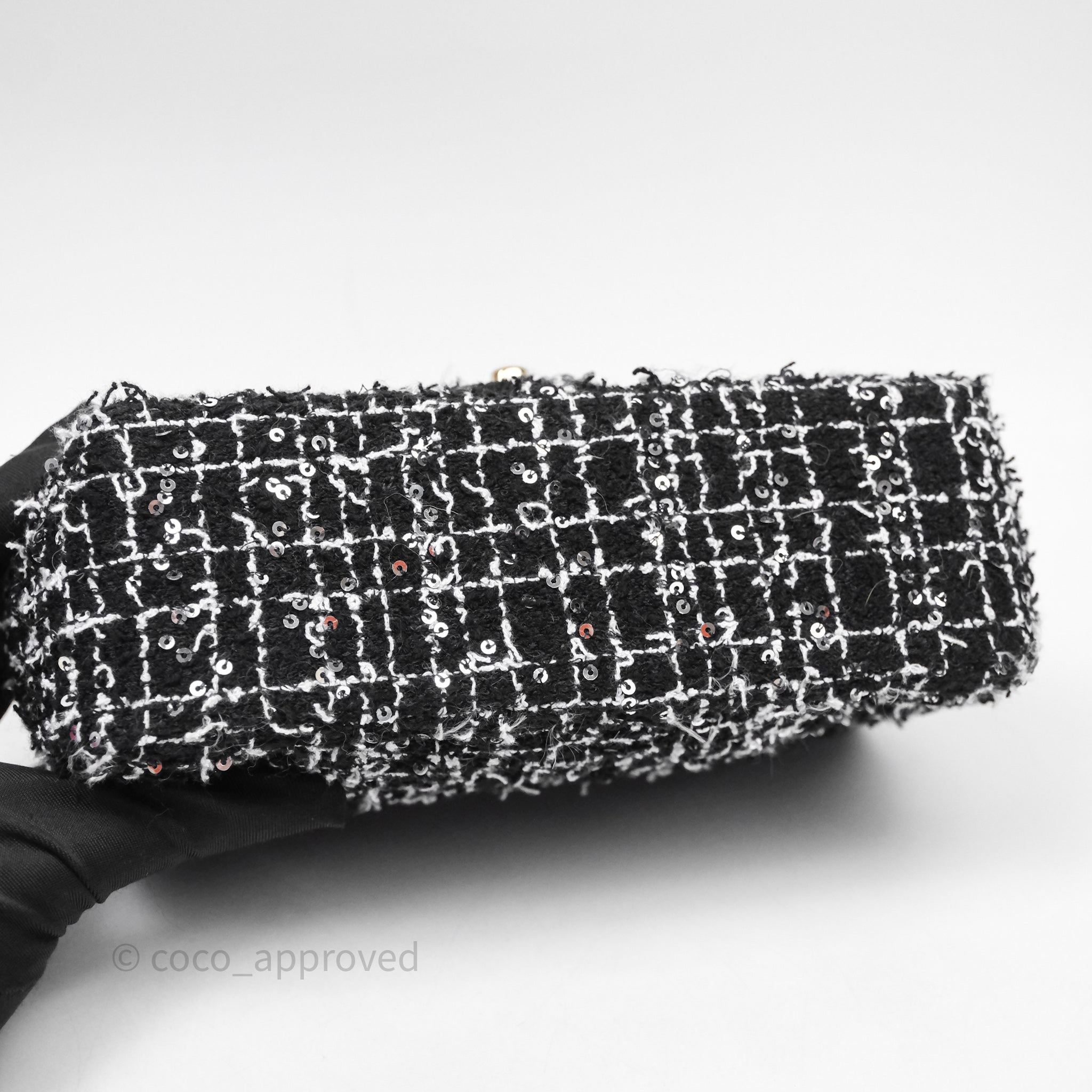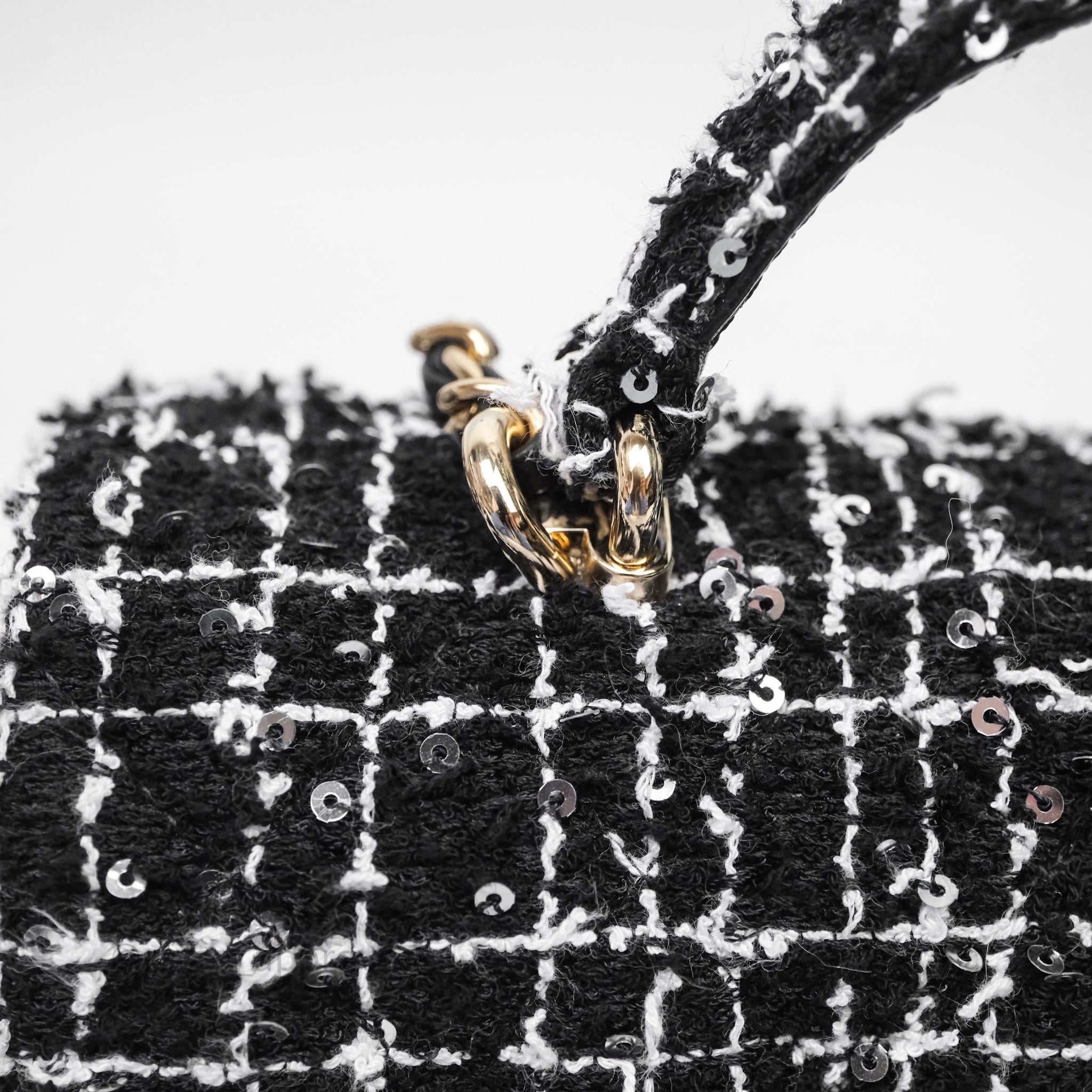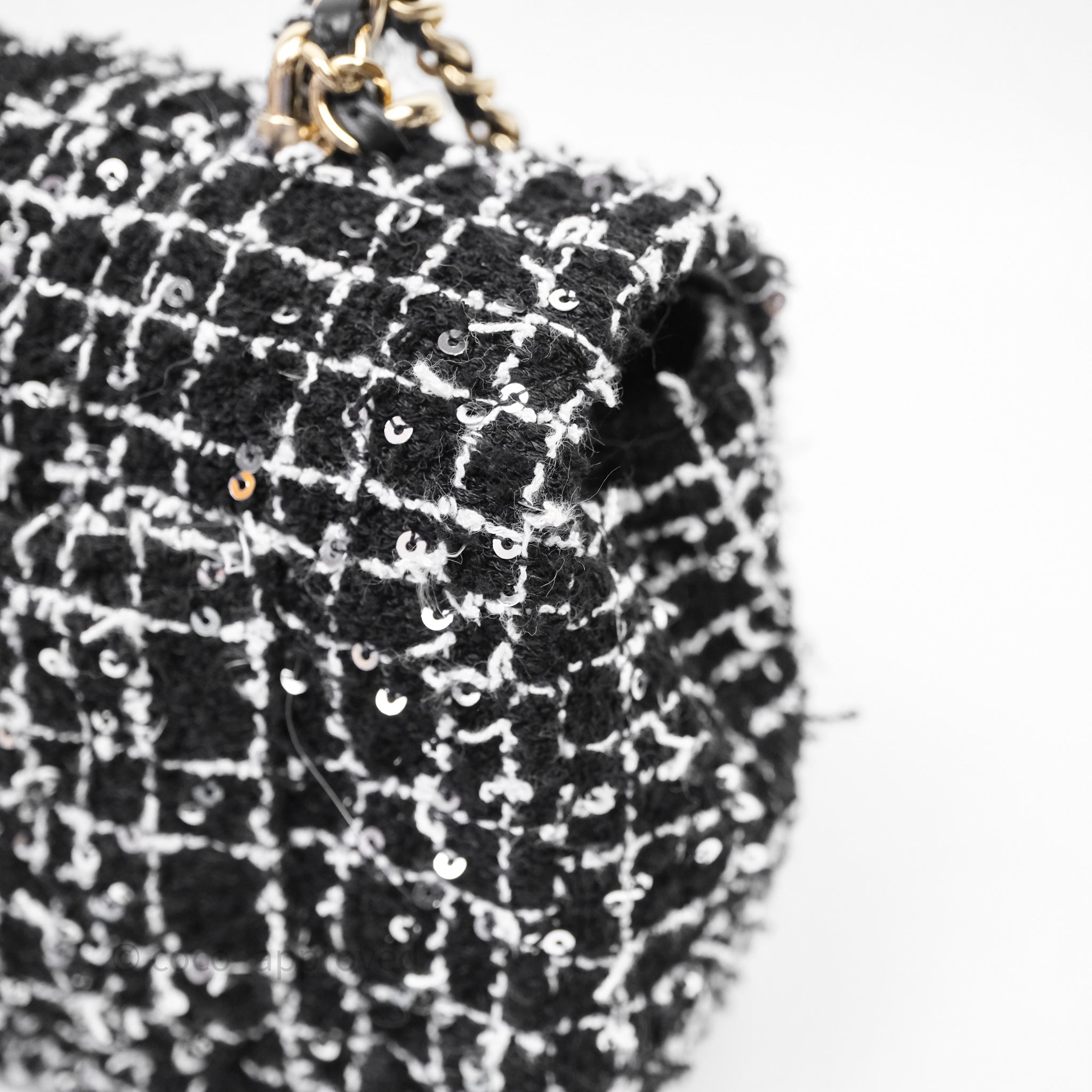 Chanel Top Handle Mini Rectangular Flap Black/ White Sequin Tweed Gold Hardware