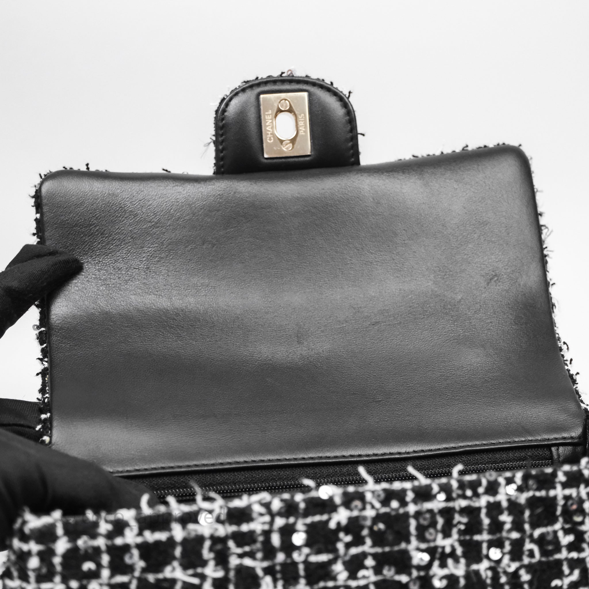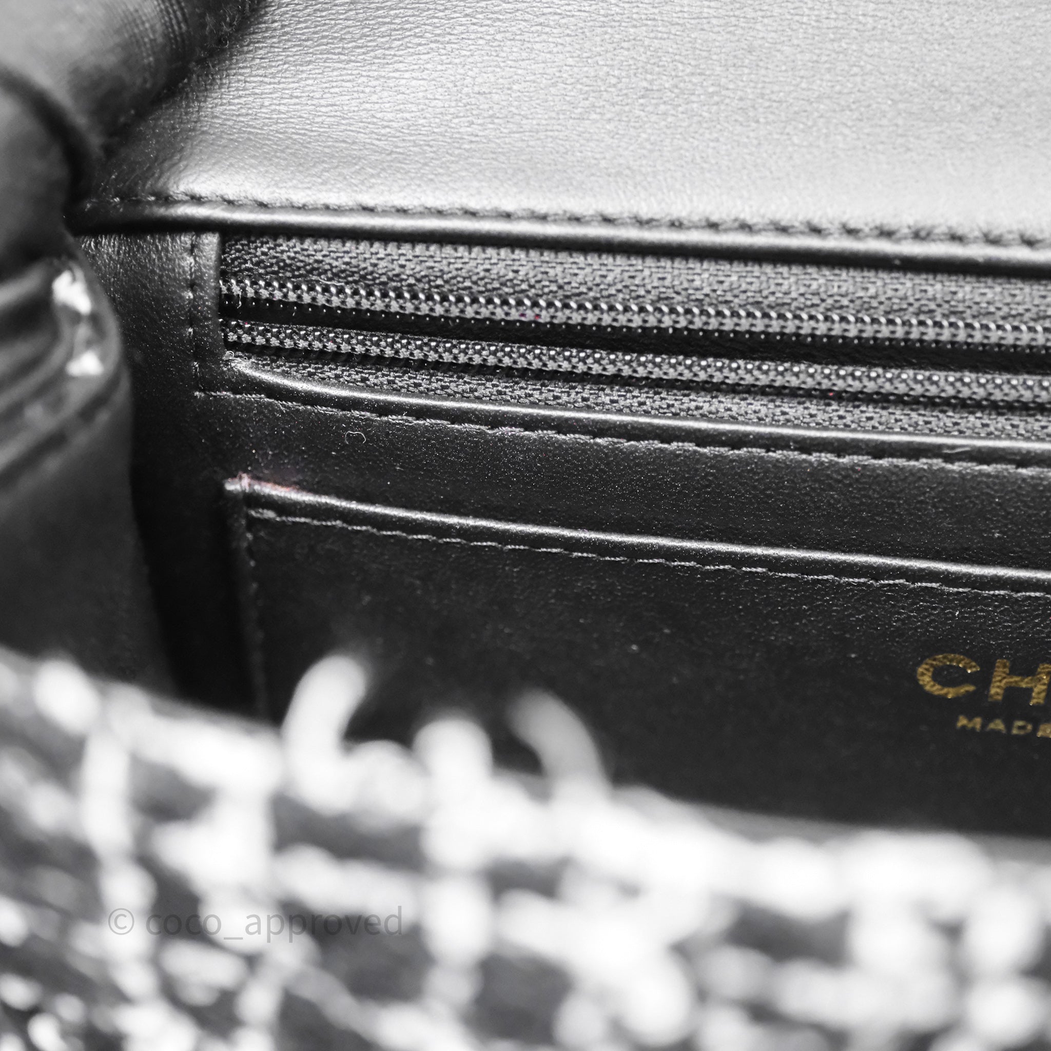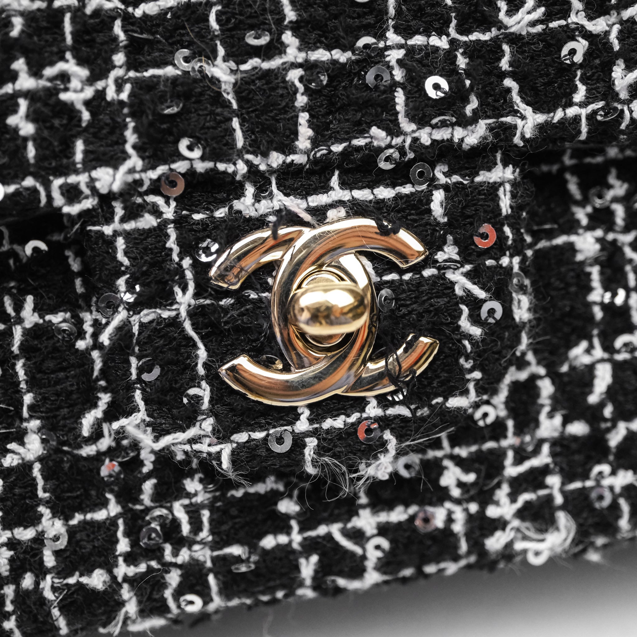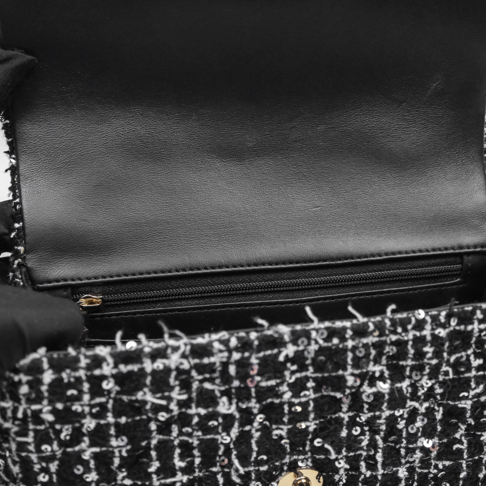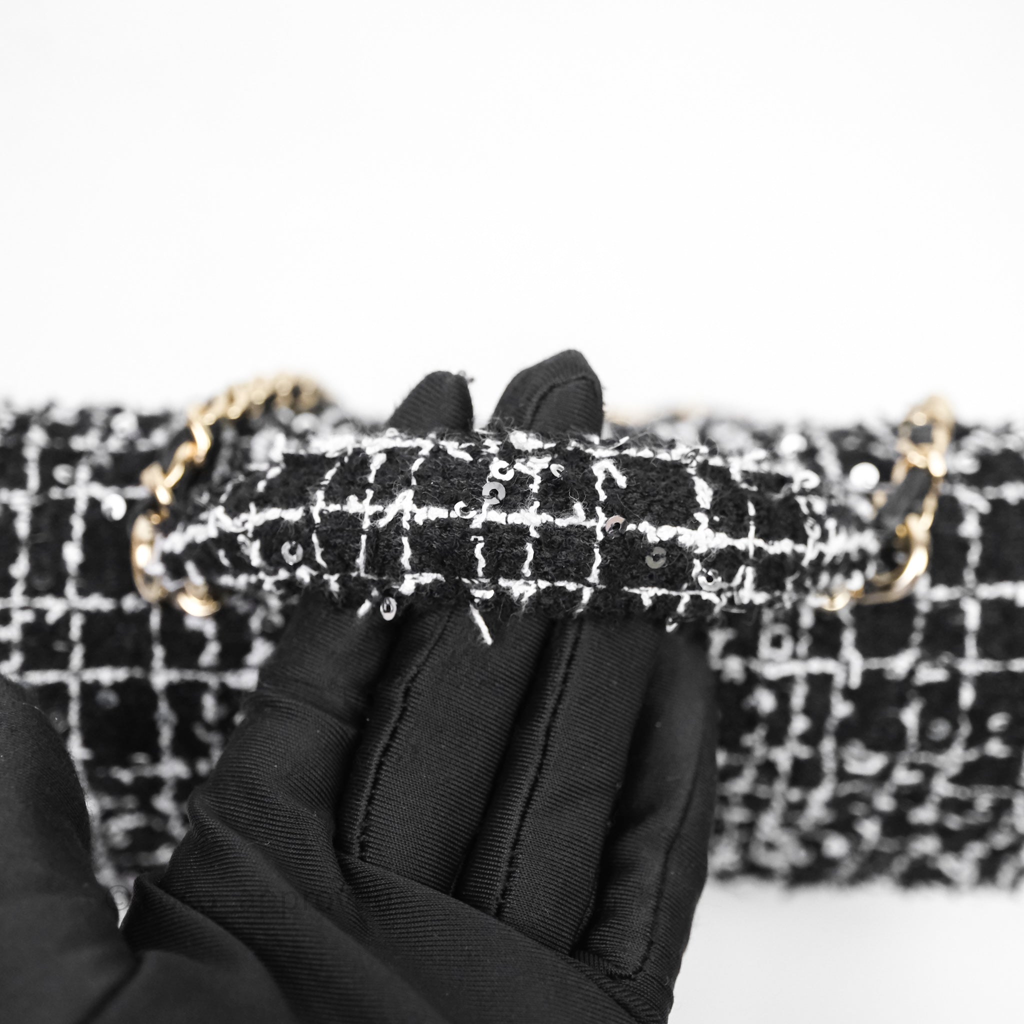 Chanel Top Handle Mini Rectangular Flap Black/ White Sequin Tweed Gold Hardware