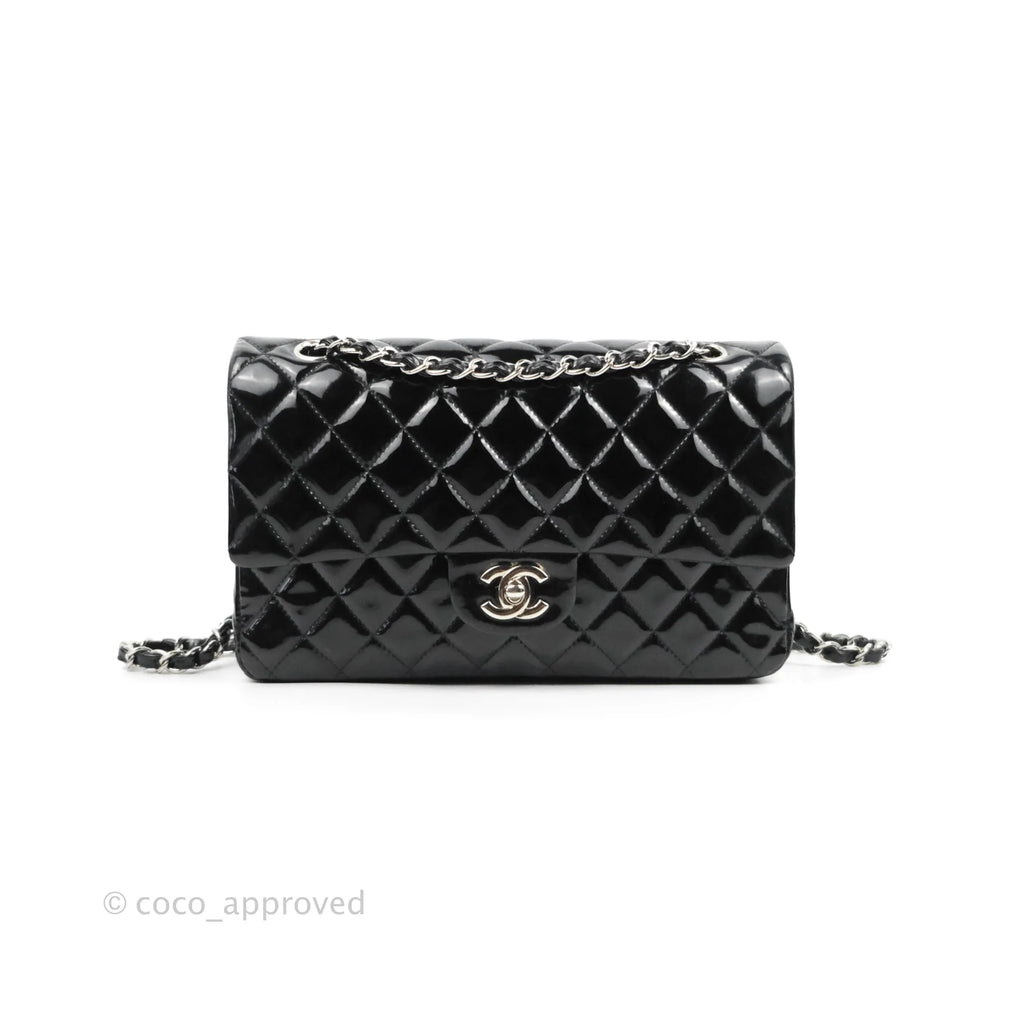 Chanel Classic Quilted M/L Medium Double Flap Black Patent Silver Hardware