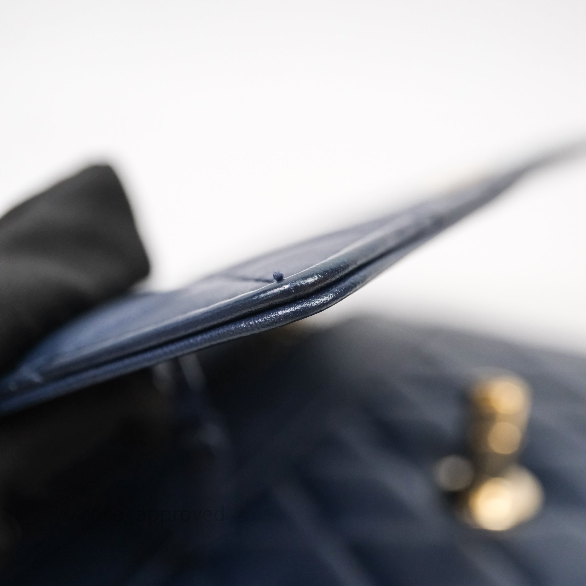 9.3/10 excellent condition. Dent on back and under flap. Hairlines on hardware. Rubbing on rims and strap. Scratches and marks on under flap and in interior.