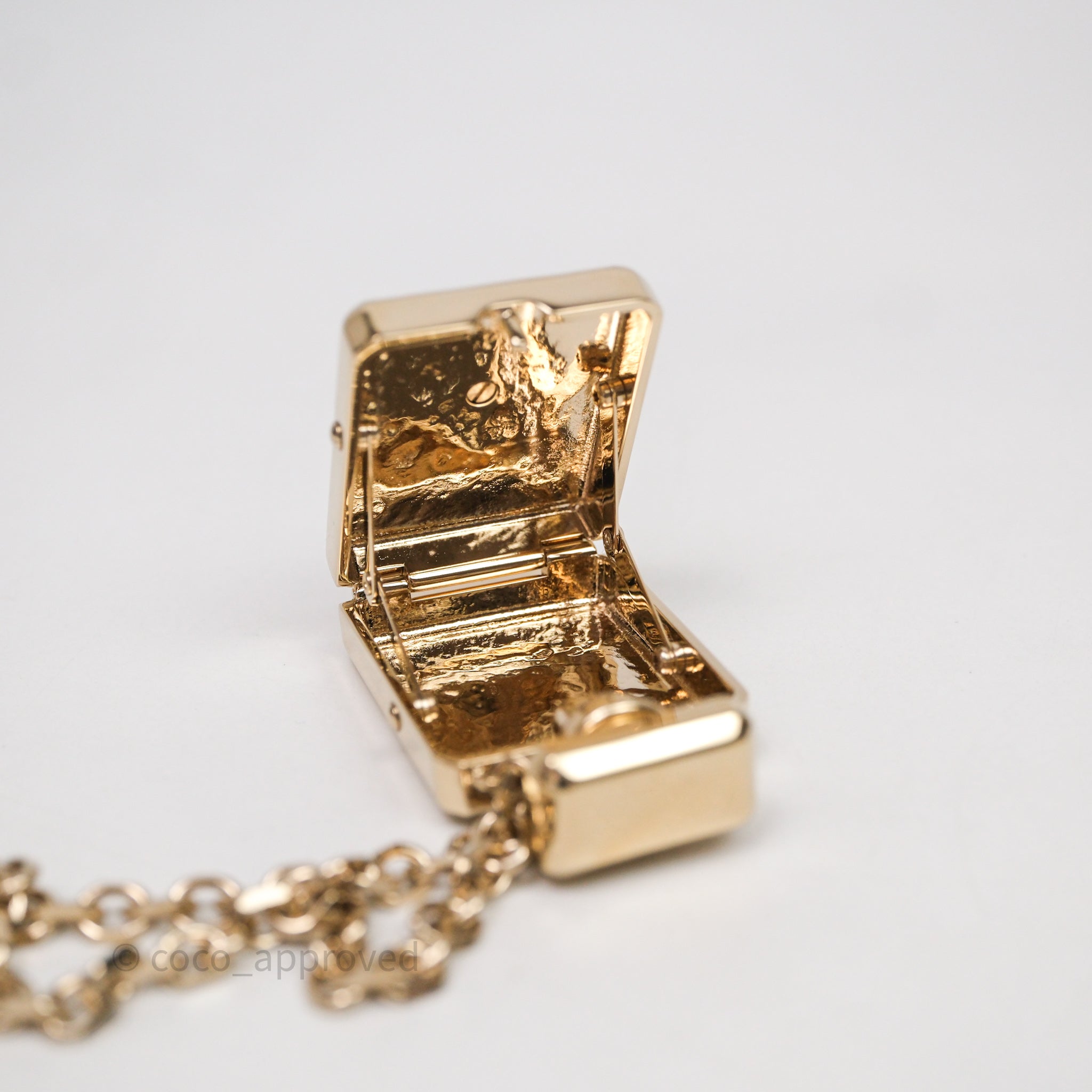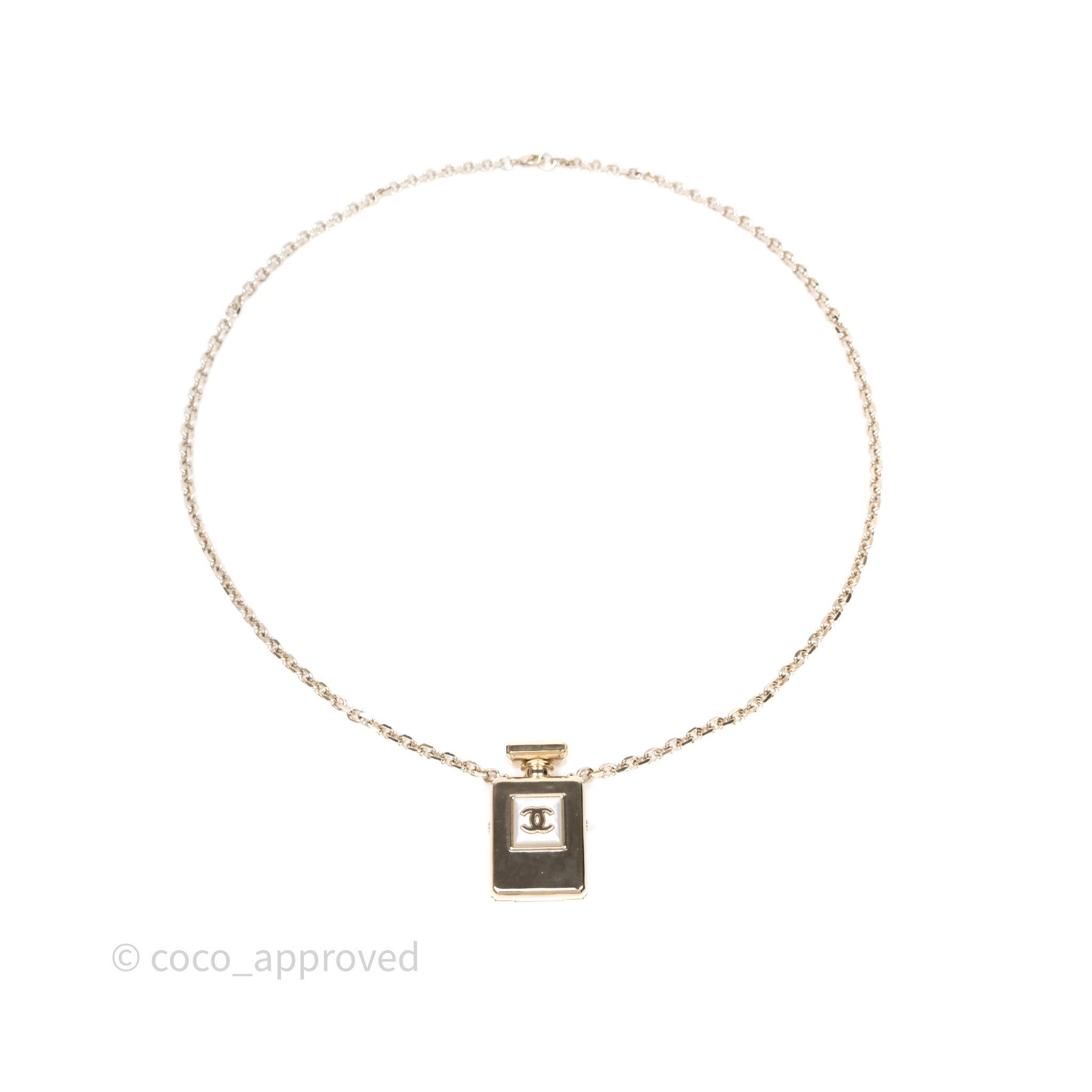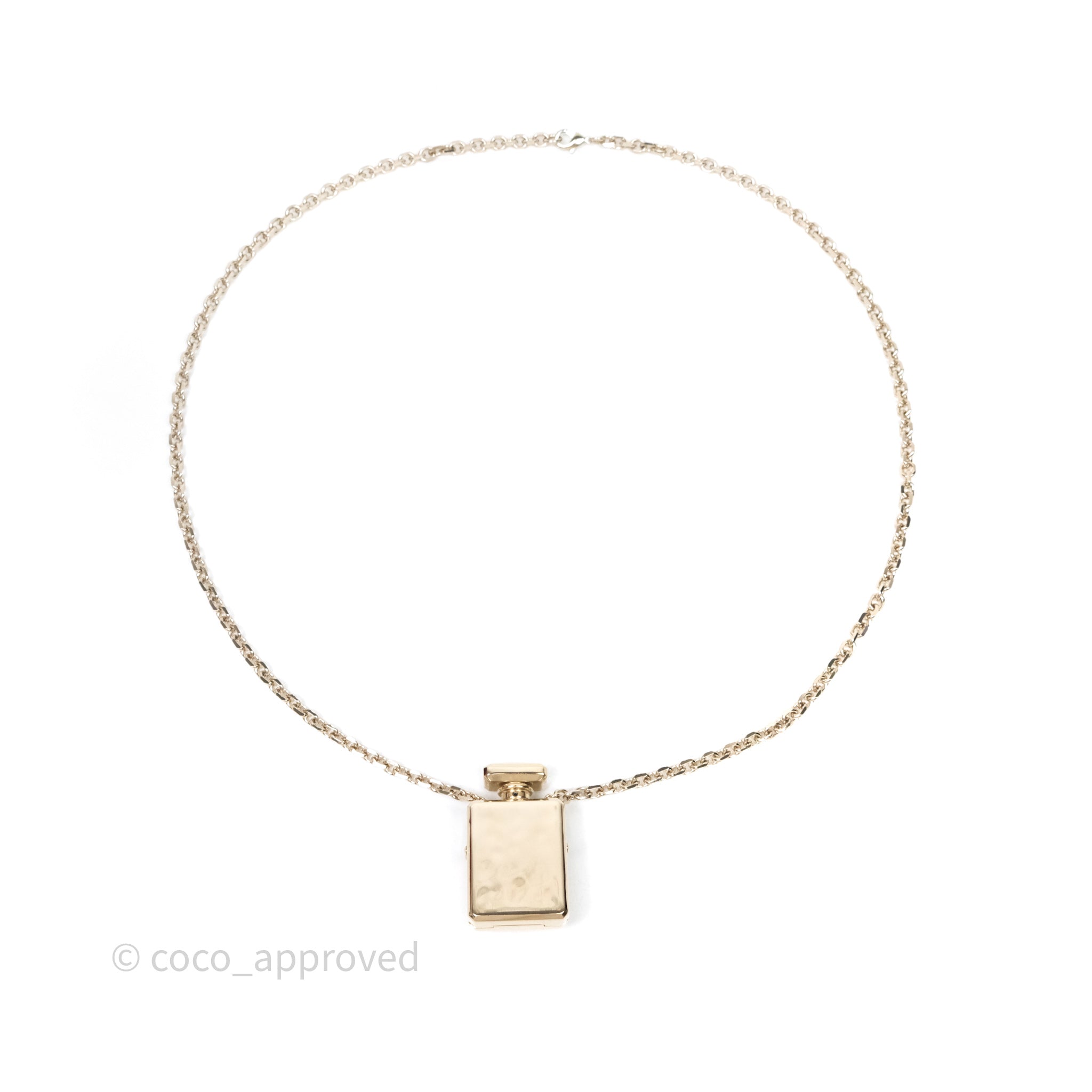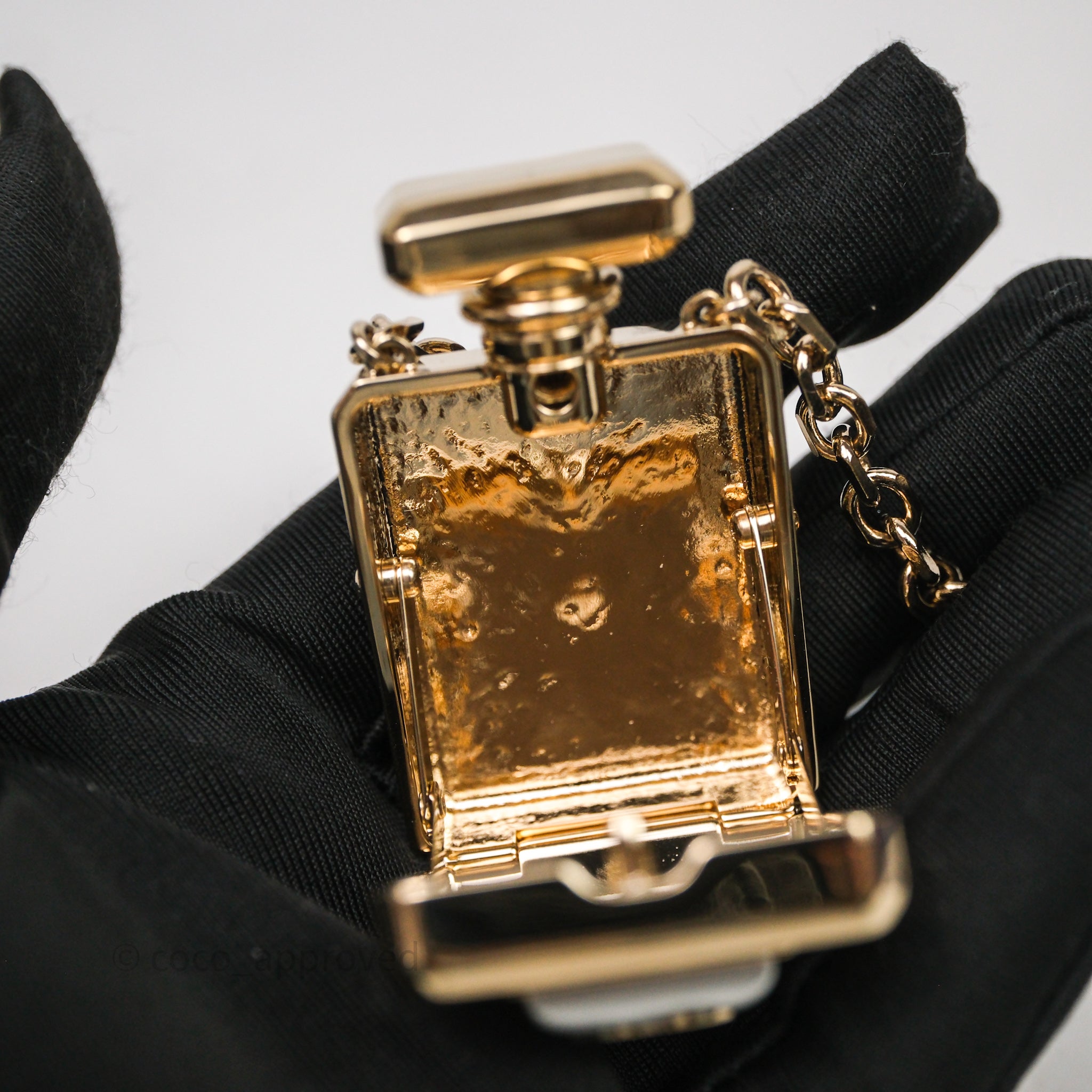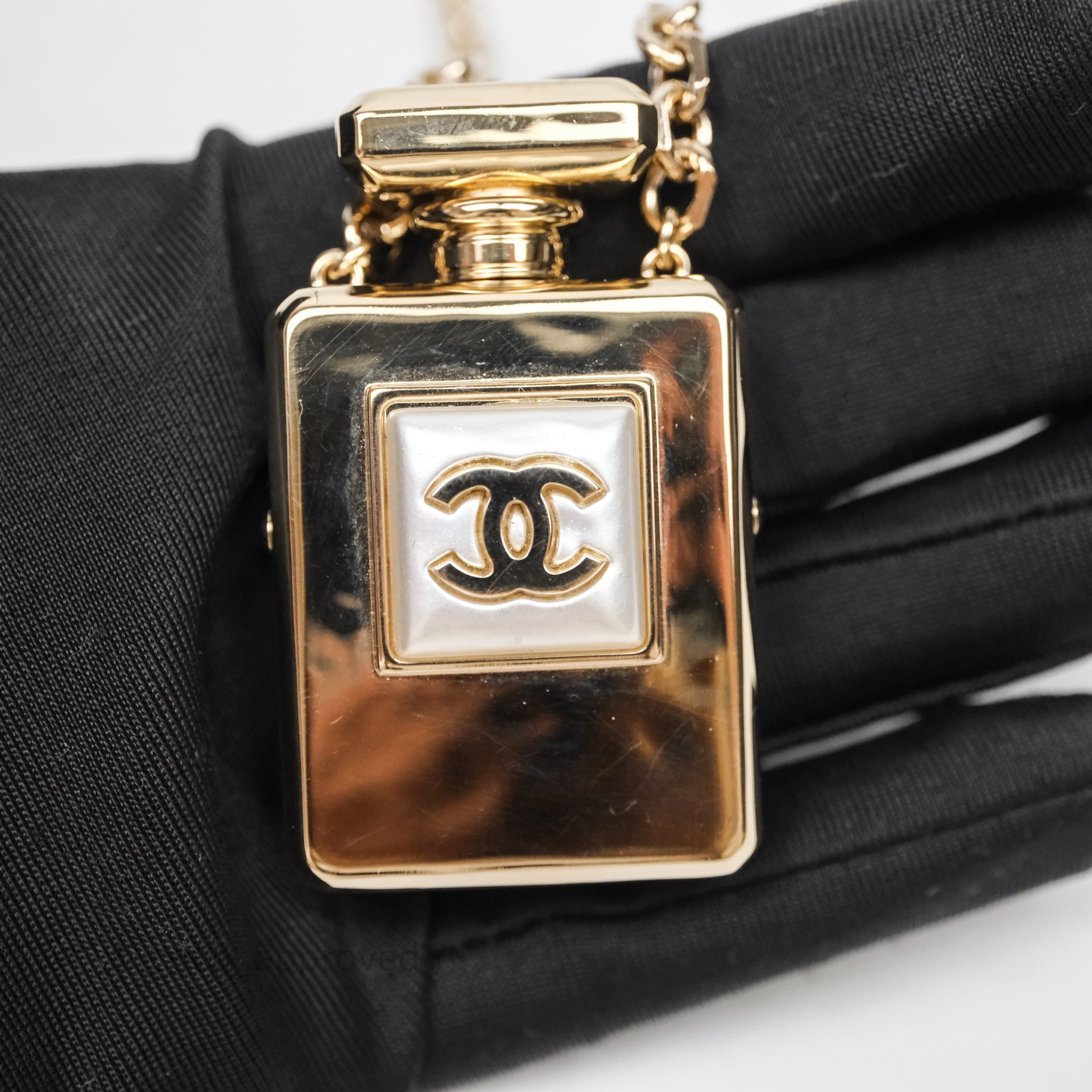 Chanel CC Pearl Perfume Bottle Locket Long Necklace Gold Tone 22S