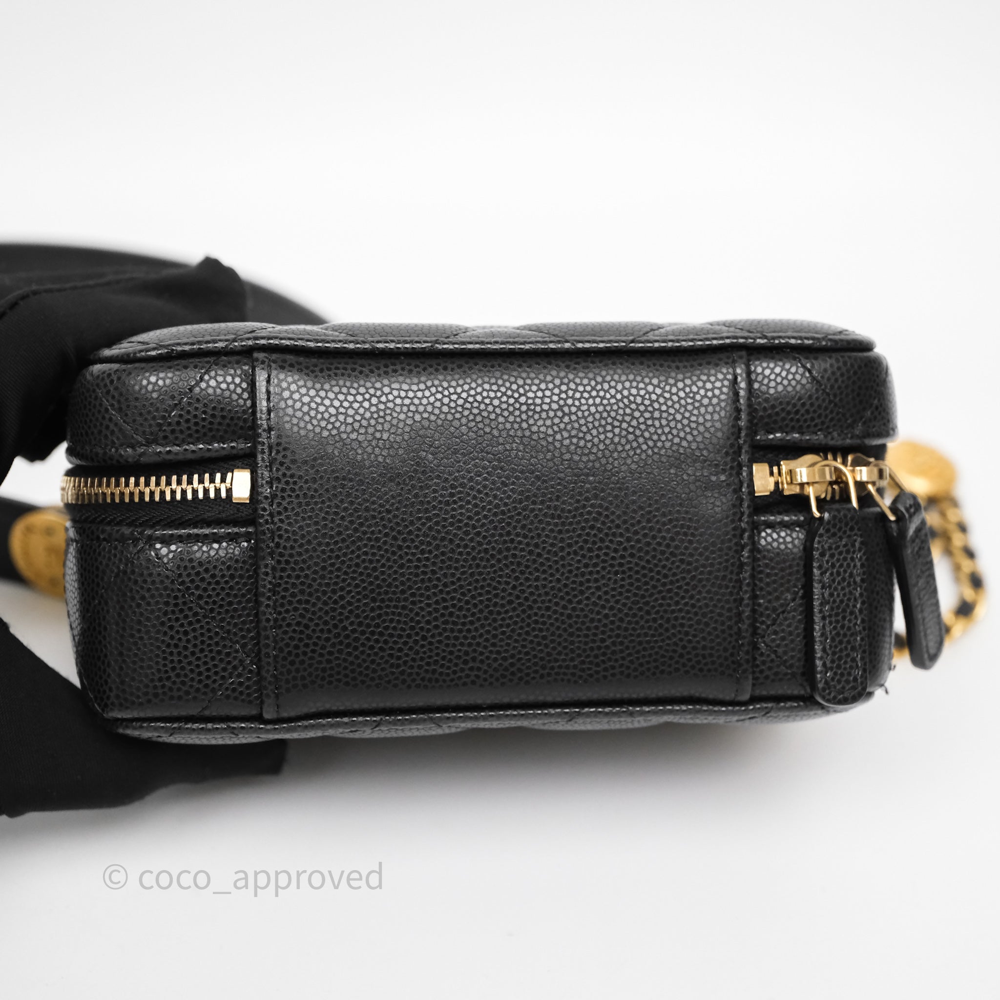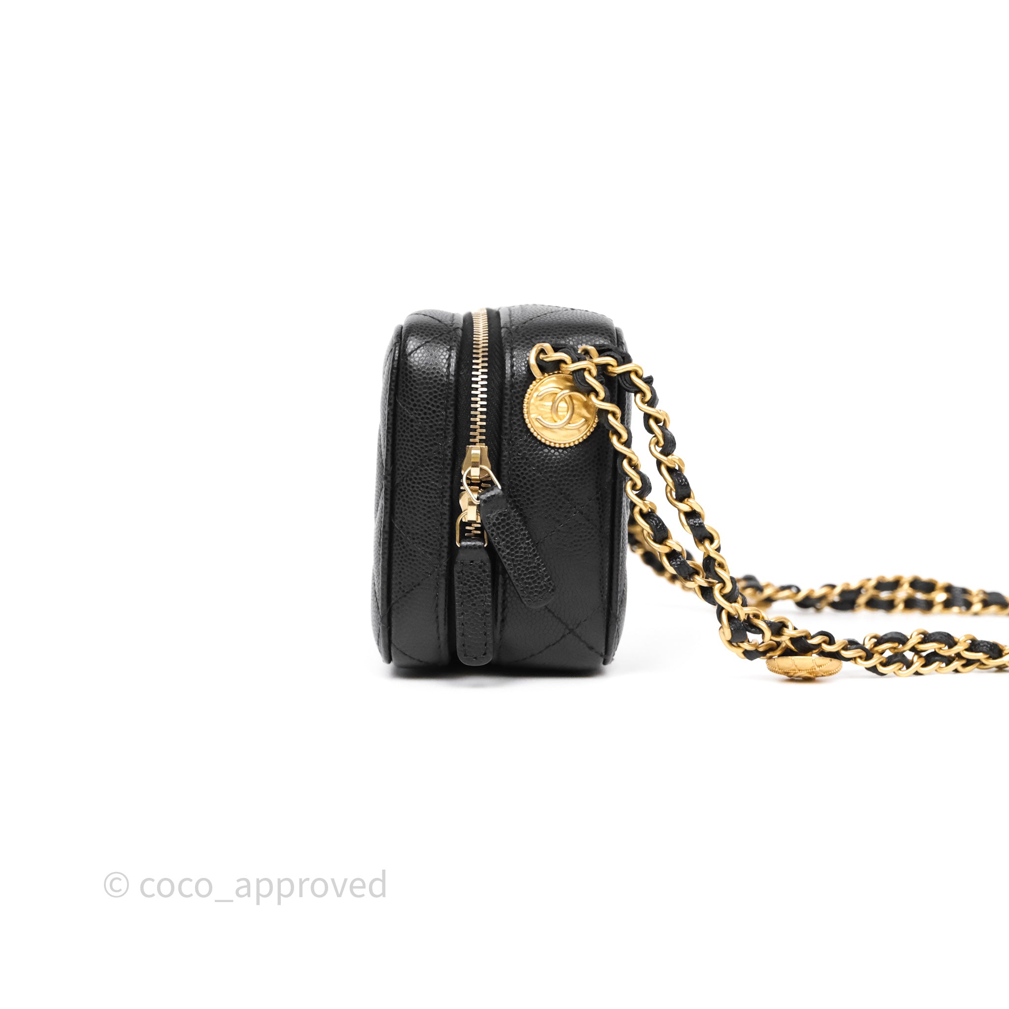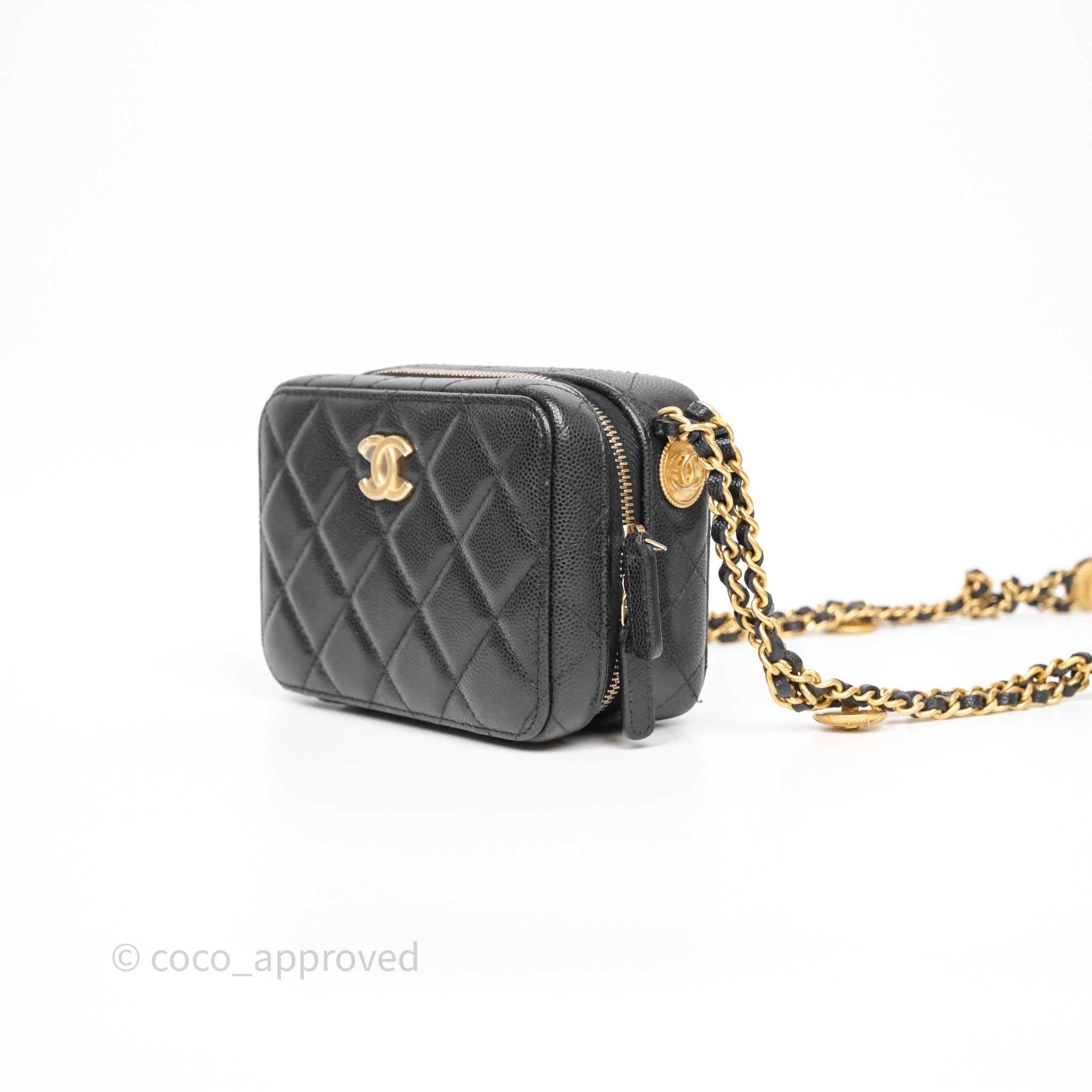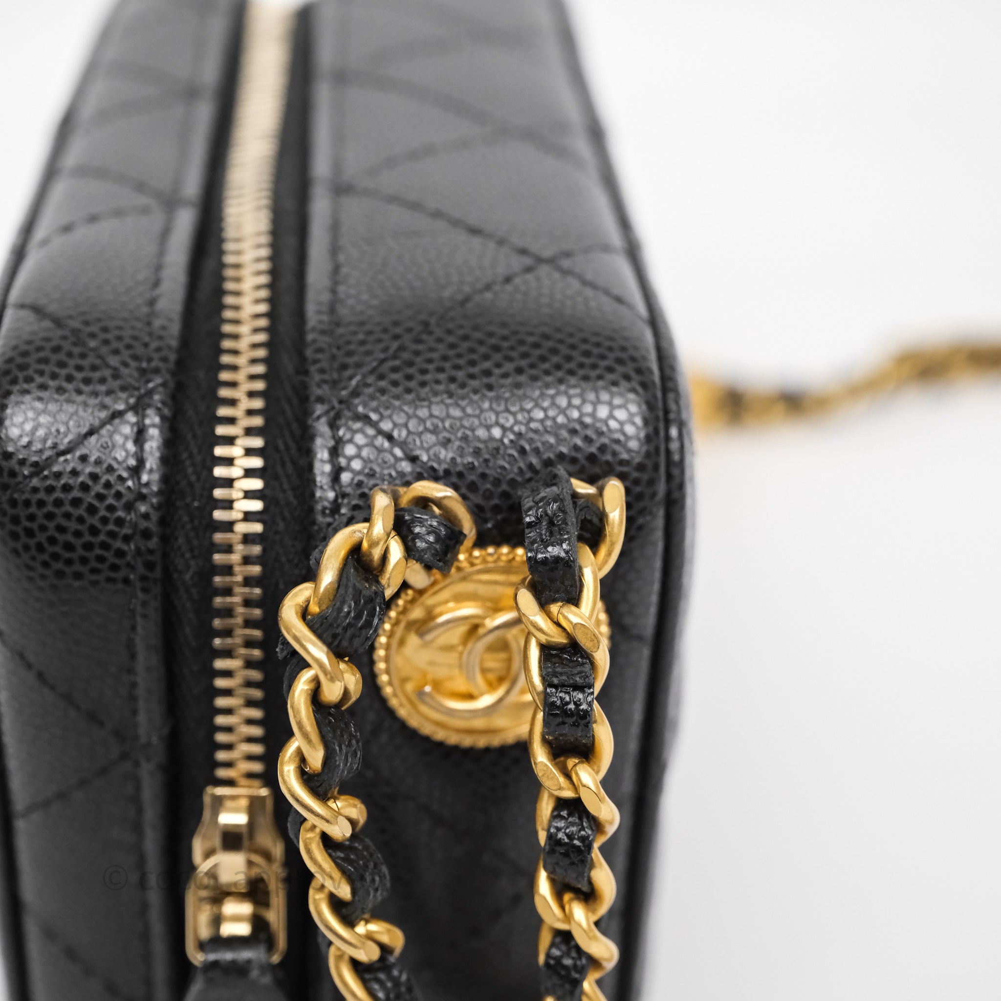 Chanel Quilted CC Coins Purse Chain Camera Case Black Caviar Aged Gold Hardware