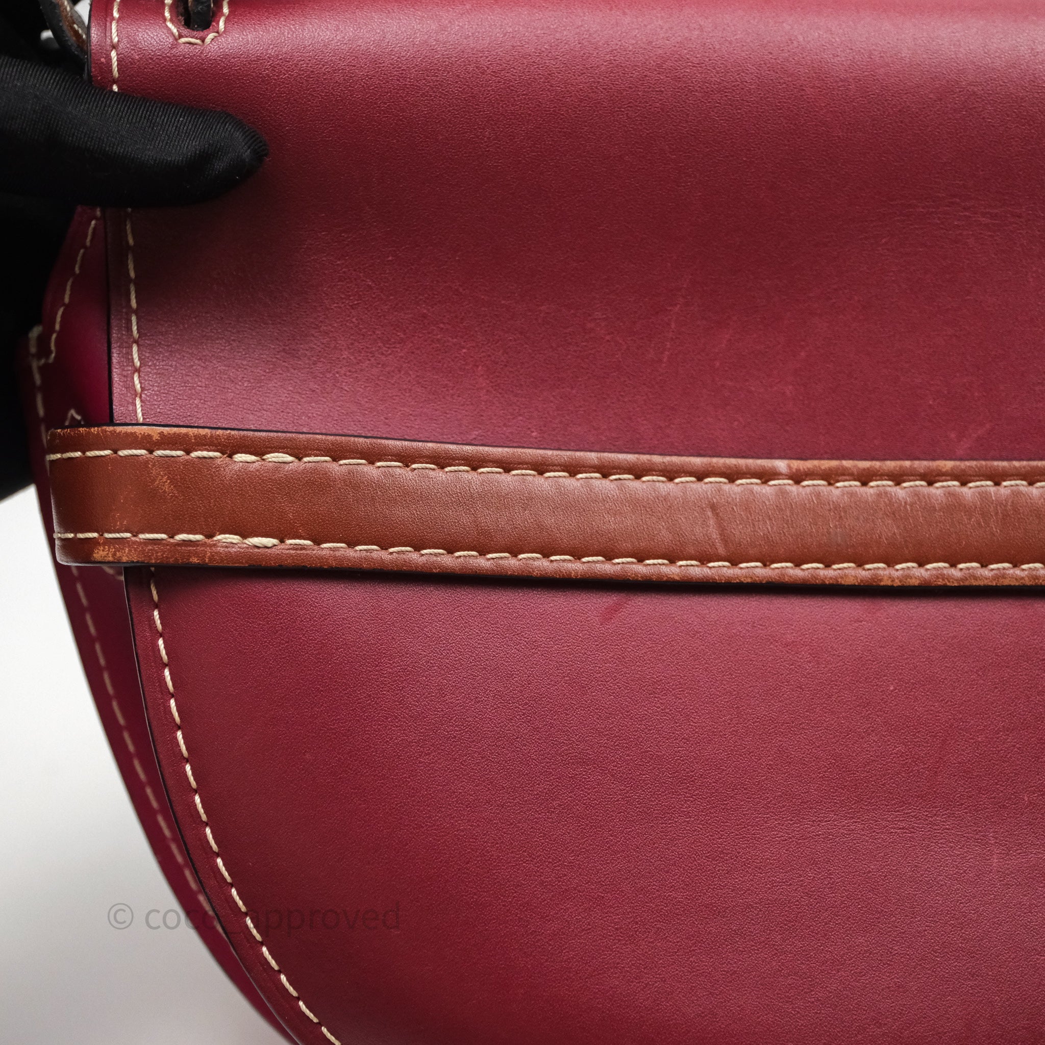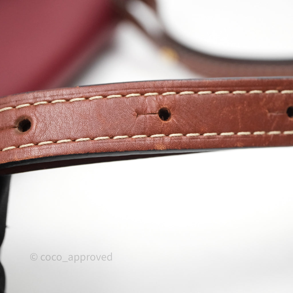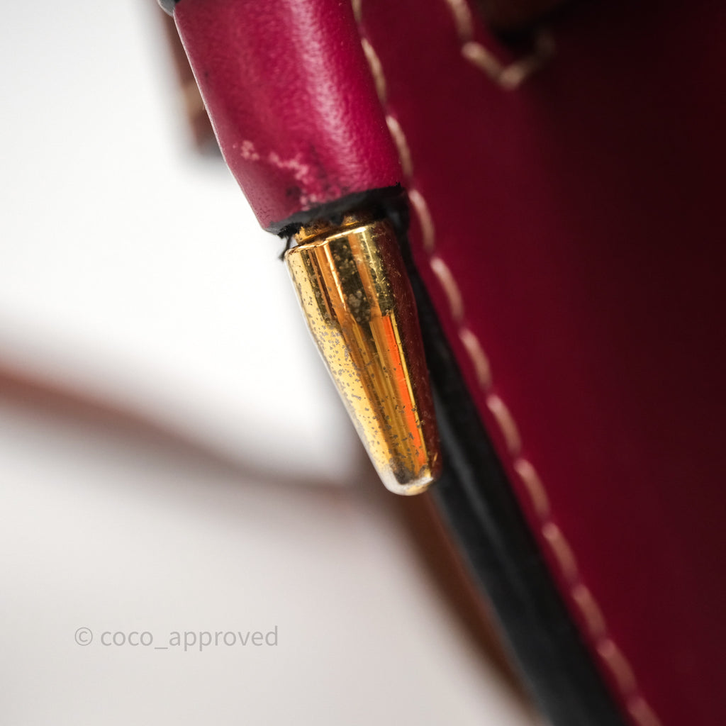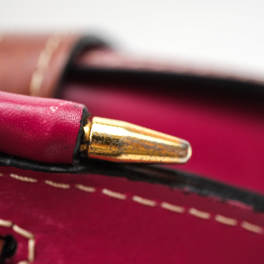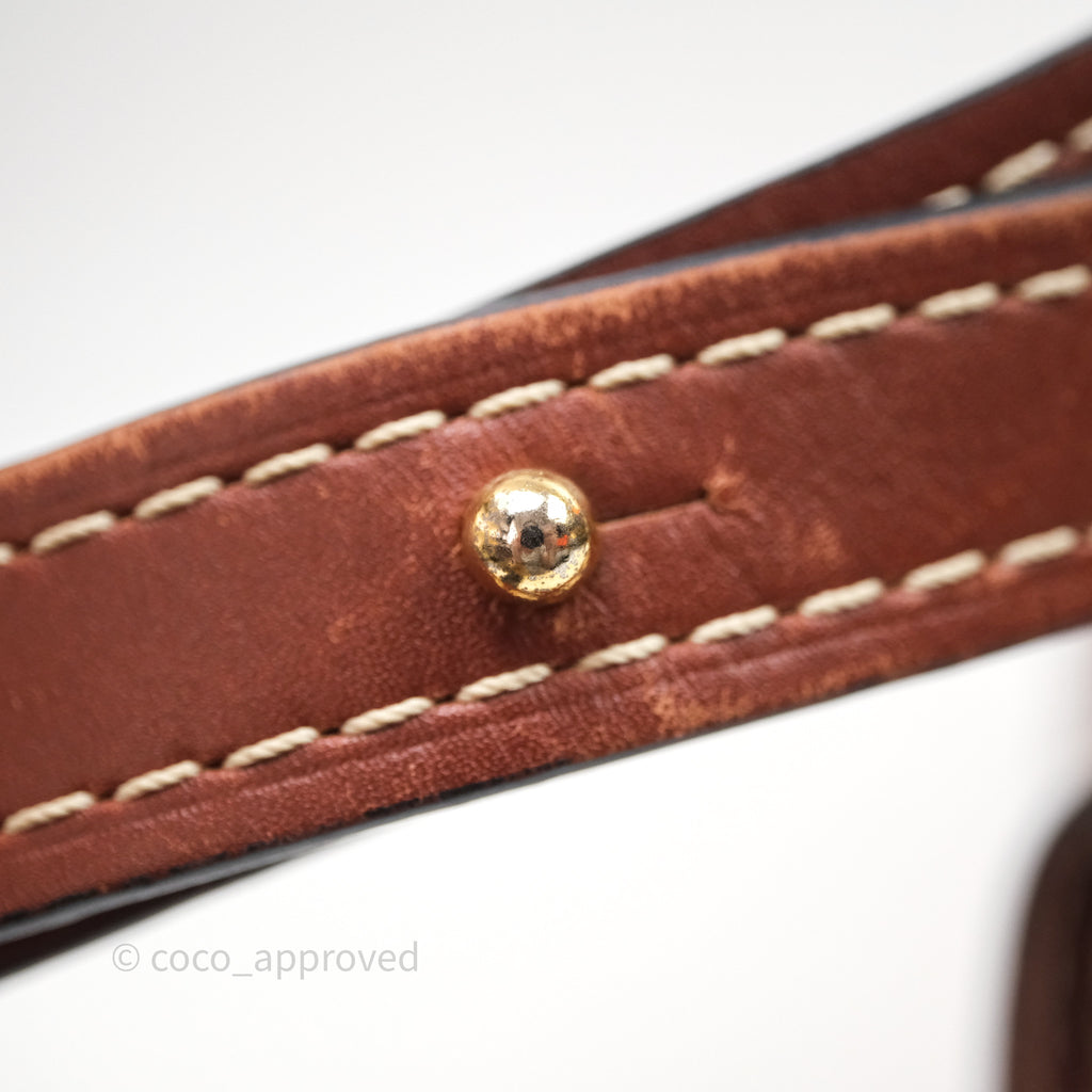 9/10 excellent condition. Hairline and scratches on surface, straps, left and right. Oxidized on hardware. Marks on interior .